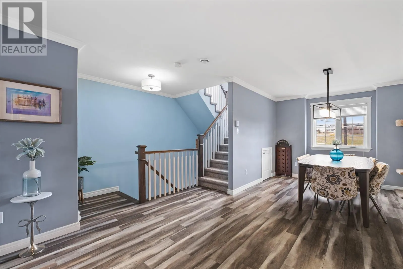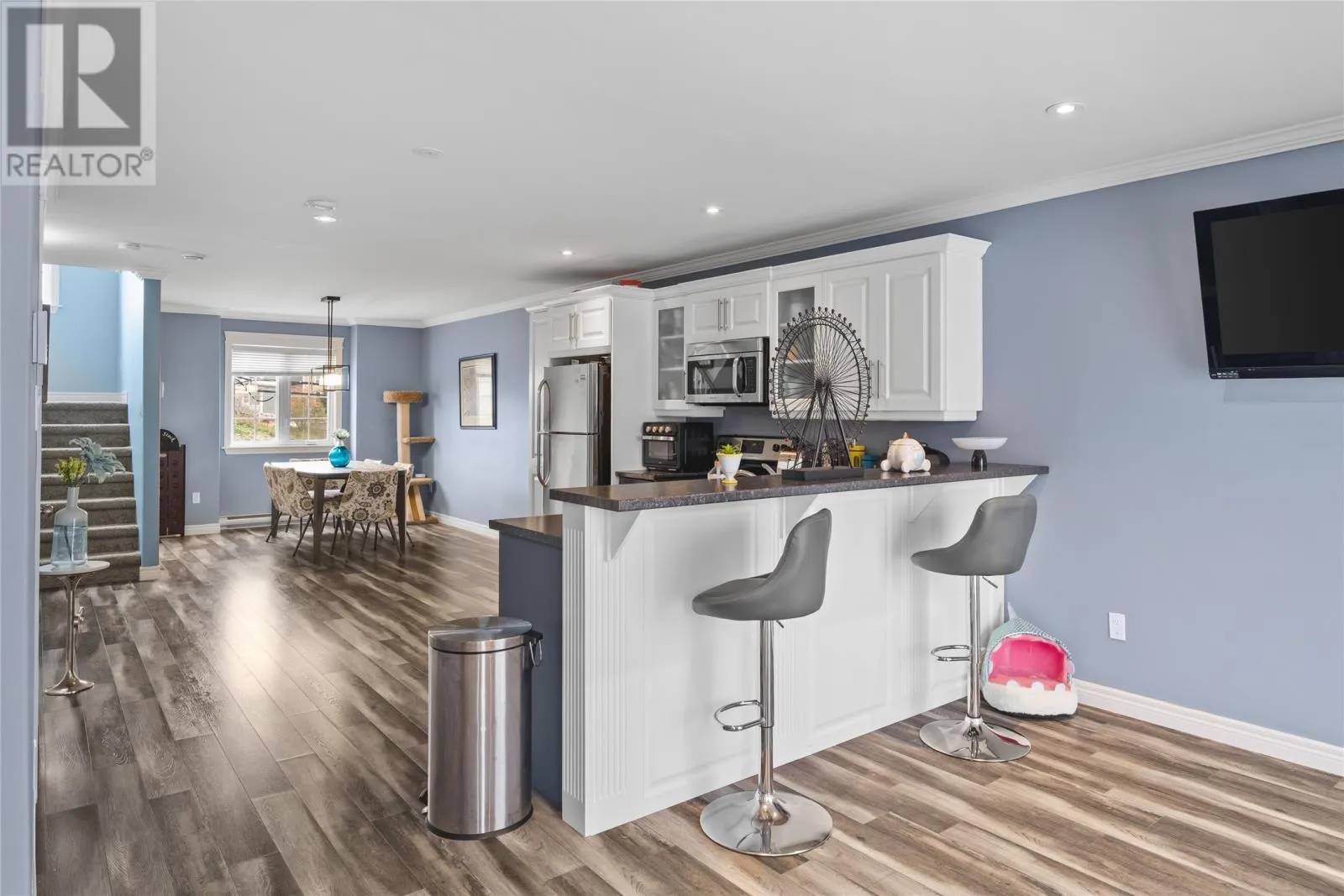 Welcome to this beautiful jelly-bean row style townhouse, ideally situated in the heart of the city! Enjoy an unbeatable location just minutes from Memorial University, Avalon Mall, St. Johnâs Farmers Market, Old Dublin Bakery, local grocery stores, and the downtown core â everything you need right at your doorstep. Step through the welcoming foyer into the ground level, featuring a full-sized garage, versatile bedroom or office space, and a mudroom with an oversized closet at the rear â perfect for everyday organization. Designed with family living and entertaining in mind, the main level showcases an open-concept floor plan with a custom kitchen complete with stainless steel appliances, a bright living room with patio doors leading to the deck, a dining area and a 2-piece powder and laundry room. Thoughtful custom millwork and pot lighting add warmth and sophistication throughout. Upstairs, youâll find three generous bedrooms, including a primary bedroom with ensuite bath and oversized closet, plus a spacious main bathroom. This property is part of a well-maintained condominium community with an approximate monthly condo fee of $300, covering lawn maintenance, snow and garbage removal, as well as exterior upkeep including siding, windows, and roof. Recent upgrades (2024) include a brand-new kitchen and flooring, adding even more value and style to this already stunning home. Donât miss your chance to own this turnkey townhouse in one of St. Johnâs most desirable central locations! No conveyance of offers until Monday, November 10, 2025 @ 3:00pm and left open for acceptance until 6:00pm the same day. *Also listed as a condominium MLS#1292389 (id:27476)