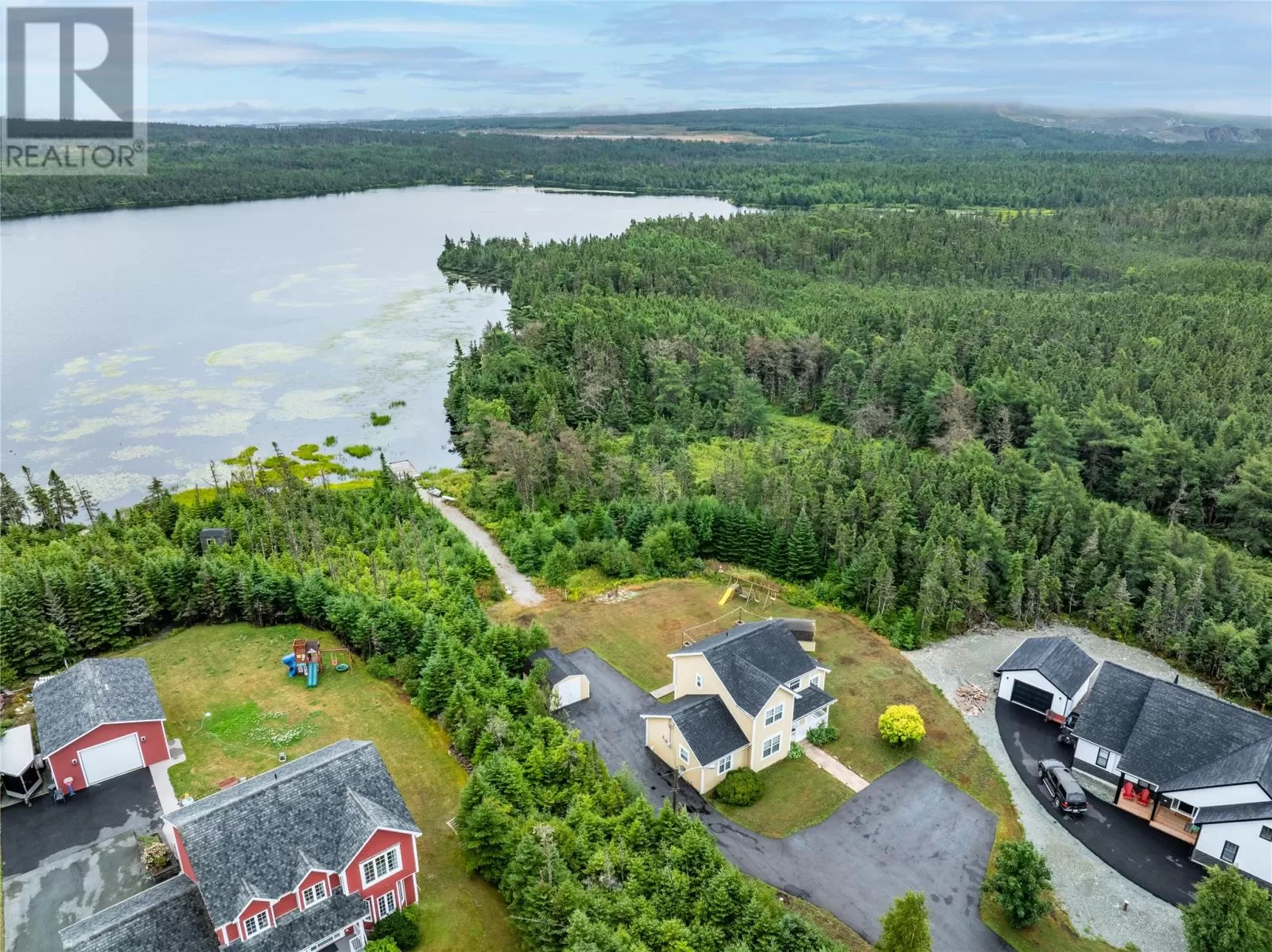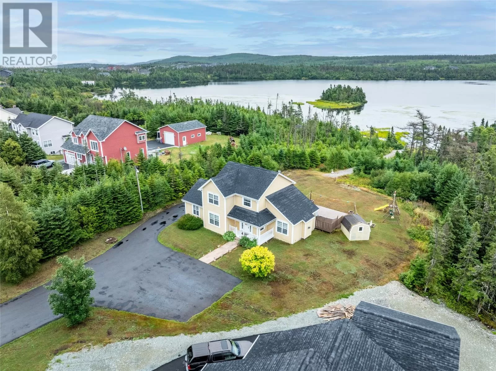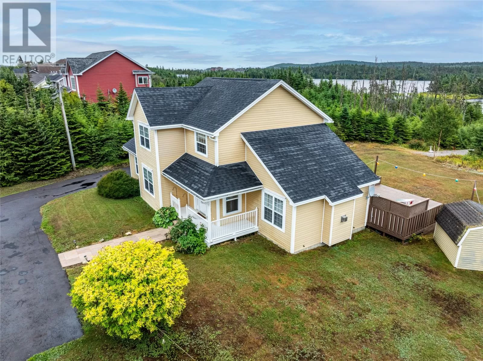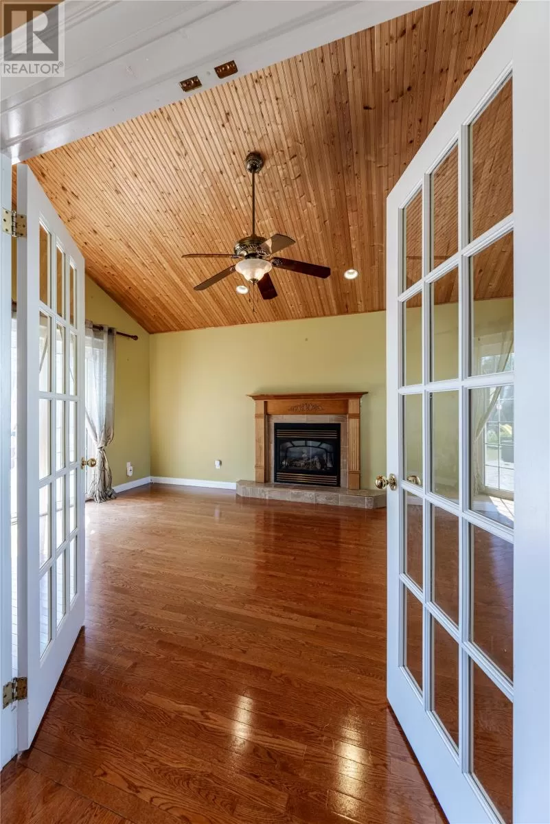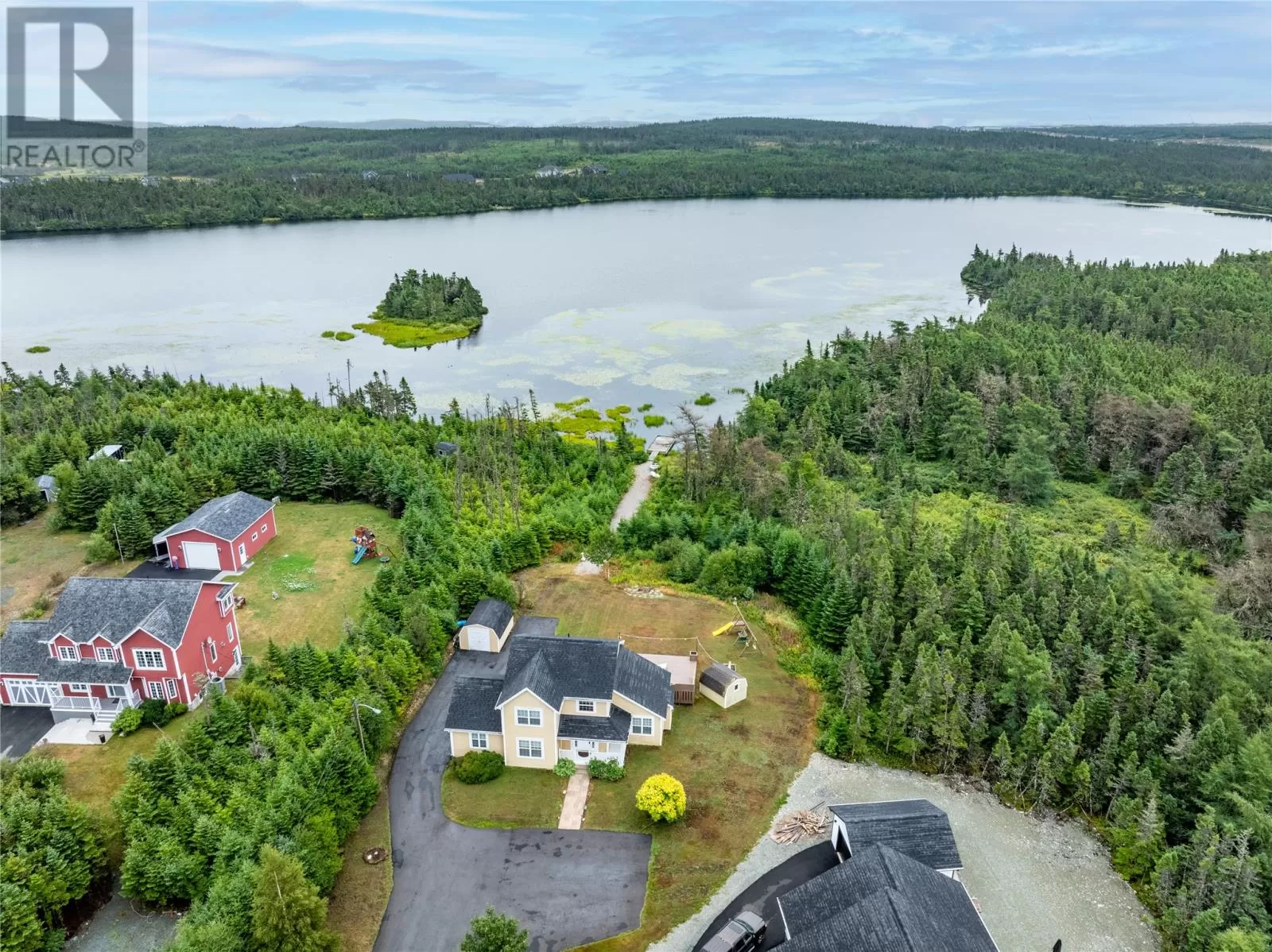 Enjoy Country Living Without the Commute! Surrounded by nature in one of Torbay's most sought after subdivisions, this custom-built home has been designed to maximize the views and access to Western Island Pond. The main floor family room (with propane fireplace) is warm and inviting with beadboard cathedral ceilings and a patio door leading to the oversized back patio. As you pass through the dining area and kitchen (with solid countertops and tile backsplash), you'll find a generous sized mud-room with extra storage capacity and laundry. The main floor also offers a separate living room and a full bathroom. For those with mobility issues, there is the added bonus of a main floor bedroom! This room also functions well as a guest room or home office. Hardwood stairs lead to the second level where you'll find 3 more bedrooms and the family bath complete with corner shower plus a whirlpool tub. Good mornings come easy when waking to your own private view of the pond from your bedroom balcony! The primary bedroom also features a walk-in closet. There is in-floor radiant heating throughout the main level. Outside you'll find two storage sheds, plenty of paved parking for multiple vehicles, and the most peaceful path to your own floating dock! Stainless steel appliances, washer & dryer are included. Roof shingles replaced in 2024. Lots like this don't come up often! Schedule your private viewing today! (id:27476)
