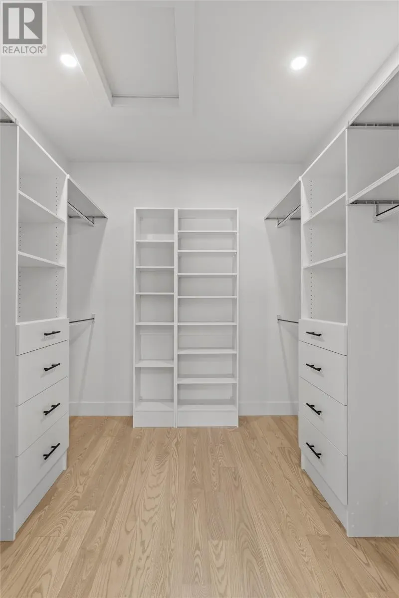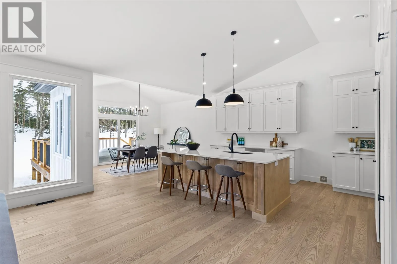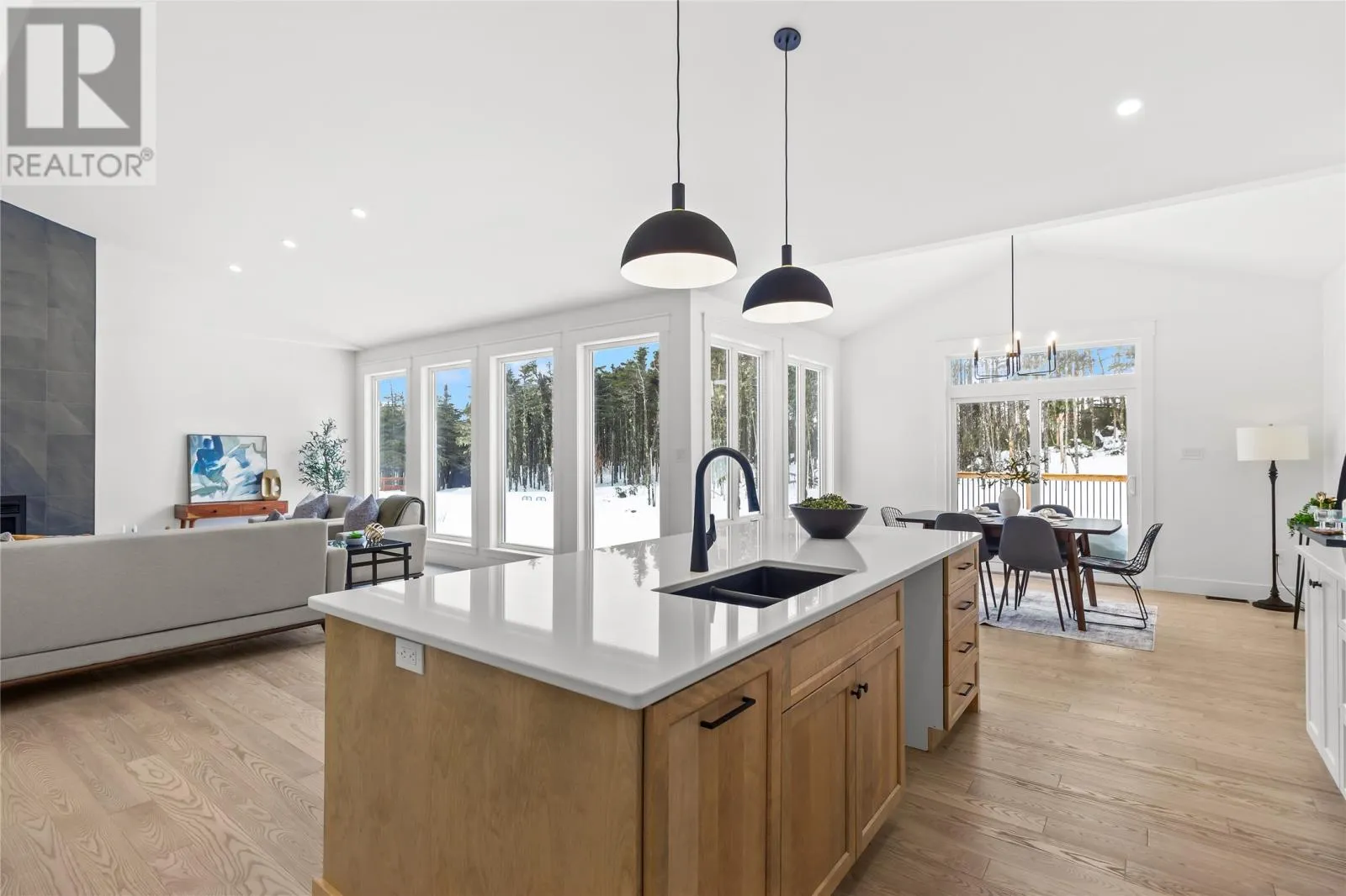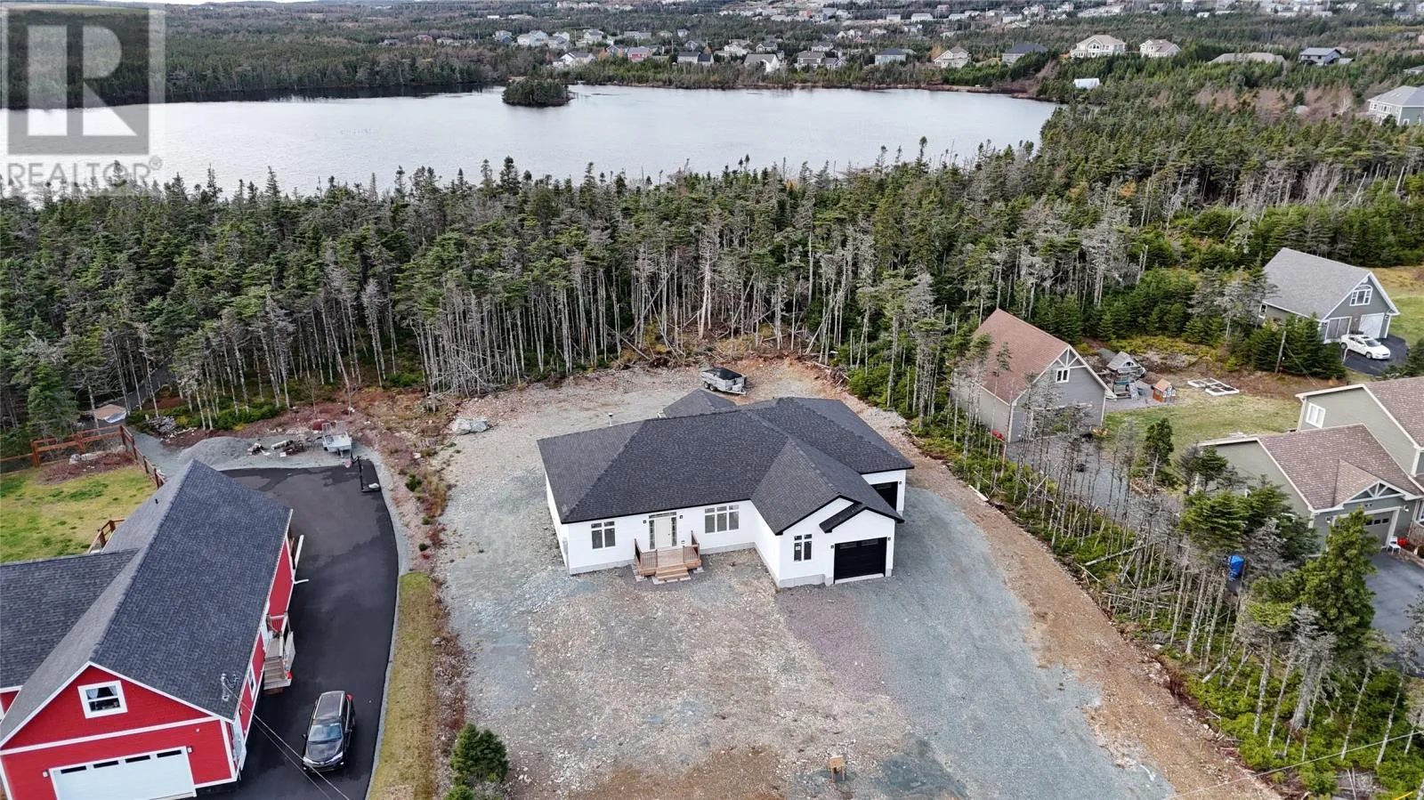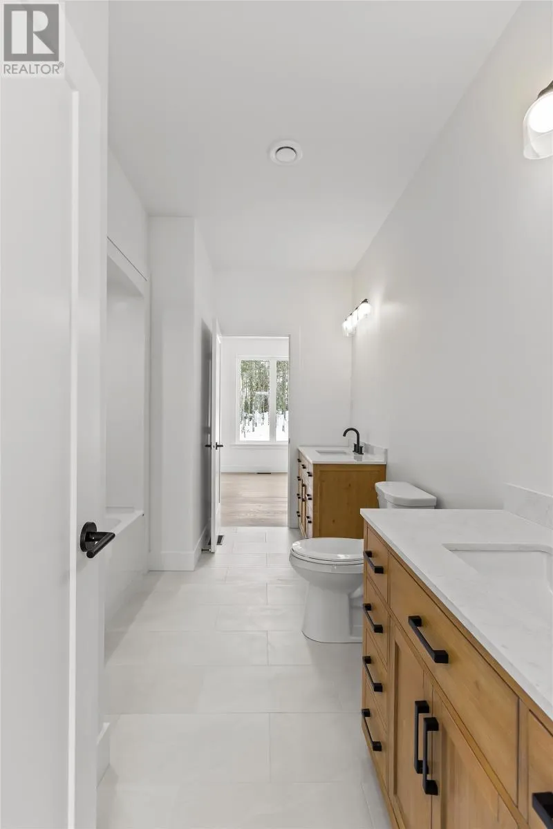 Discover refined country living in this newly completed executive bungalow set on a 1.36-acre lot in sought-after Forest Landing. Backing onto Western Island Pond with rear south-west exposure, few properties offer this level of privacy and scale. Offering 2,600 sqft of living space per level, the layout includes three bedrooms, two and a half bathrooms, and a flex room, plus a 2-door 850sqft attached garage. Step inside and a spacious foyer with frosted French doors leads into the 13-foot vaulted great room filled with natural light. The great room features the custom kitchen, finished with full-height shaker cabinetry, quartz countertops, and an oversized island featuring a warm wood stain with visible grain detail. Matte black hardware and an integrated undermount sink complete a space designed for both everyday use and entertaining. The adjoining dining area features a vaulted ceiling and patio door opening to the rear deck. The living area is anchored by a tiled feature wall with a Regency 36-inch propane fireplace. The functional layout can accommodate larger gatherings while remaining comfortable for quiet evenings at home with family. The primary bedroom offers a private retreat with walk-in closet and spa-inspired ensuite featuring a 48 by 48 tiled shower with rainfall head, frameless glass, double-sink vanity, and soaker tub. Canadian-made ash engineered hardwood flooring throughout the main level, complemented by ceramic tile in wet areas and 9-foot ceilings in secondary rooms. The lower level is framed and ready for future development, with plumbing rough-in in place for a bathroom. Heated by a 2-zone ducted heat pump and supported by upgraded 400-amp underground service with EV charger pre-wired in the attached garage. With full rear access and direct access to pond-side recreation, hiking, and ATV trails, this property offers estate-style living minutes from Stavanger Drive and downtown St. Johnâs. (id:27476)
