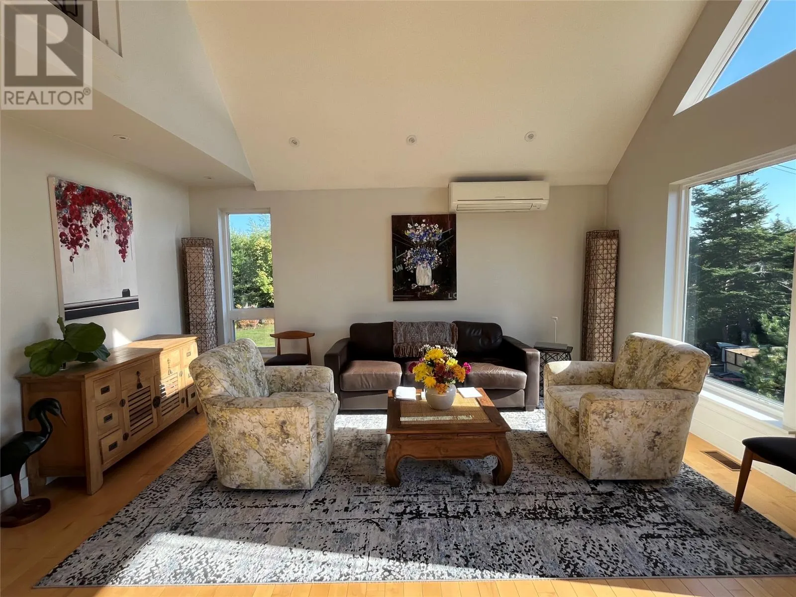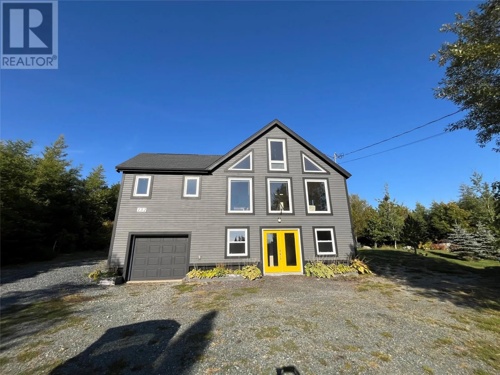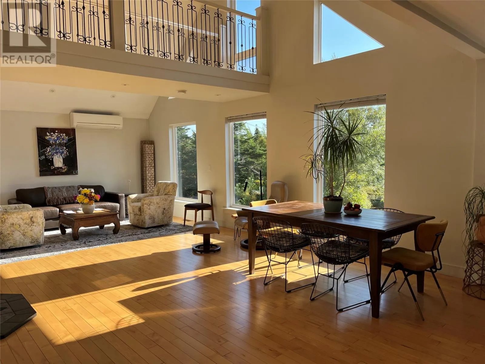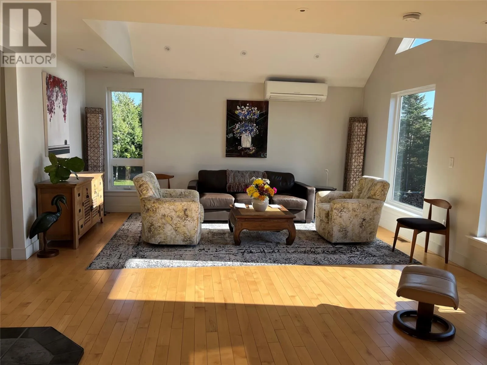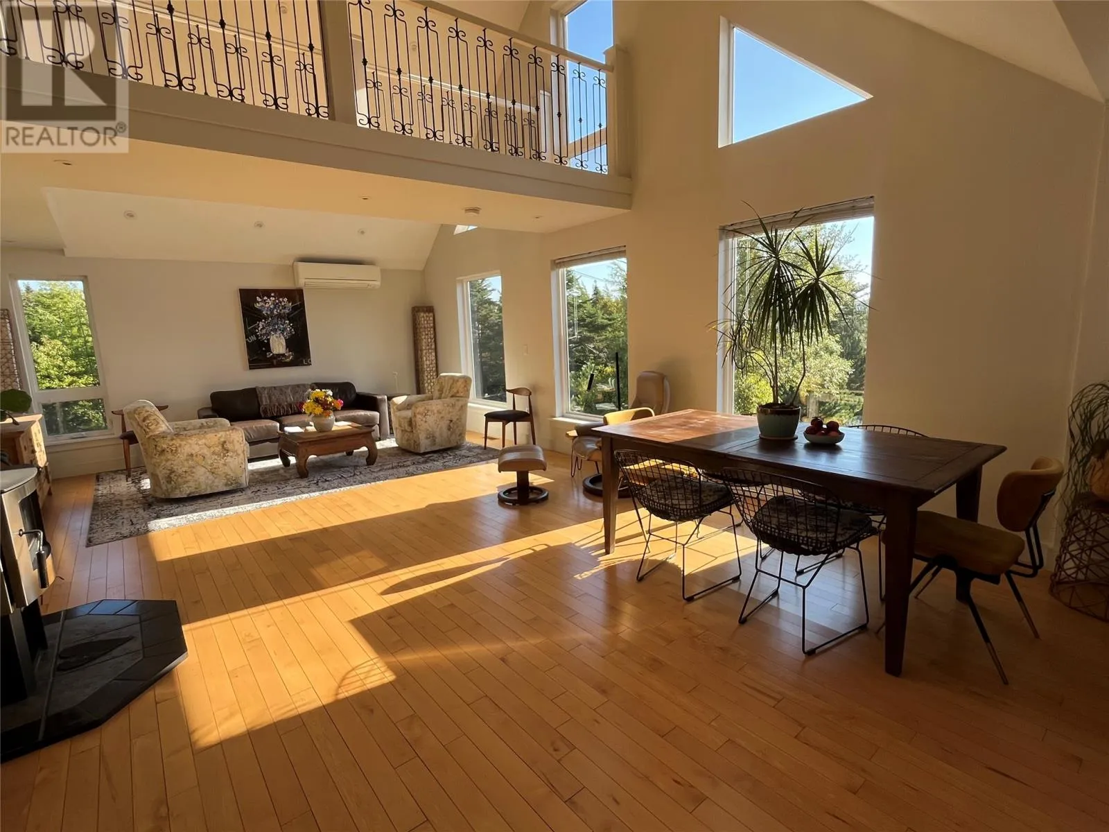 VIEW PROPERTY! PRIVACY GALORE! Spectacular views of Tors cove pond from this adorable A Frame home just 35 minutes from St Johns. This amazing home offers an open concept design main floor, kitchen, dining, and living room area with 16 ft vaulted ceilings and a cosy woodstove for great ambience. Delightful kitchen with modern decor cabinetry /center island, two average sized bedrooms with full bath, as well as main floor laundry. This property is cheerful and bright with an abundance of natural light shining through the oversized windows accentuating local pond views. On the second level, you will find the master bedroom complete with en suite /heated floor and double closets . The lower level has all aboveground windows with a walkout basement where you will find a TV room and a large family room as well as an in-house 13 x 26 garage for storing all those recreational toys or workshop area. This is a meticulously well cared for property with gleaming maple hardwood floors throughout. Lots of attention to detail. This property offers three sources of heat, mini split ,electric furnace as well as a woodstove. New hot water tank . Exterior is spruce clapboard stained with a 3/4 in cavity. New septic in recent years. Just a few minutes off route 10 in beautiful Tors Cove . (id:27476)