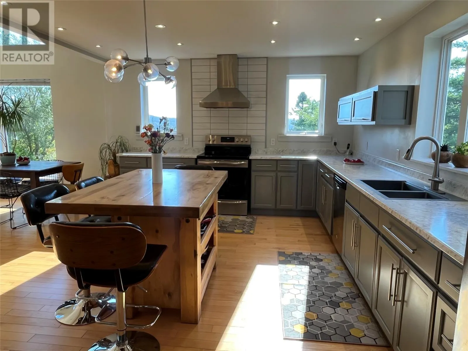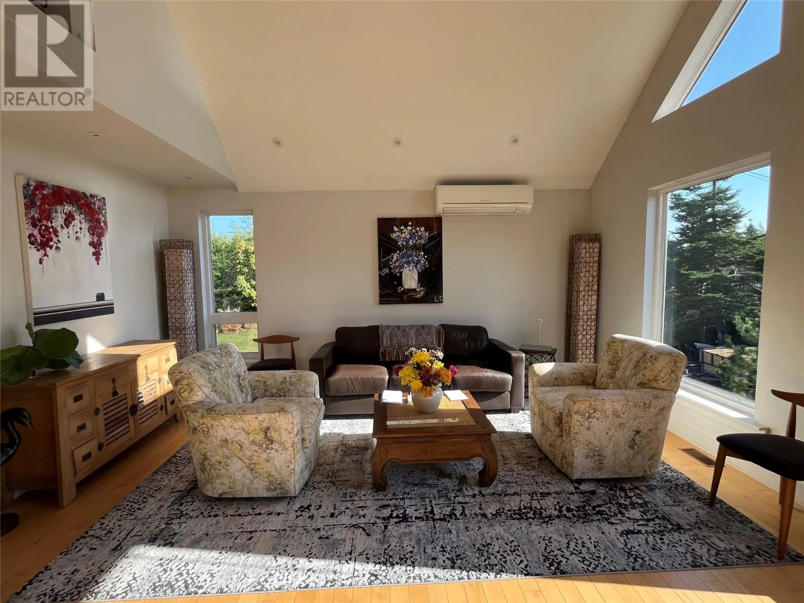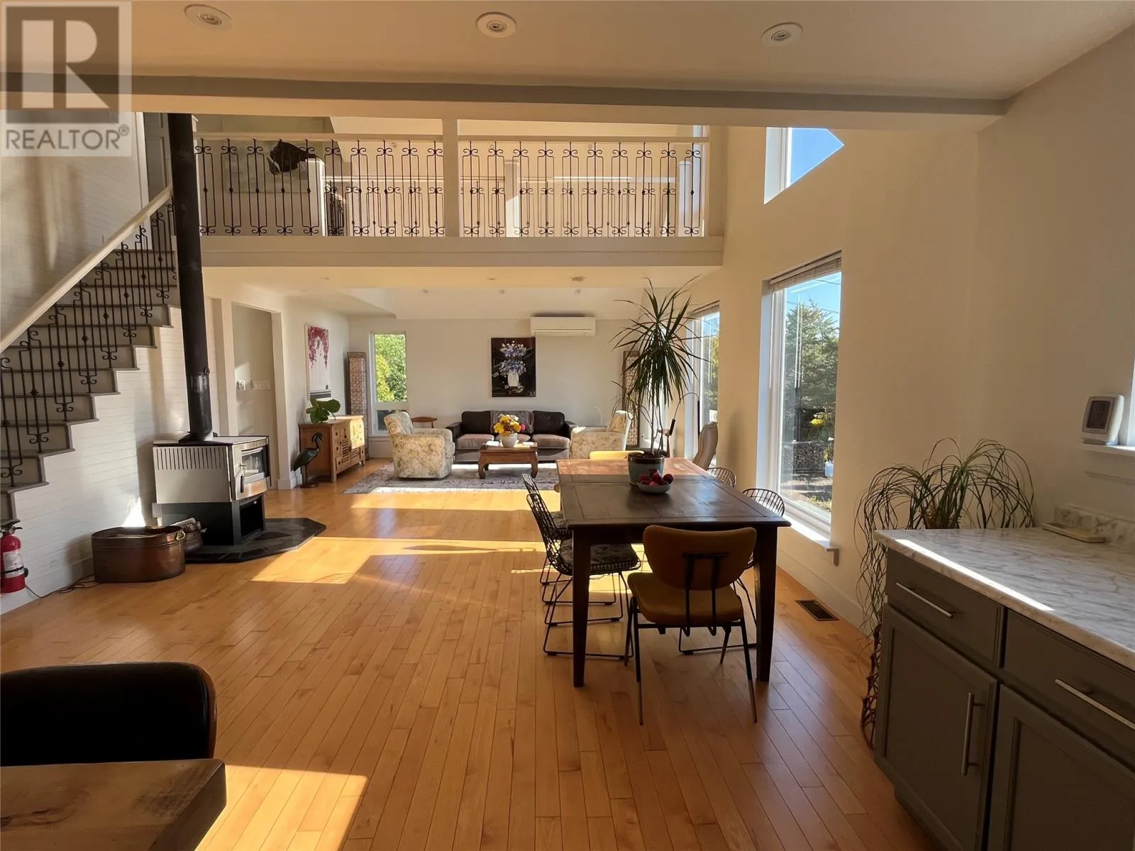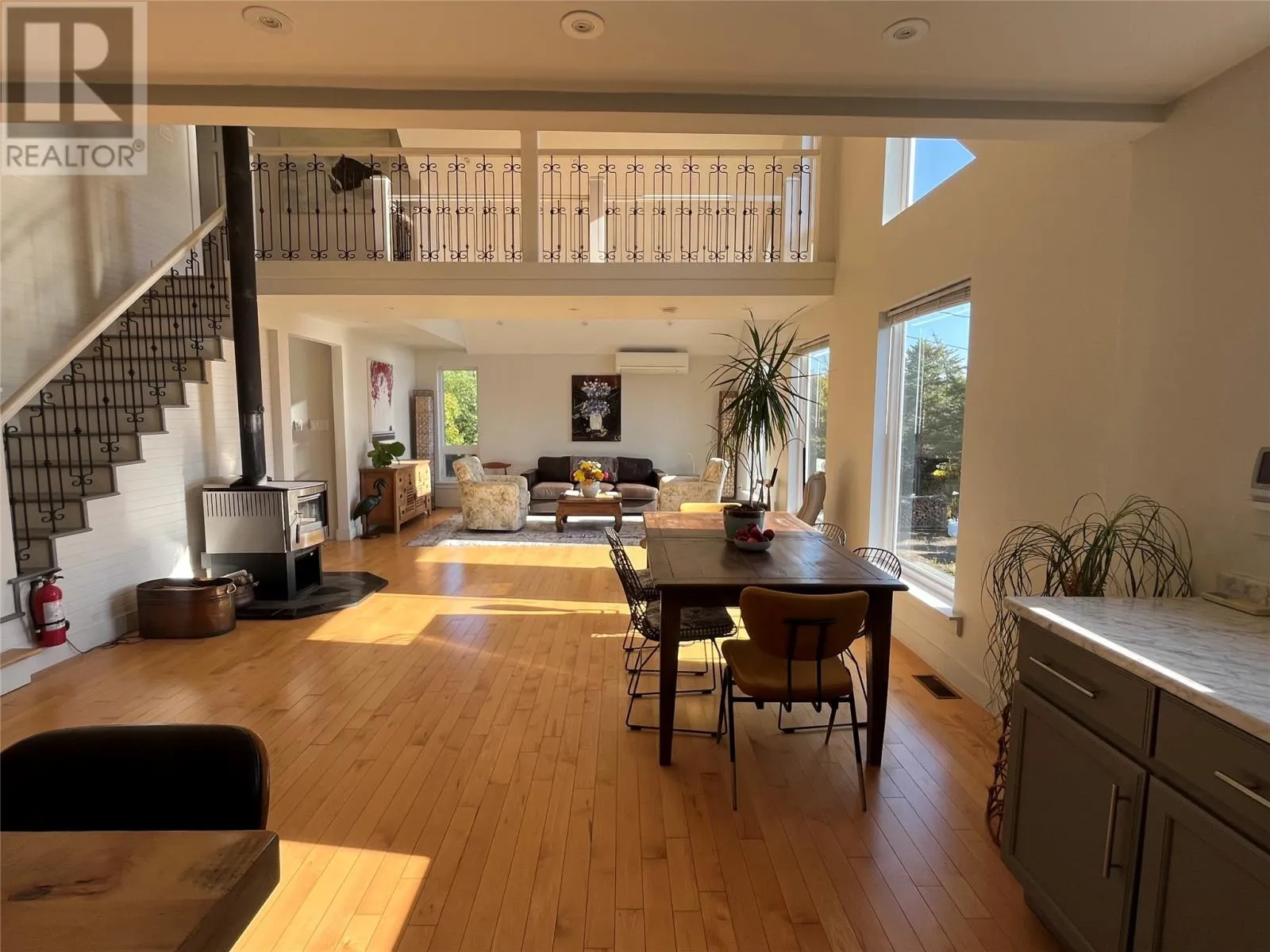 VIEW PROPERTY! PRIVACY GALORE! Spectacular views of Tors cove pond from this adorable A Frame home just 35 minutes from St Johns. This amazing home offers an open concept design main floor, kitchen, dining, and living room area with 16 ft vaulted ceilings and a cosy woodstove for great ambience. Delightful kitchen with modern decor cabinetry /center island, two average sized bedrooms with full bath, as well as main floor laundry. This property is cheerful and bright with an abundance of natural light shining through the oversized windows accentuating local pond views. On the second level, you will find the master bedroom complete with en suite /heated floor and double closets . The lower level has all aboveground windows with a walkout basement where you will find a TV room and a large family room as well as an in-house 13 x 26 garage for storing all those recreational toys or workshop area. This is a meticulously well cared for property with gleaming maple hardwood floors throughout. Lots of attention to detail. This property offers three sources of heat, mini split ,electric furnace as well as a woodstove. New hot water tank . Exterior is spruce clapboard stained with a 3/4 in cavity. New septic in recent years. Just a few minutes off route 10 in beautiful Tors Cove . (id:27476)