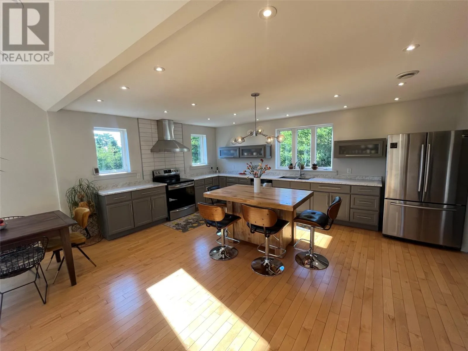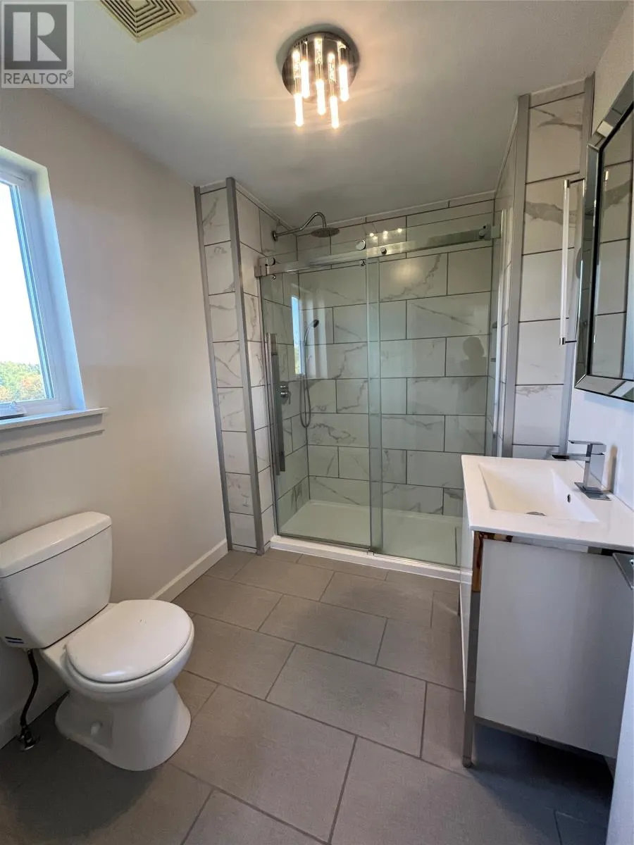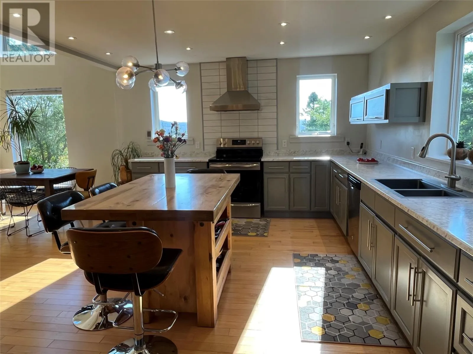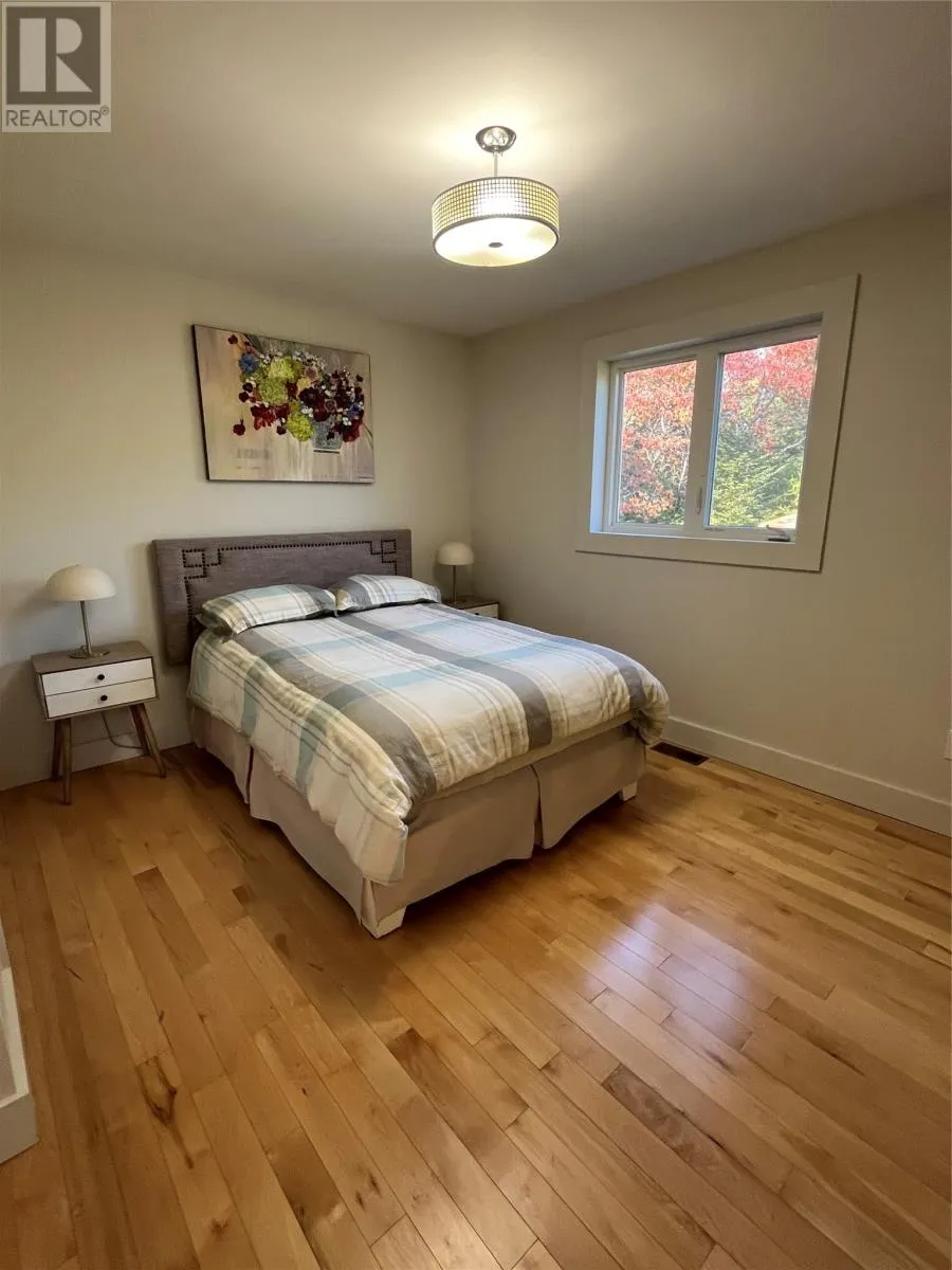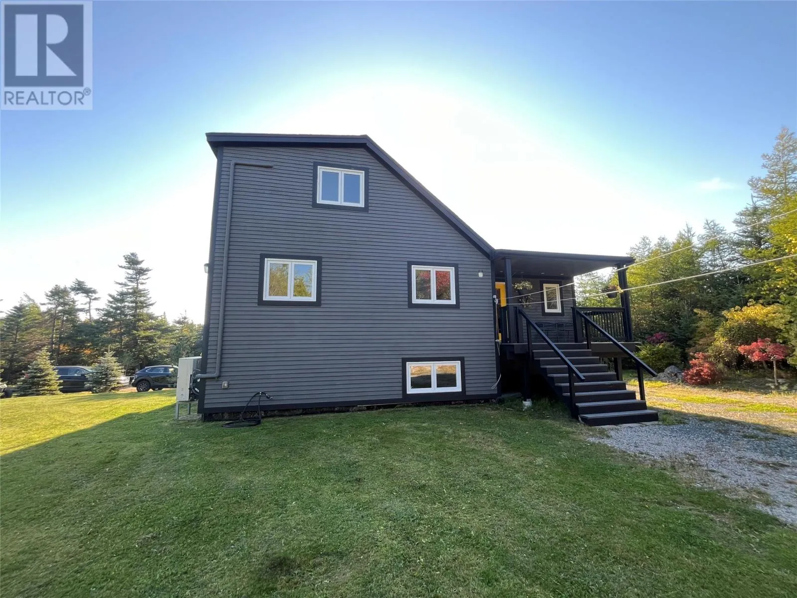 VIEW PROPERTY! PRIVACY GALORE! Spectacular views of Tors cove pond from this adorable A Frame home just 35 minutes from St Johns. This amazing home offers an open concept design main floor, kitchen, dining, and living room area with 16 ft vaulted ceilings and a cosy woodstove for great ambience. Delightful kitchen with modern decor cabinetry /center island, two average sized bedrooms with full bath, as well as main floor laundry. This property is cheerful and bright with an abundance of natural light shining through the oversized windows accentuating local pond views. On the second level, you will find the master bedroom complete with en suite /heated floor and double closets . The lower level has all aboveground windows with a walkout basement where you will find a TV room and a large family room as well as an in-house 13 x 26 garage for storing all those recreational toys or workshop area. This is a meticulously well cared for property with gleaming maple hardwood floors throughout. Lots of attention to detail. This property offers three sources of heat, mini split ,electric furnace as well as a woodstove. New hot water tank . Exterior is spruce clapboard stained with a 3/4 in cavity. New septic in recent years. Just a few minutes off route 10 in beautiful Tors Cove . (id:27476)