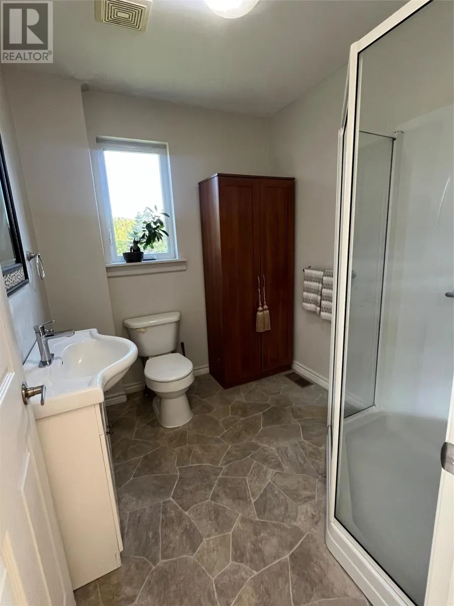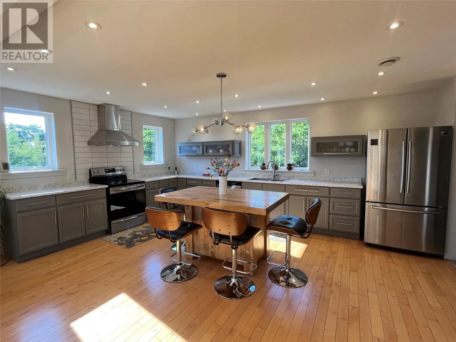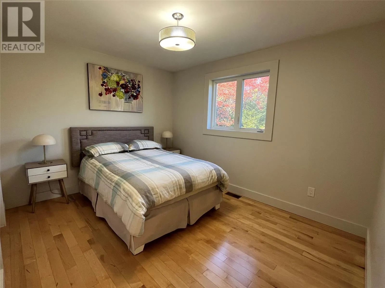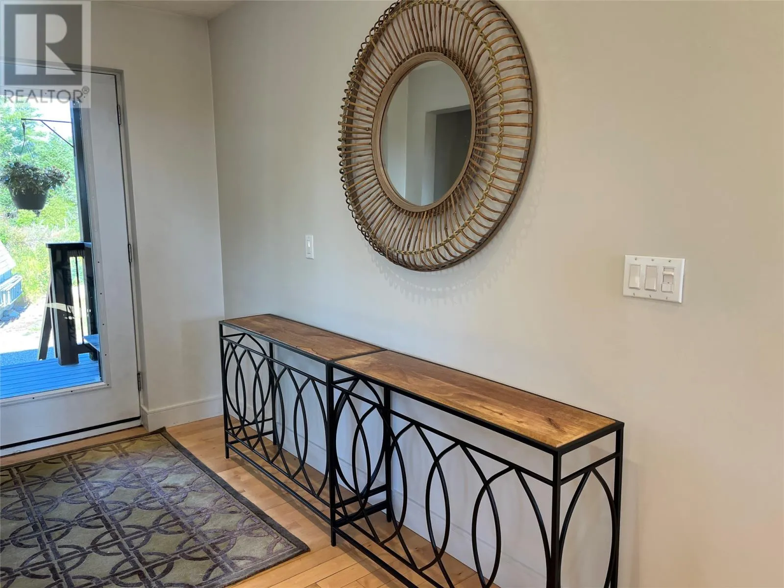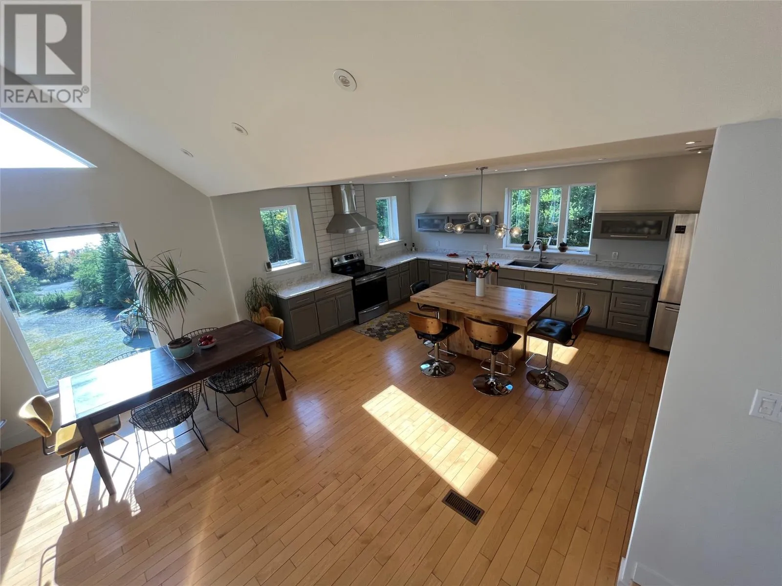 VIEW PROPERTY! PRIVACY GALORE! Spectacular views of Tors cove pond from this adorable A Frame home just 35 minutes from St Johns. This amazing home offers an open concept design main floor, kitchen, dining, and living room area with 16 ft vaulted ceilings and a cosy woodstove for great ambience. Delightful kitchen with modern decor cabinetry /center island, two average sized bedrooms with full bath, as well as main floor laundry. This property is cheerful and bright with an abundance of natural light shining through the oversized windows accentuating local pond views. On the second level, you will find the master bedroom complete with en suite /heated floor and double closets . The lower level has all aboveground windows with a walkout basement where you will find a TV room and a large family room as well as an in-house 13 x 26 garage for storing all those recreational toys or workshop area. This is a meticulously well cared for property with gleaming maple hardwood floors throughout. Lots of attention to detail. This property offers three sources of heat, mini split ,electric furnace as well as a woodstove. New hot water tank . Exterior is spruce clapboard stained with a 3/4 in cavity. New septic in recent years. Just a few minutes off route 10 in beautiful Tors Cove . (id:27476)