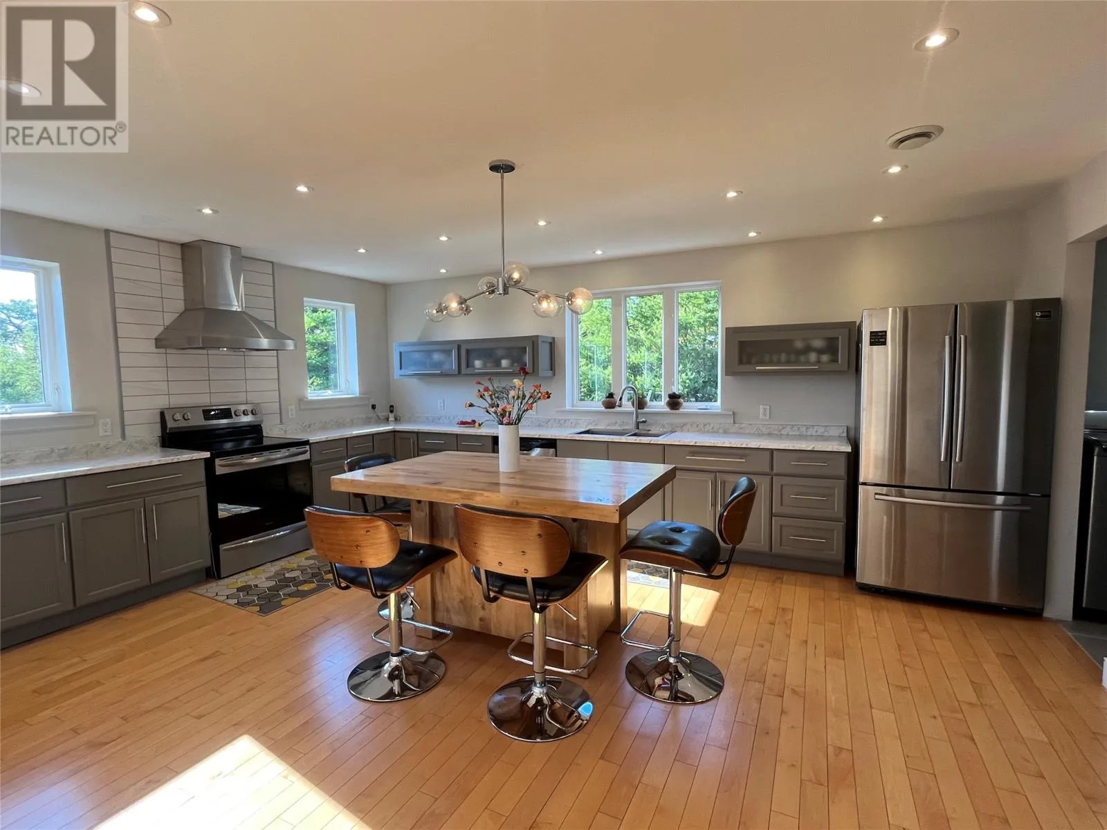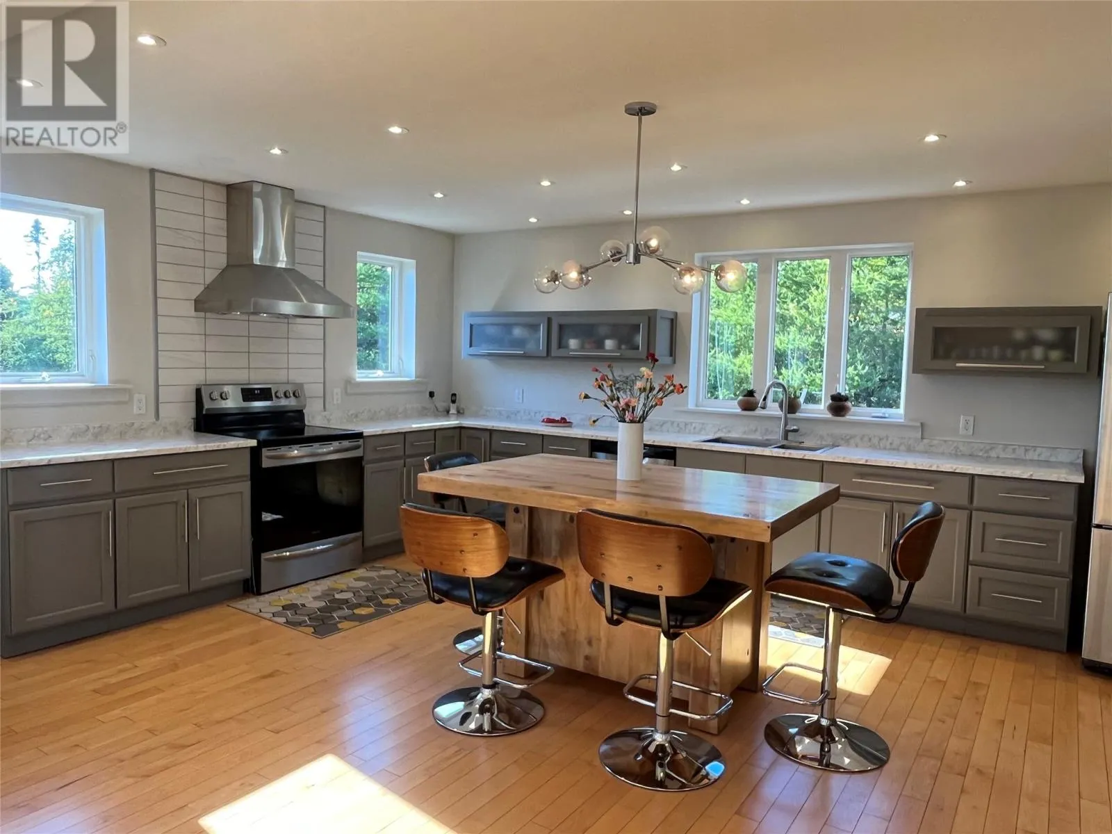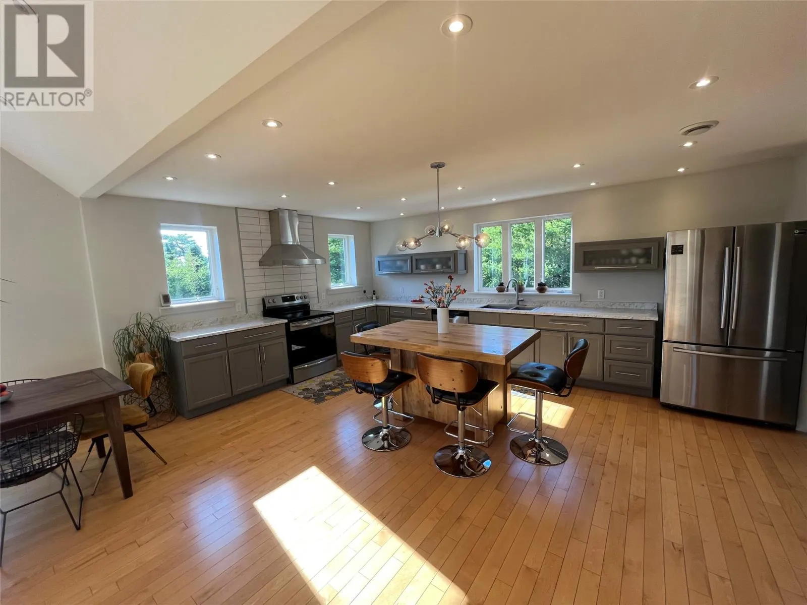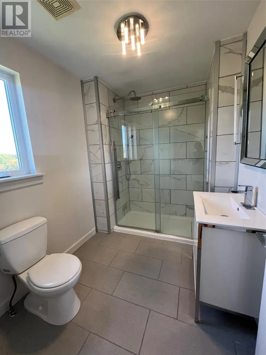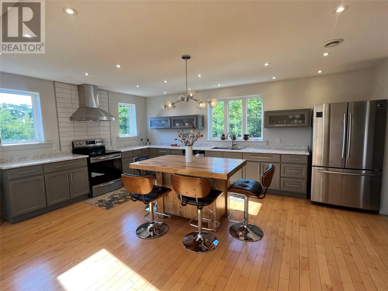 VIEW PROPERTY! PRIVACY GALORE! Spectacular views of Tors cove pond from this adorable A Frame home just 35 minutes from St Johns. This amazing home offers an open concept design main floor, kitchen, dining, and living room area with 16 ft vaulted ceilings and a cosy woodstove for great ambience. Delightful kitchen with modern decor cabinetry /center island, two average sized bedrooms with full bath, as well as main floor laundry. This property is cheerful and bright with an abundance of natural light shining through the oversized windows accentuating local pond views. On the second level, you will find the master bedroom complete with en suite /heated floor and double closets . The lower level has all aboveground windows with a walkout basement where you will find a TV room and a large family room as well as an in-house 13 x 26 garage for storing all those recreational toys or workshop area. This is a meticulously well cared for property with gleaming maple hardwood floors throughout. Lots of attention to detail. This property offers three sources of heat, mini split ,electric furnace as well as a woodstove. New hot water tank . Exterior is spruce clapboard stained with a 3/4 in cavity. New septic in recent years. Just a few minutes off route 10 in beautiful Tors Cove . (id:27476)