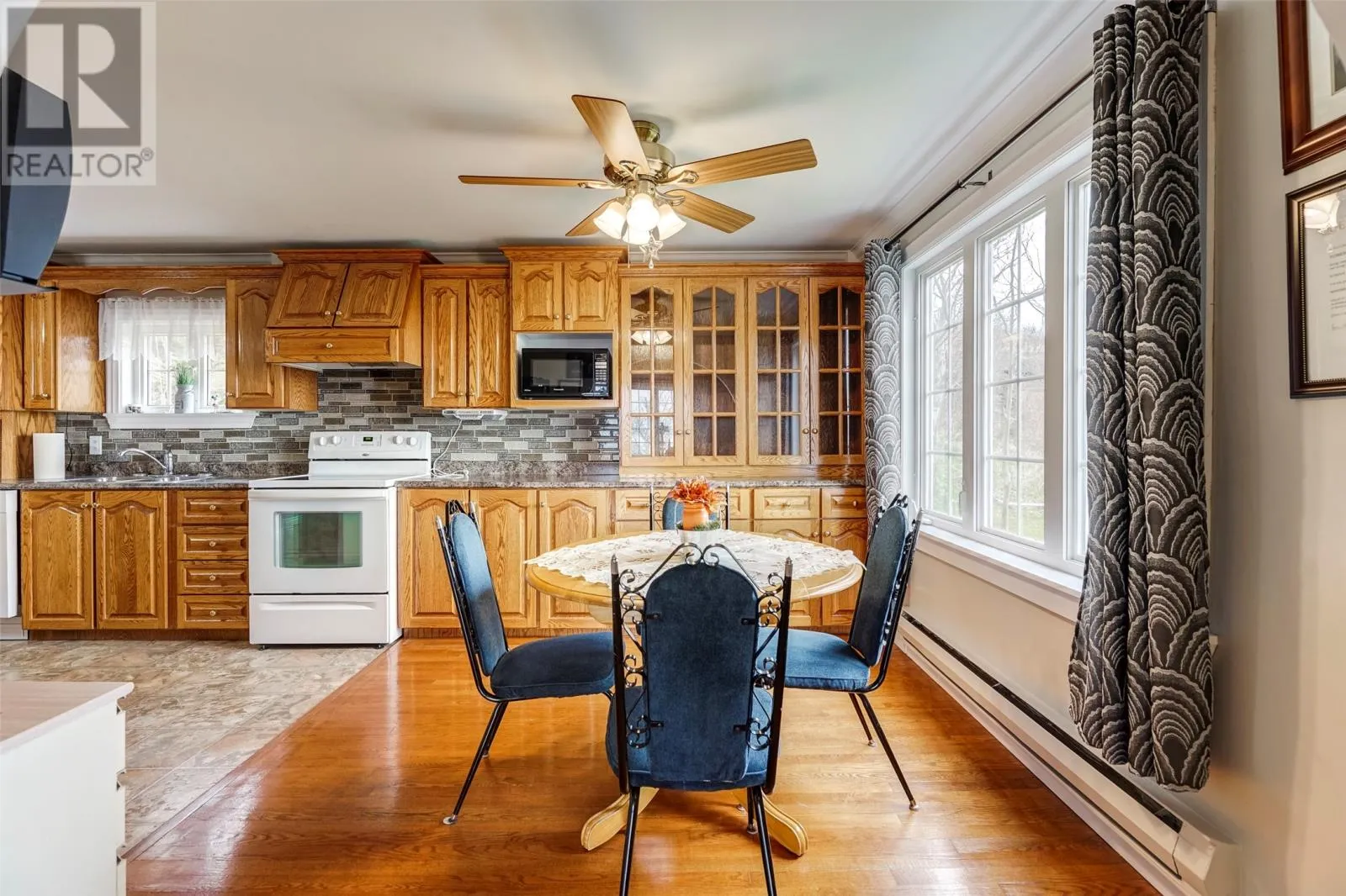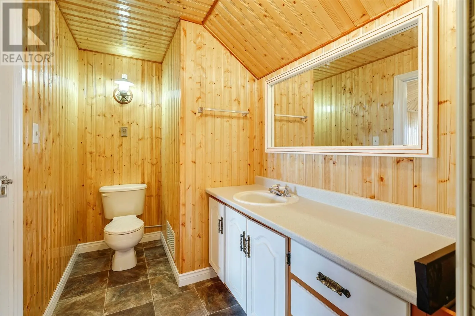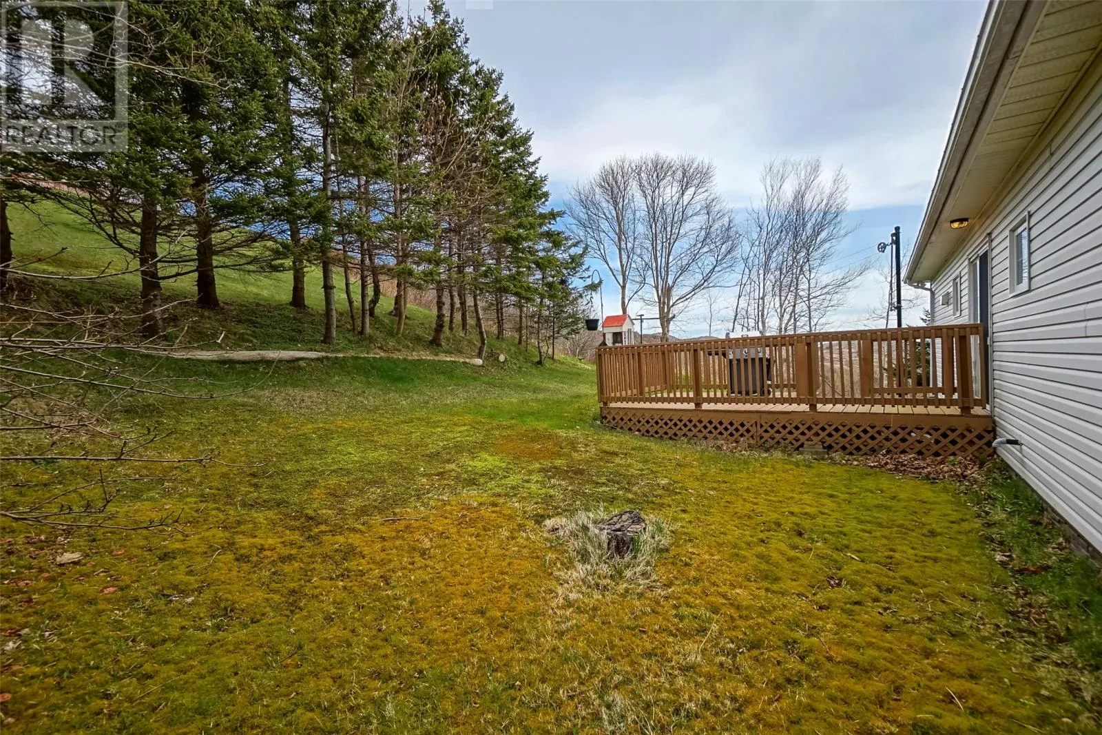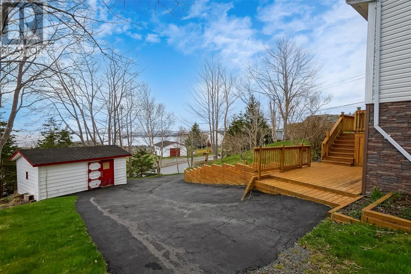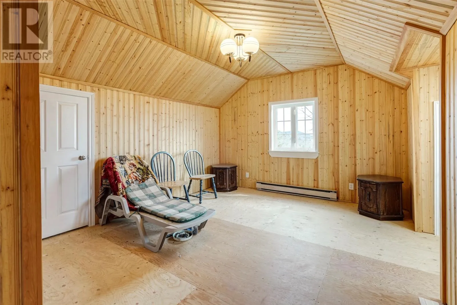 Welcome to 51 Main Road, Upper Island Cove. This 2-storey home has been well maintained an offers a beautiful view of the bay, landscaped grounds, 14' x 20' detached garage, large front deck and spacious back yard. The main floor has a custom eat-in kitchen with appliances included, living room with more water views, three-piece main bathroom and three bedrooms. Provisions have been made to install stairs, but the second floor is currently accessed through a bedroom where you'll find a hobby room, two more bedrooms and a full three-piece bathroom. The basement is highlighted by a large rec room with wood burning stove. Completing the basement is an office, laundry room, storage area and third full bathroom! (id:27476)