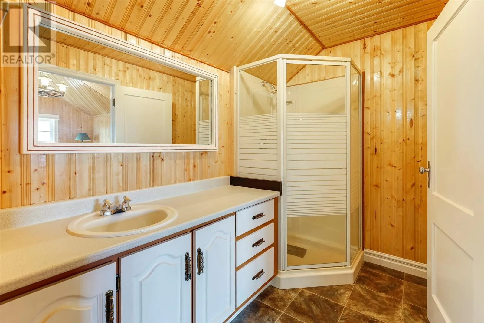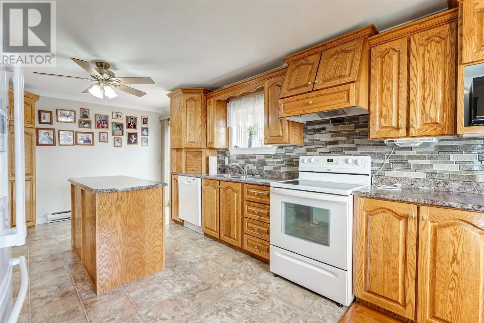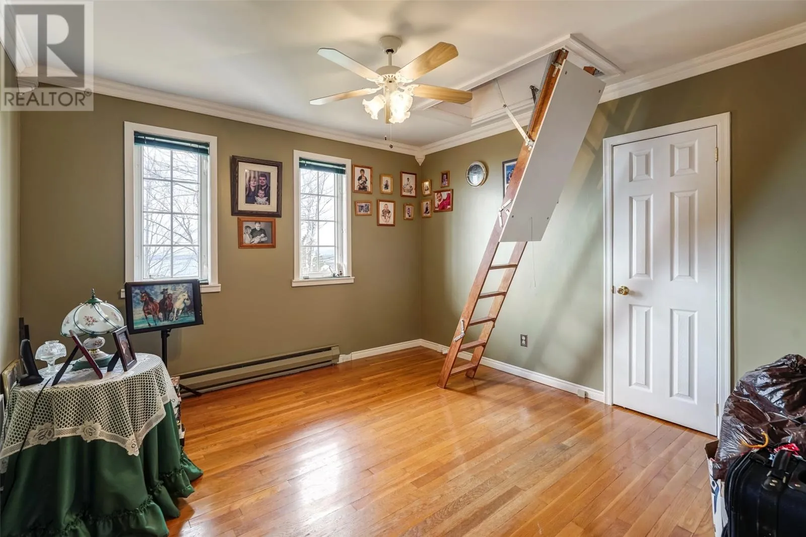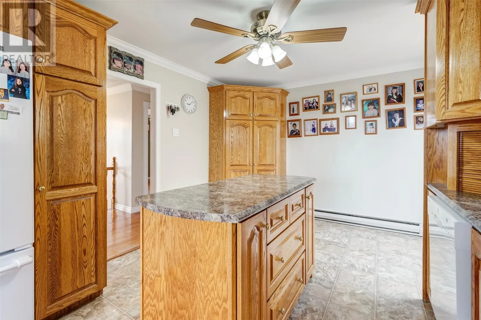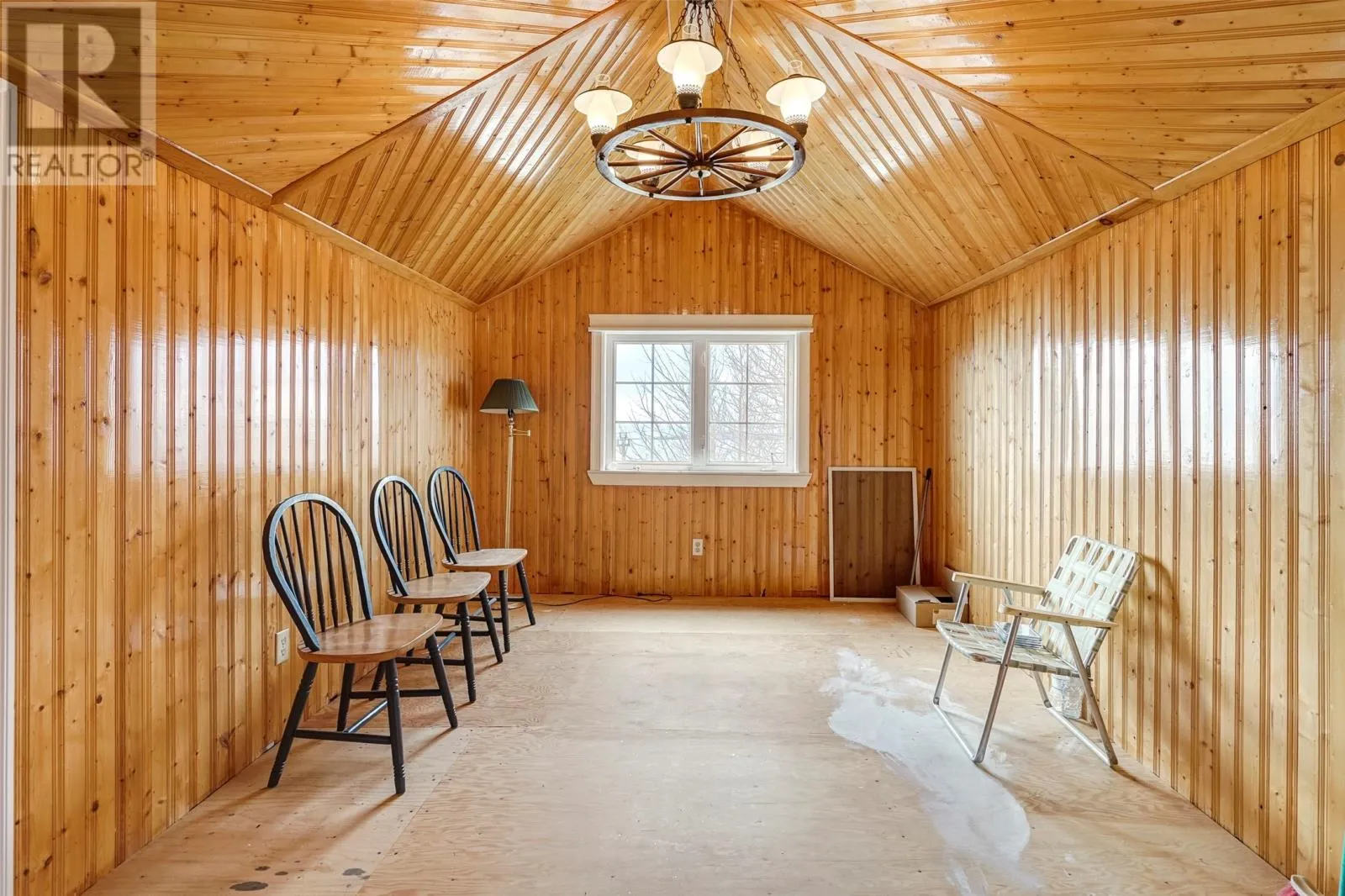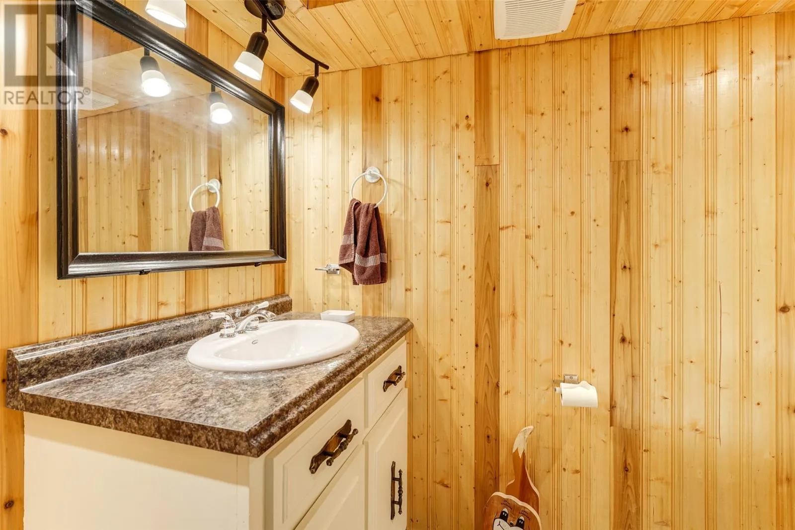 Welcome to 51 Main Road, Upper Island Cove. This 2-storey home has been well maintained an offers a beautiful view of the bay, landscaped grounds, 14' x 20' detached garage, large front deck and spacious back yard. The main floor has a custom eat-in kitchen with appliances included, living room with more water views, three-piece main bathroom and three bedrooms. Provisions have been made to install stairs, but the second floor is currently accessed through a bedroom where you'll find a hobby room, two more bedrooms and a full three-piece bathroom. The basement is highlighted by a large rec room with wood burning stove. Completing the basement is an office, laundry room, storage area and third full bathroom! (id:27476)