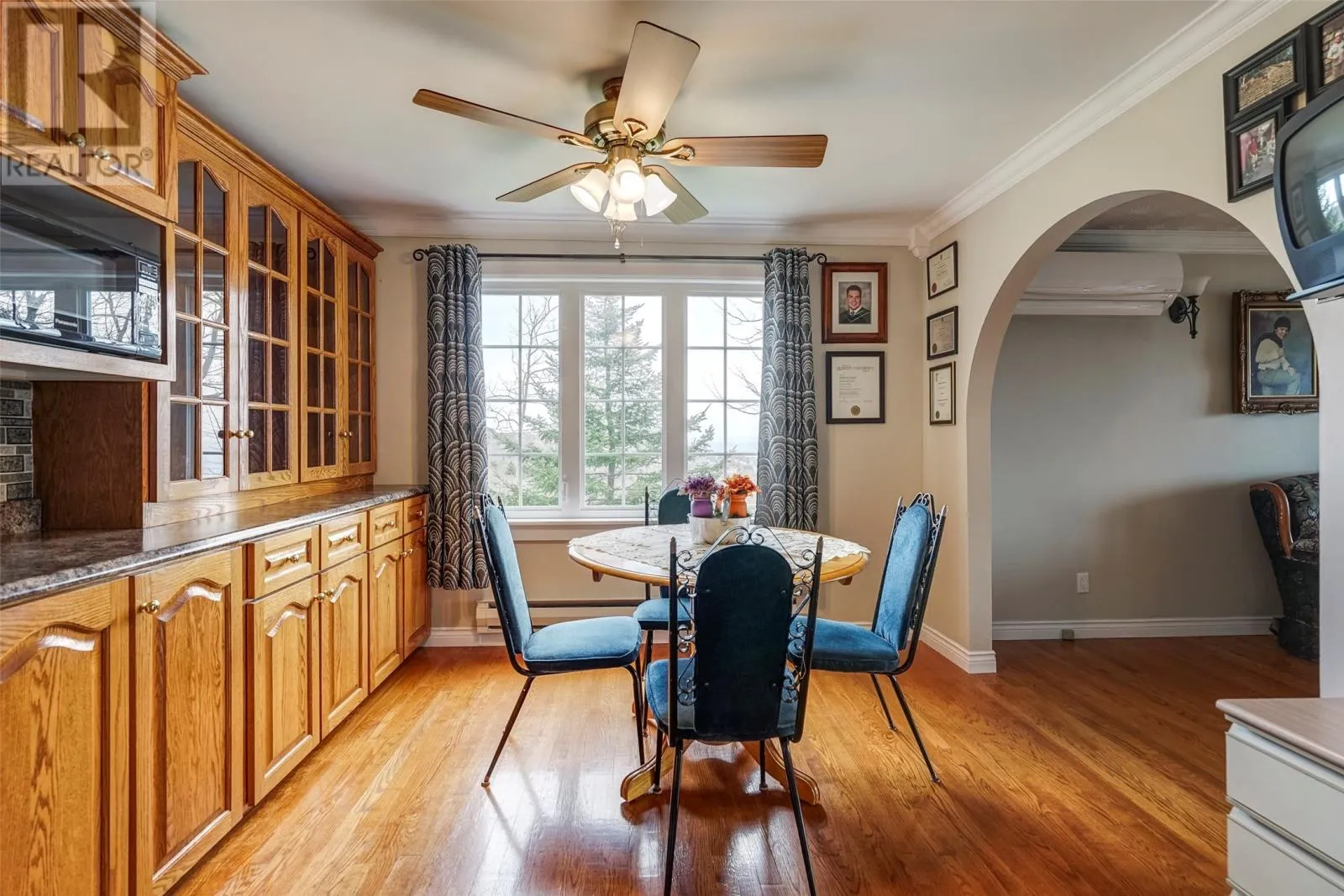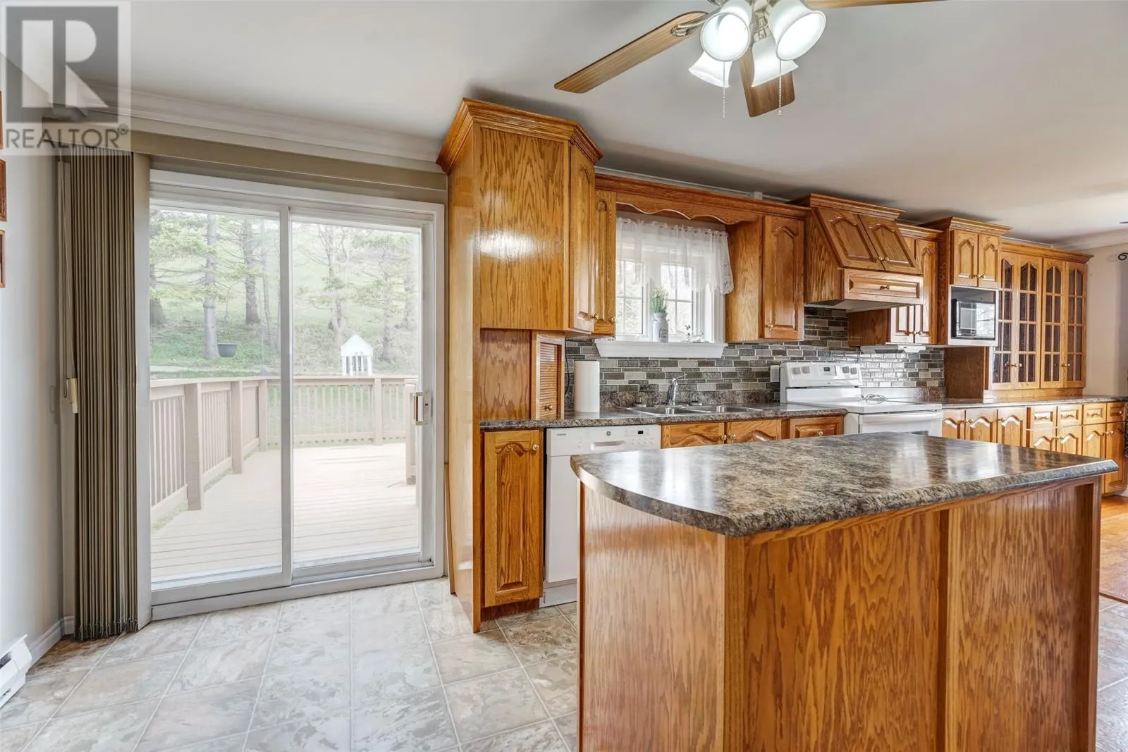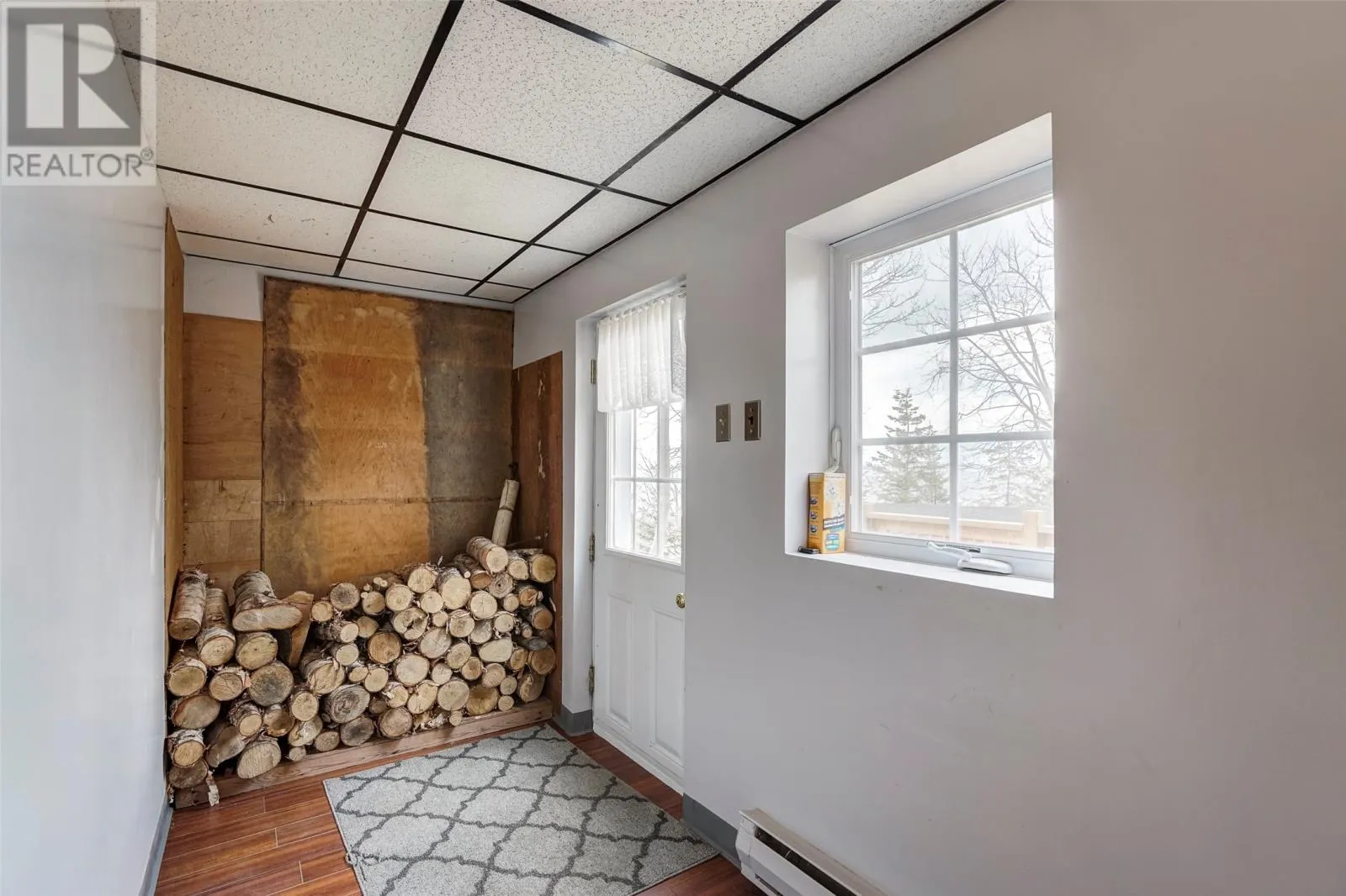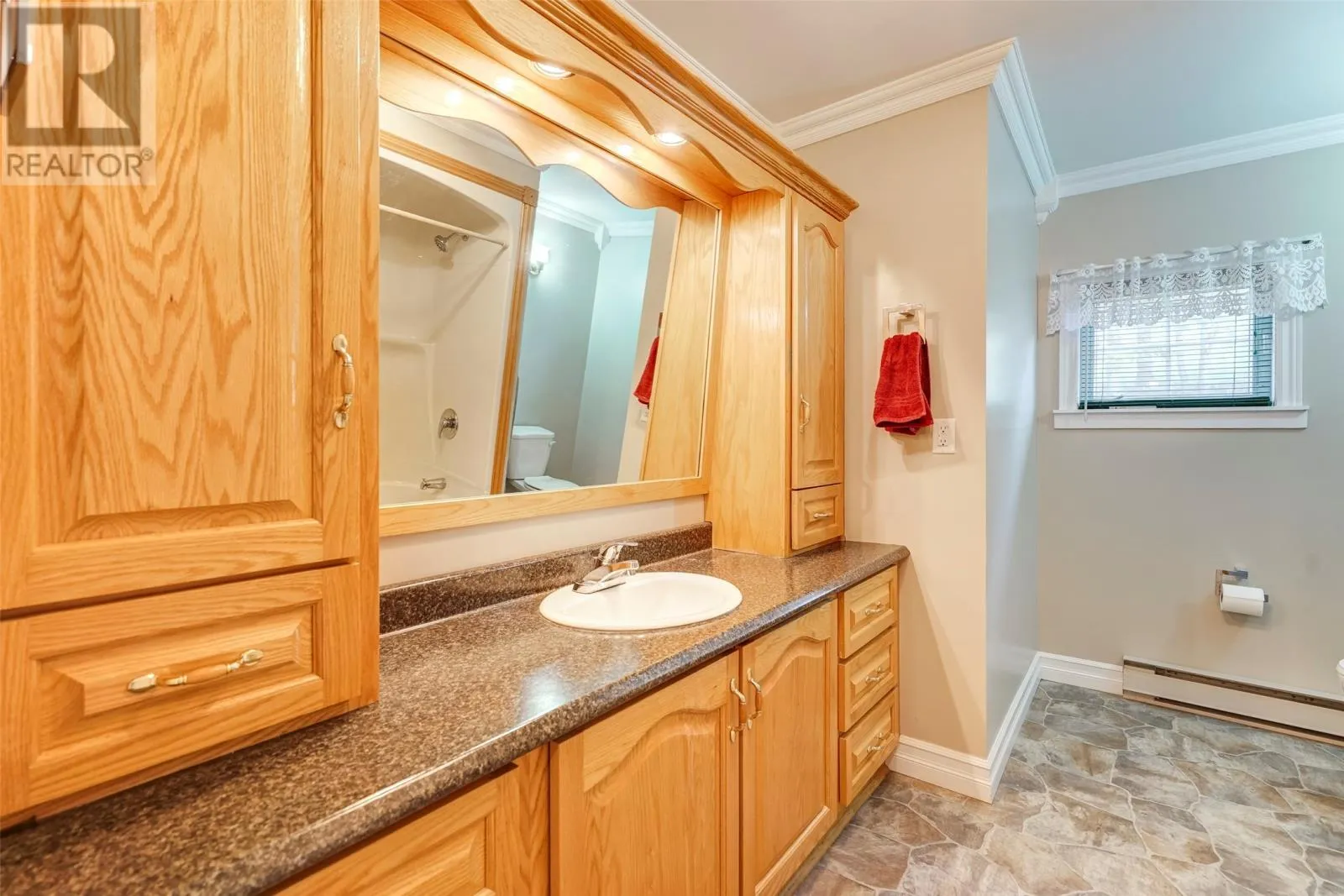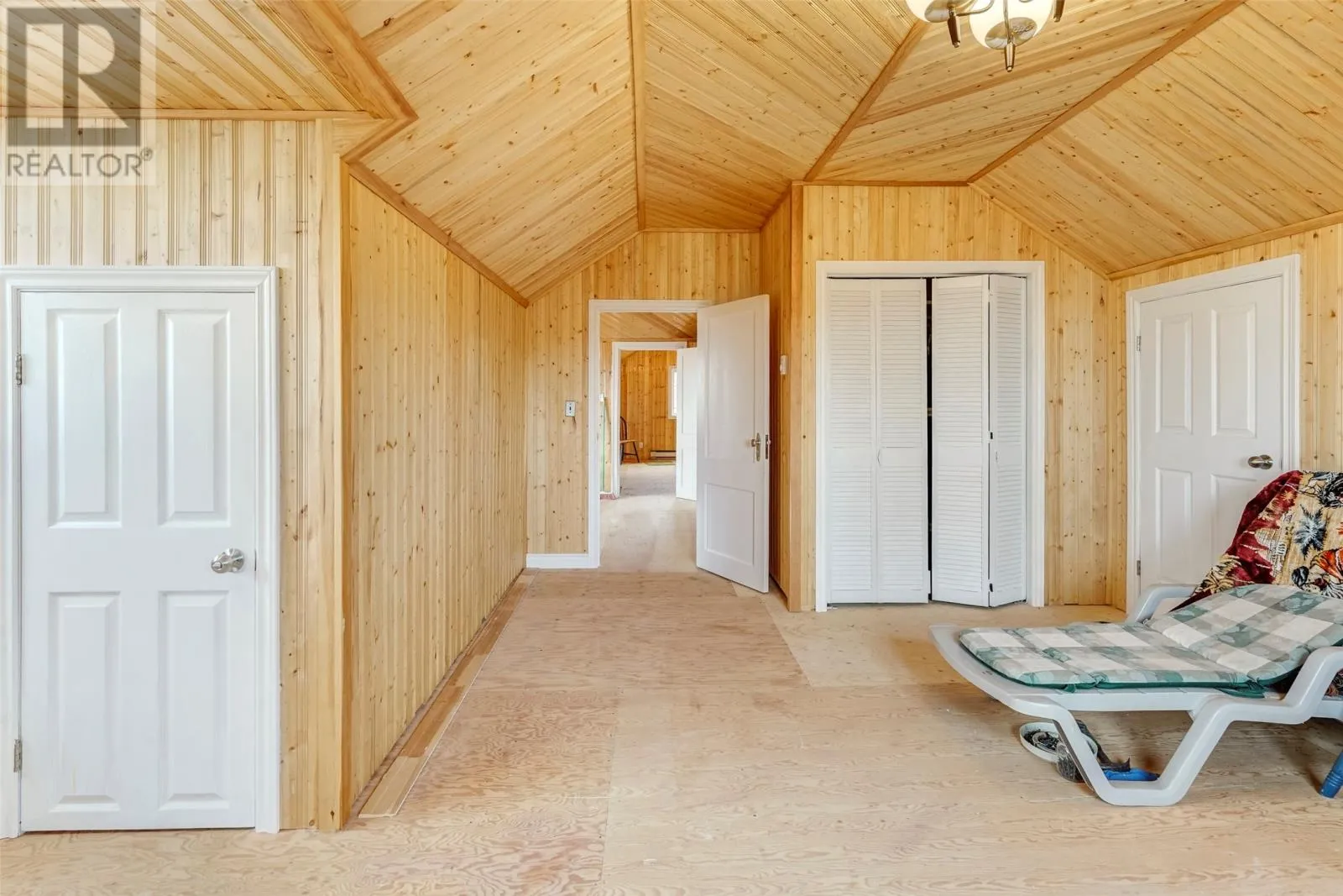 Welcome to 51 Main Road, Upper Island Cove. This 2-storey home has been well maintained an offers a beautiful view of the bay, landscaped grounds, 14' x 20' detached garage, large front deck and spacious back yard. The main floor has a custom eat-in kitchen with appliances included, living room with more water views, three-piece main bathroom and three bedrooms. Provisions have been made to install stairs, but the second floor is currently accessed through a bedroom where you'll find a hobby room, two more bedrooms and a full three-piece bathroom. The basement is highlighted by a large rec room with wood burning stove. Completing the basement is an office, laundry room, storage area and third full bathroom! (id:27476)
