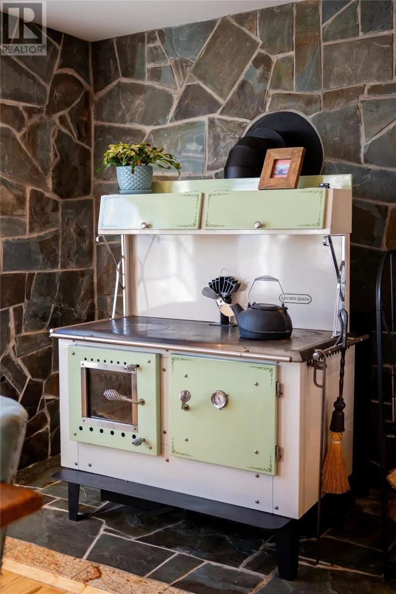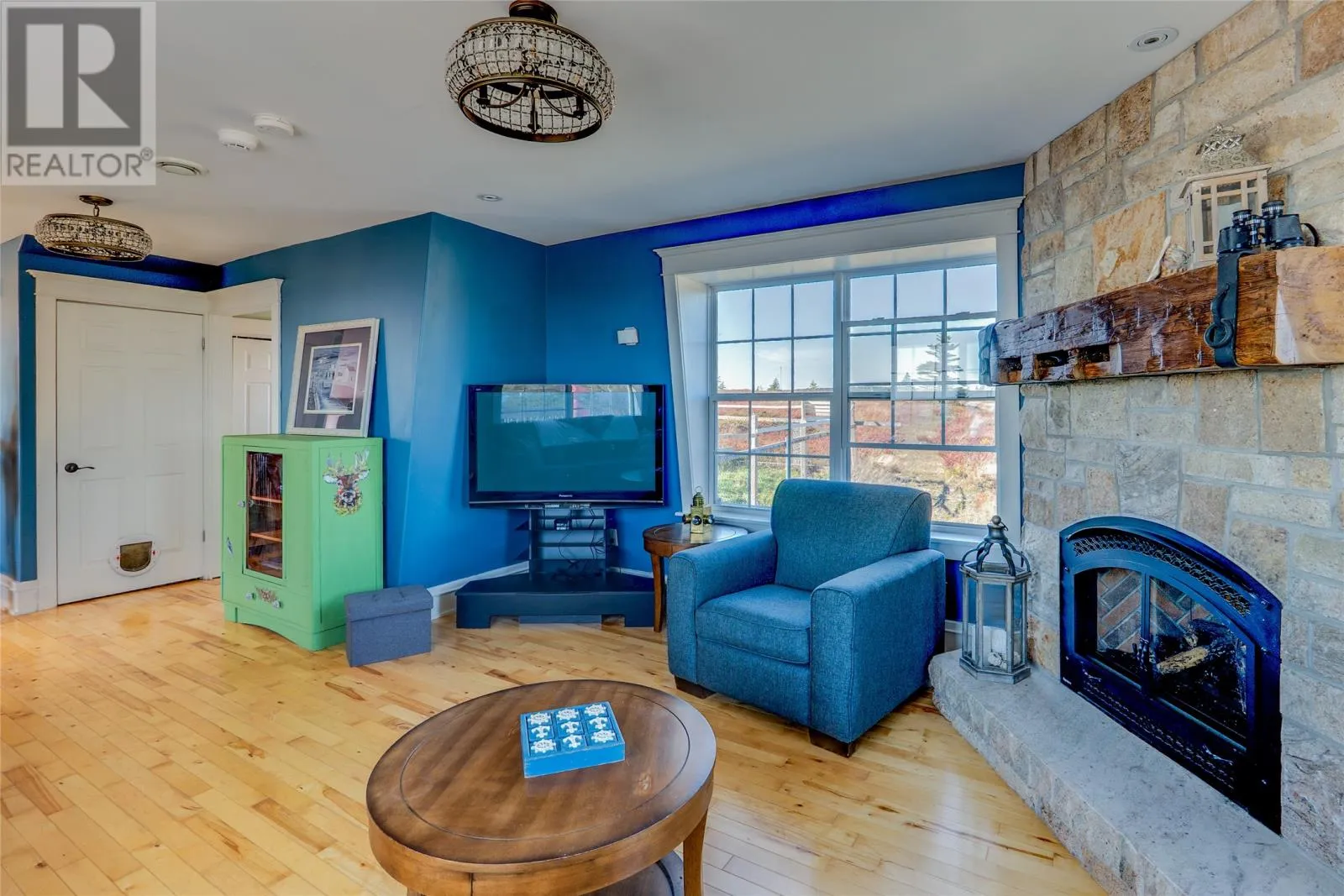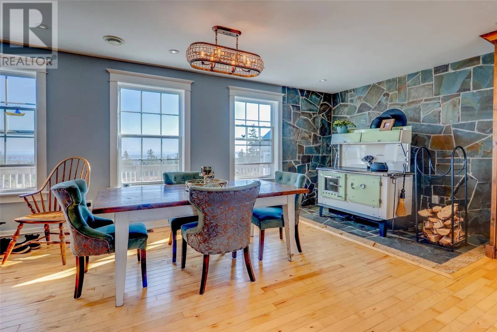 Perched on 8.26 private acres overlooking the Atlantic, this one-of-a-kind lighthouse-inspired home in Bishopâs Cove is a true masterpiece of craftsmanship and design. Featuring three bedrooms and one and a half baths, the home offers panoramic 360-degree ocean views from the top-floor wraparound deck that will take your breath away. Every element has been hand-selected and thoughtfully crafted, from the kitchen cabinetry built with reclaimed century-old wood and imported Italian faucets to the WETT-certified Kitchen Queen wood stove surrounded by locally quarried stone. The living room features a fireplace framed with Bell Island stone and a hand-hewn barn beam mantle from Ontario, mounted with custom ironwork by a local blacksmith. The main level includes a spacious kitchen and dining area, cozy living room, laundry, and powder room. The second floor offers two bedrooms, a large bath with a soaker tub, and a unique antique Singer sewing machine vanity. The third floor serves as a lighthouse tower bedroom with a wraparound deck showcasing breathtaking ocean vistas. The property also features a massive two-level wired garage and land rich with wild blueberries in the fall. A rare blend of artistry, privacy, and coastal beautyâthis home is truly one of a kind. (id:27476)