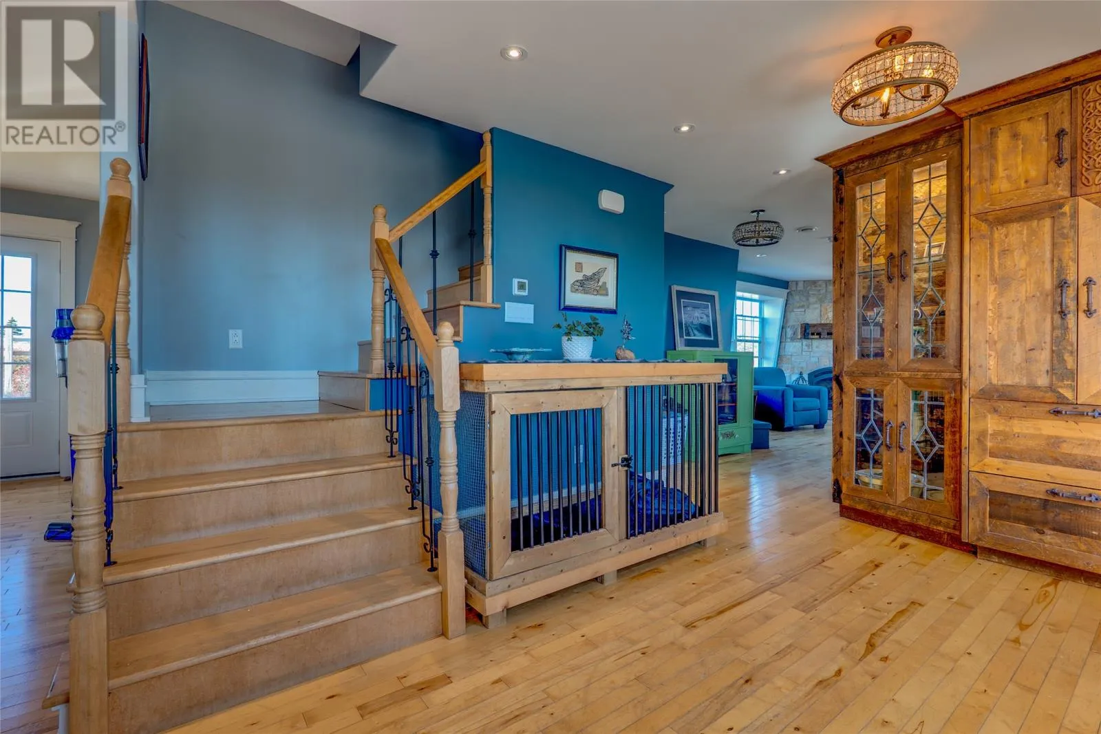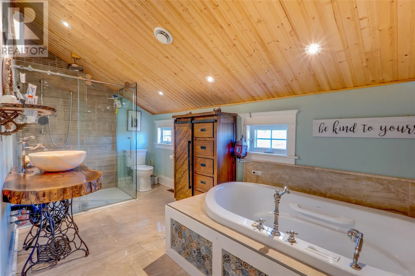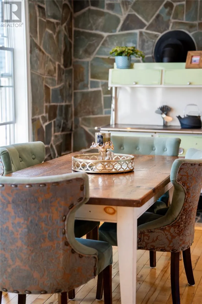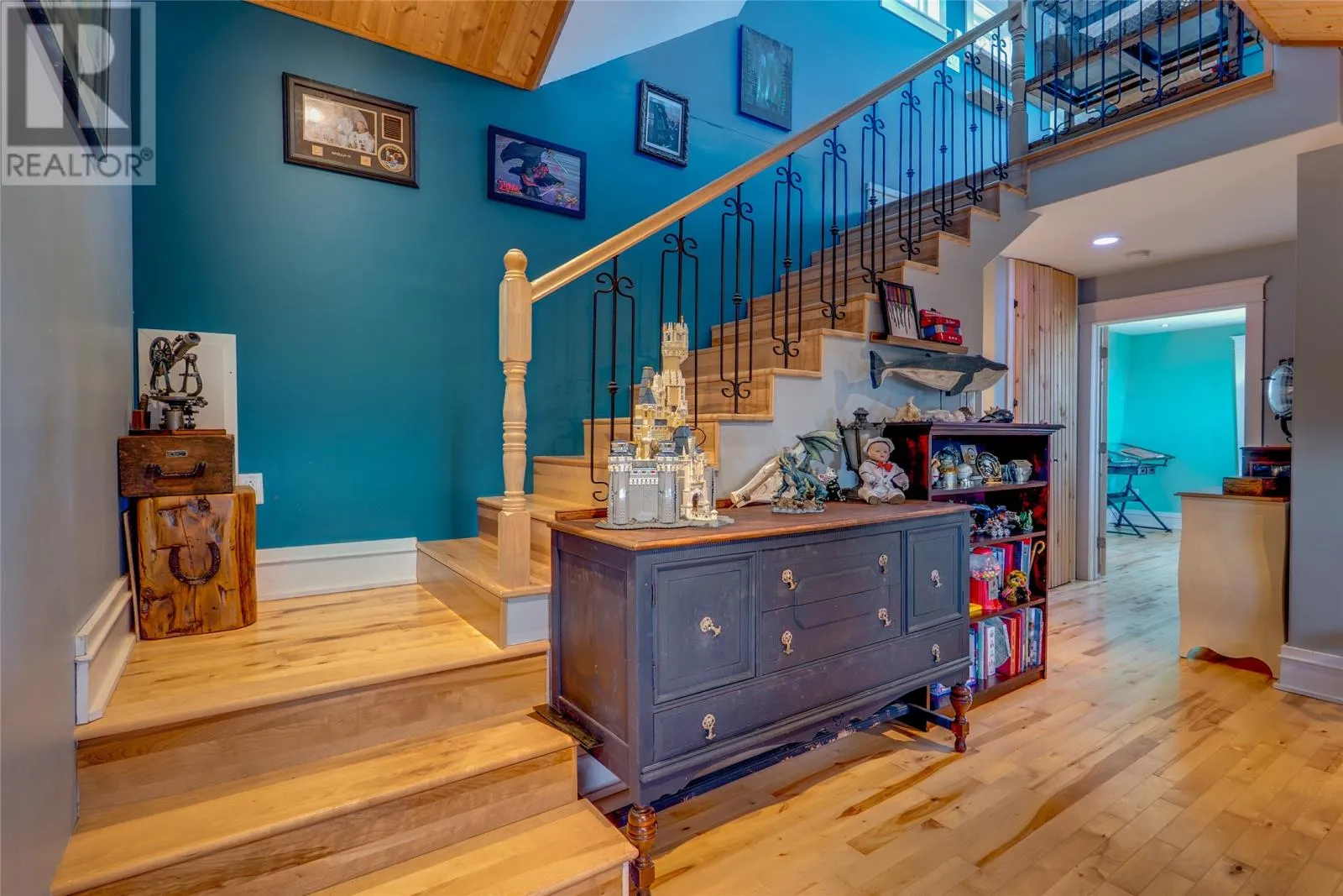 Perched on 8.26 private acres overlooking the Atlantic, this one-of-a-kind lighthouse-inspired home in Bishopâs Cove is a true masterpiece of craftsmanship and design. Featuring three bedrooms and one and a half baths, the home offers panoramic 360-degree ocean views from the top-floor wraparound deck that will take your breath away. Every element has been hand-selected and thoughtfully crafted, from the kitchen cabinetry built with reclaimed century-old wood and imported Italian faucets to the WETT-certified Kitchen Queen wood stove surrounded by locally quarried stone. The living room features a fireplace framed with Bell Island stone and a hand-hewn barn beam mantle from Ontario, mounted with custom ironwork by a local blacksmith. The main level includes a spacious kitchen and dining area, cozy living room, laundry, and powder room. The second floor offers two bedrooms, a large bath with a soaker tub, and a unique antique Singer sewing machine vanity. The third floor serves as a lighthouse tower bedroom with a wraparound deck showcasing breathtaking ocean vistas. The property also features a massive two-level wired garage and land rich with wild blueberries in the fall. A rare blend of artistry, privacy, and coastal beautyâthis home is truly one of a kind. (id:27476)