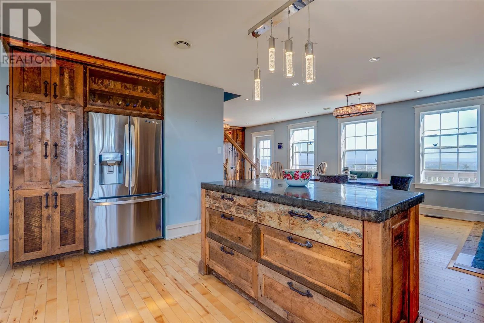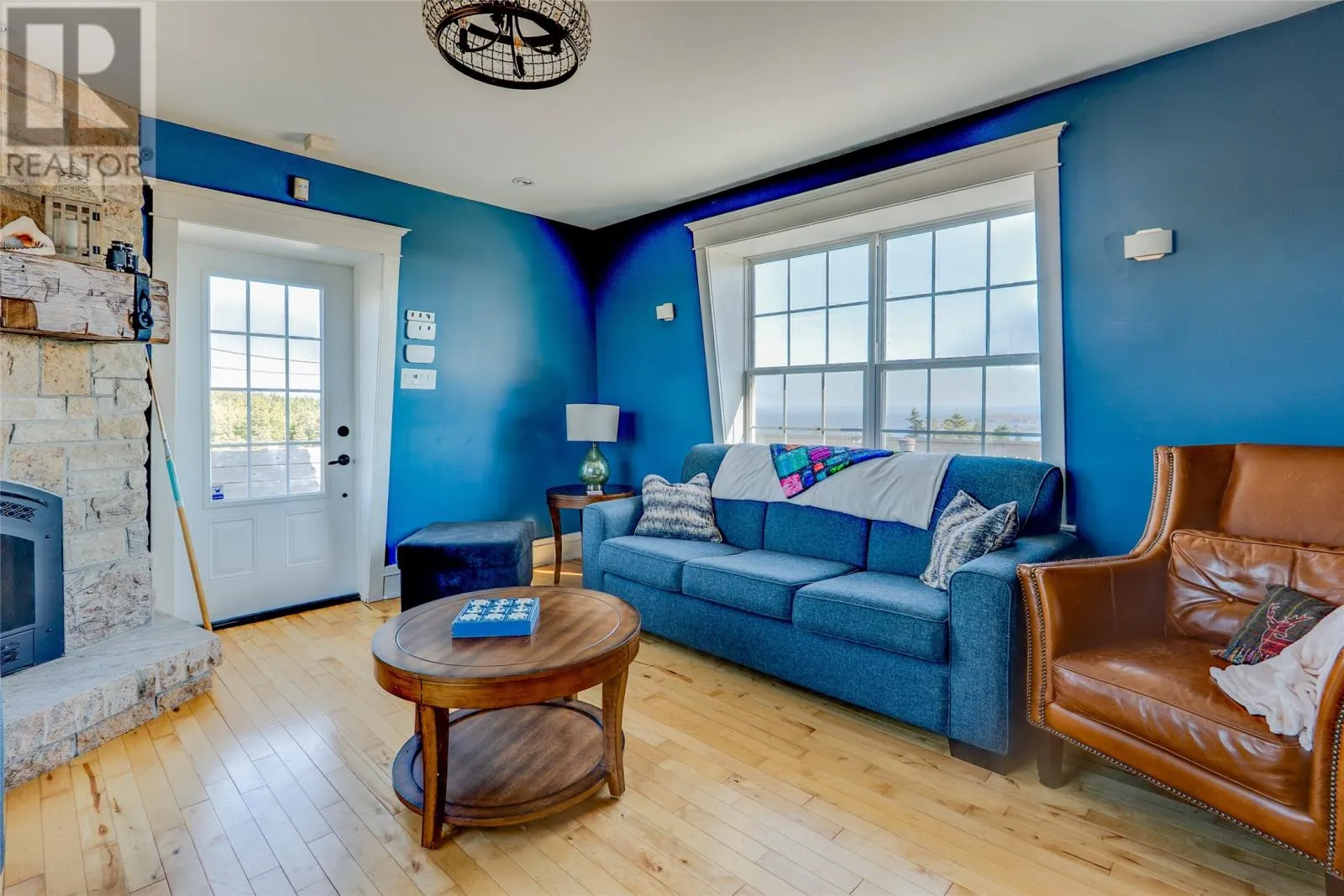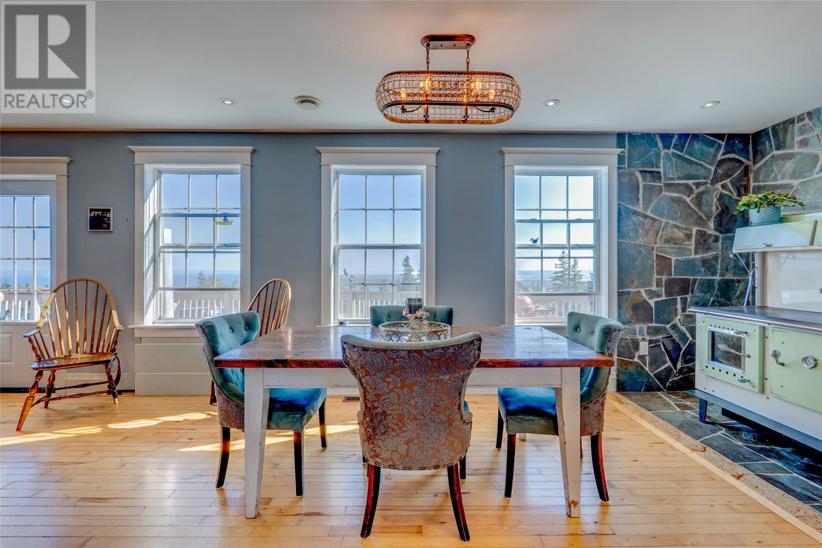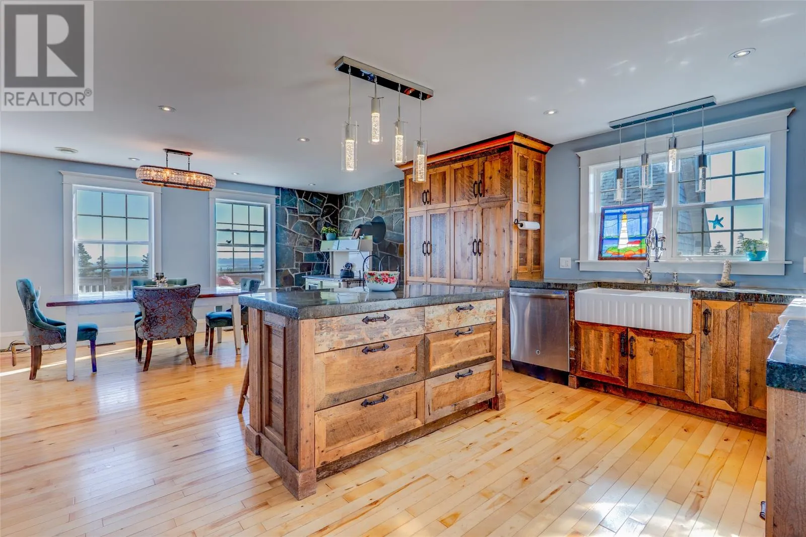 Perched on 8.26 private acres overlooking the Atlantic, this one-of-a-kind lighthouse-inspired home in Bishopâs Cove is a true masterpiece of craftsmanship and design. Featuring three bedrooms and one and a half baths, the home offers panoramic 360-degree ocean views from the top-floor wraparound deck that will take your breath away. Every element has been hand-selected and thoughtfully crafted, from the kitchen cabinetry built with reclaimed century-old wood and imported Italian faucets to the WETT-certified Kitchen Queen wood stove surrounded by locally quarried stone. The living room features a fireplace framed with Bell Island stone and a hand-hewn barn beam mantle from Ontario, mounted with custom ironwork by a local blacksmith. The main level includes a spacious kitchen and dining area, cozy living room, laundry, and powder room. The second floor offers two bedrooms, a large bath with a soaker tub, and a unique antique Singer sewing machine vanity. The third floor serves as a lighthouse tower bedroom with a wraparound deck showcasing breathtaking ocean vistas. The property also features a massive two-level wired garage and land rich with wild blueberries in the fall. A rare blend of artistry, privacy, and coastal beautyâthis home is truly one of a kind. (id:27476)