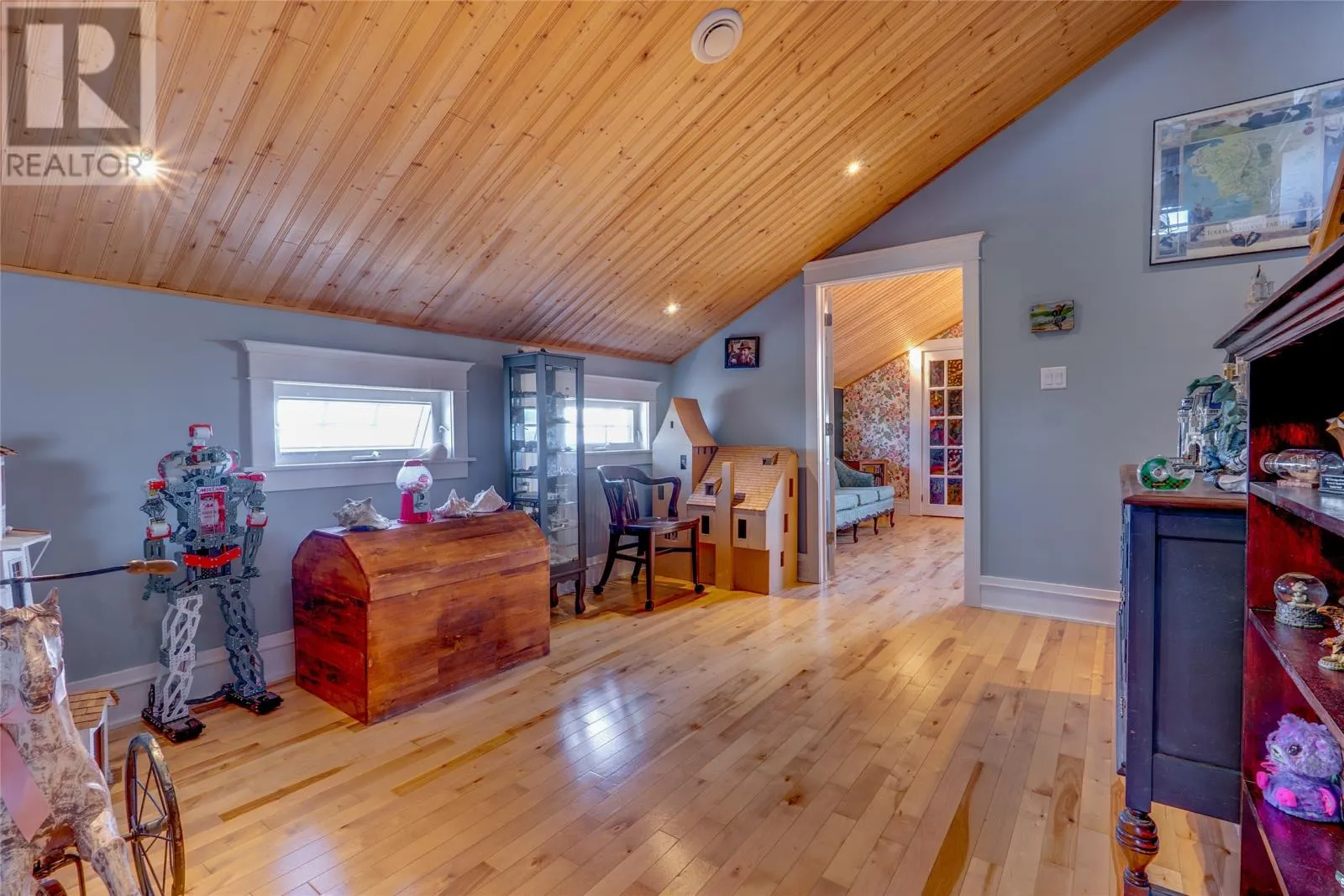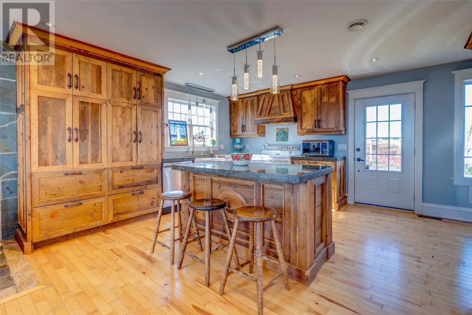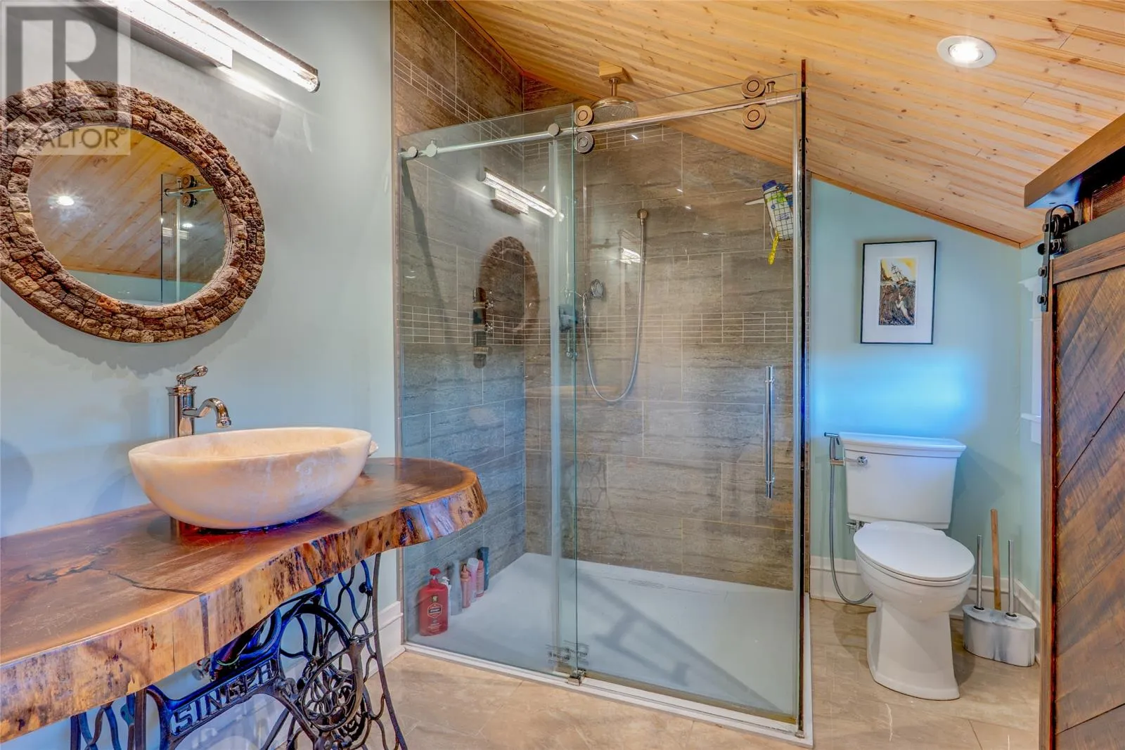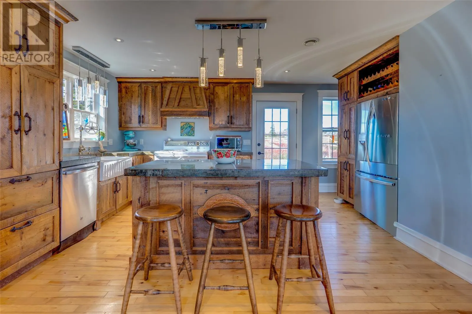 Perched on 8.26 private acres overlooking the Atlantic, this one-of-a-kind lighthouse-inspired home in Bishopâs Cove is a true masterpiece of craftsmanship and design. Featuring three bedrooms and one and a half baths, the home offers panoramic 360-degree ocean views from the top-floor wraparound deck that will take your breath away. Every element has been hand-selected and thoughtfully crafted, from the kitchen cabinetry built with reclaimed century-old wood and imported Italian faucets to the WETT-certified Kitchen Queen wood stove surrounded by locally quarried stone. The living room features a fireplace framed with Bell Island stone and a hand-hewn barn beam mantle from Ontario, mounted with custom ironwork by a local blacksmith. The main level includes a spacious kitchen and dining area, cozy living room, laundry, and powder room. The second floor offers two bedrooms, a large bath with a soaker tub, and a unique antique Singer sewing machine vanity. The third floor serves as a lighthouse tower bedroom with a wraparound deck showcasing breathtaking ocean vistas. The property also features a massive two-level wired garage and land rich with wild blueberries in the fall. A rare blend of artistry, privacy, and coastal beautyâthis home is truly one of a kind. (id:27476)
