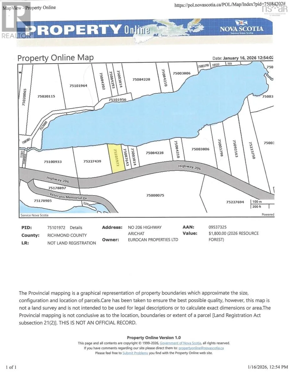Highway 206 Arichat, NS. Babin's Hill lands on Babin's Lake. On the Southwestern tip of Cape Breton Island, you will find a charming little Island retreat called Isle Madame. On this beautiful little Island, you will discover some of Nova Scotia's best places for kayaking, fishing, hunting, surfing, hiking, ATV and bike riding in the rough or on groomed trails, plus comfortable inns, bed and breakfasts, charming restaurants and cafés, fish markets and spectacular seaside views from just about everywhere. You will also discover beaches, lighthouses and other amazing sights wherever you go. This hidden gem is where Acadian culture lives on through song, music, dance and crafts. You can own a small piece of this island paradise at a very affordable price. This property takes in approximately 0.87 acres of vacant land beginning on the south shore of Babins Lake and running south to Highway 206 running through the town of Arichat. This property has approximately 138 feet of lakefront where you will experience an abundance of undisturbed natural beauty. You are also a short walk to the ocean where you can enjoy the calm waters in sheltered coves or choppy waters and rugged coastlines in less sheltered areas. The property is serviceable with Municipal water, power, internet and telephone with Municipal sewer nearby. (id:27476)