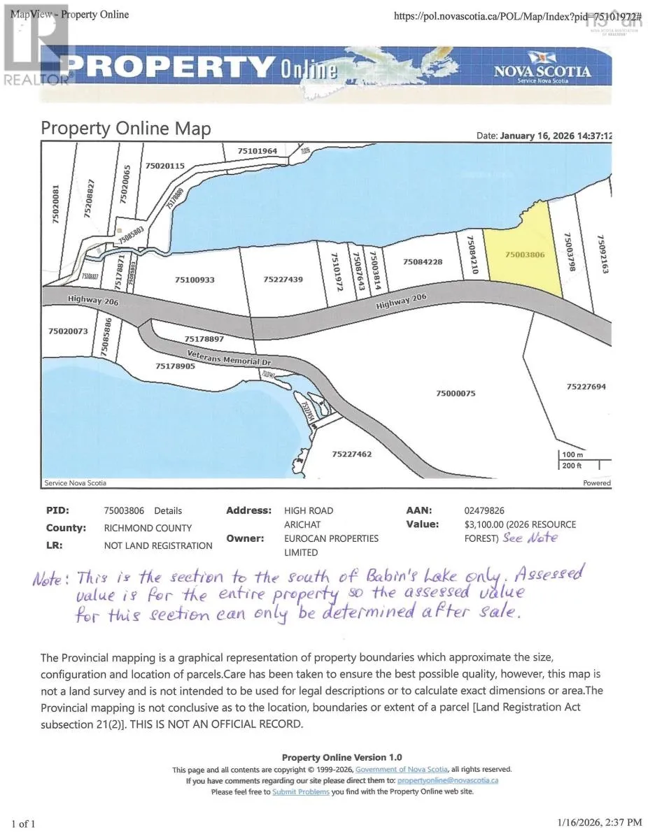 Highway 206 Arichat, NS. Babin's Hill lands on Babin's Lake. On the Southwestern tip of Cape Breton Island, you will find a charming little Island retreat called Isle Madame. On this beautiful little Island, you will discover some of Nova Scotia's best places for kayaking, fishing, hunting, surfing, hiking, ATV and bike riding in the rough or on groomed trails, plus comfortable inns, bed and breakfasts, charming restaurants and cafés, fish markets and spectacular seaside views from just about everywhere. You will also discover beaches, lighthouses and other amazing sights wherever you go. This hidden gem is where Acadian culture lives on through song, music, dance and crafts. You can own a small piece of this island paradise at a very affordable price. This property takes in approximately 3.7 acres of vacant land beginning on the south shore of Babins Lake and running south to Highway 206 running through the town of Arichat. This property has approximately 275 feet of lakefront where you will experience an abundance of undisturbed natural beauty. You are also a short walk to the ocean where you can enjoy the calm waters in sheltered coves or choppy waters and rugged coastlines in less sheltered areas. The property is serviceable with Municipal water, power, internet and telephone with Municipal sewer nearby. (id:27476)