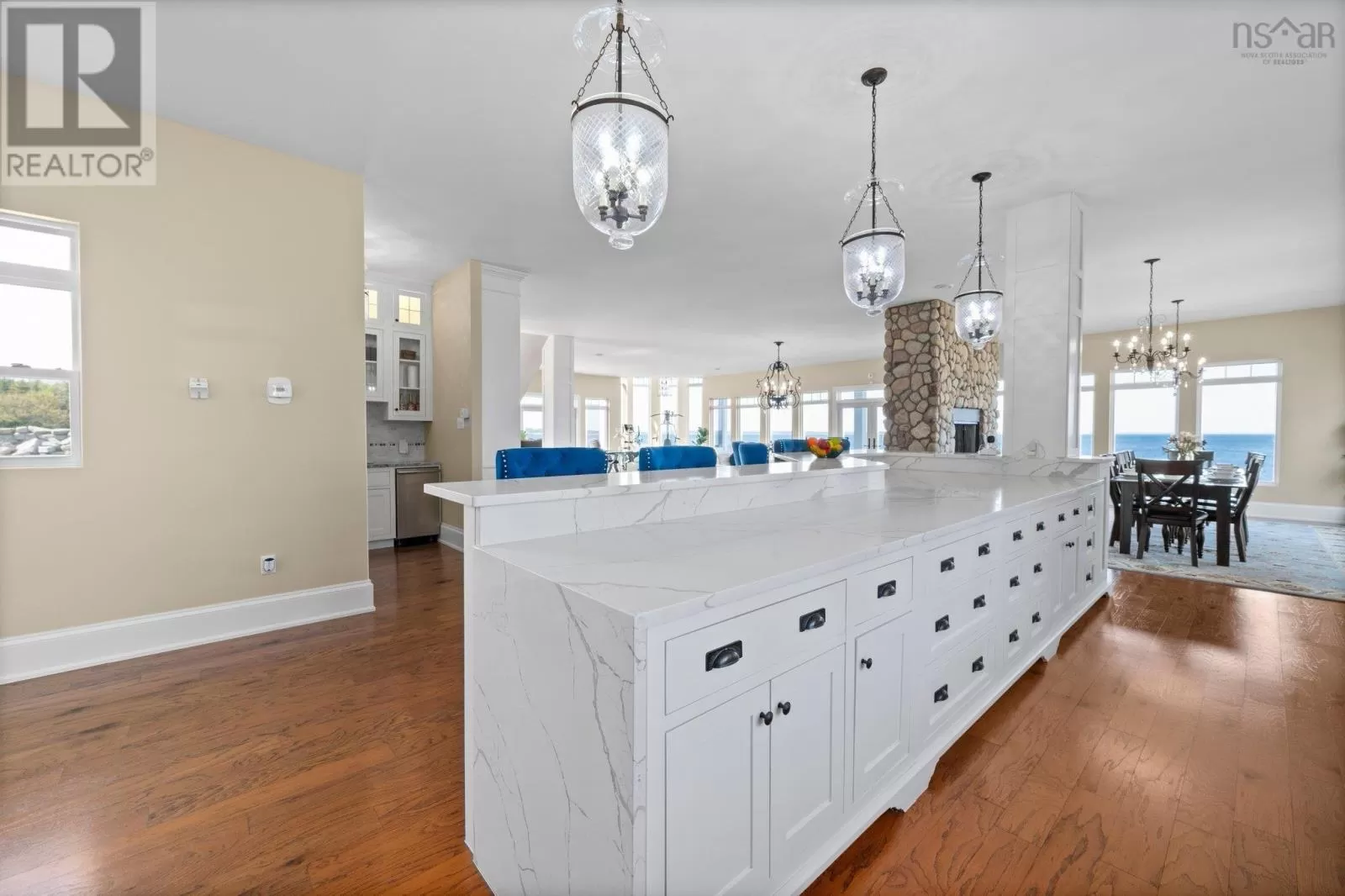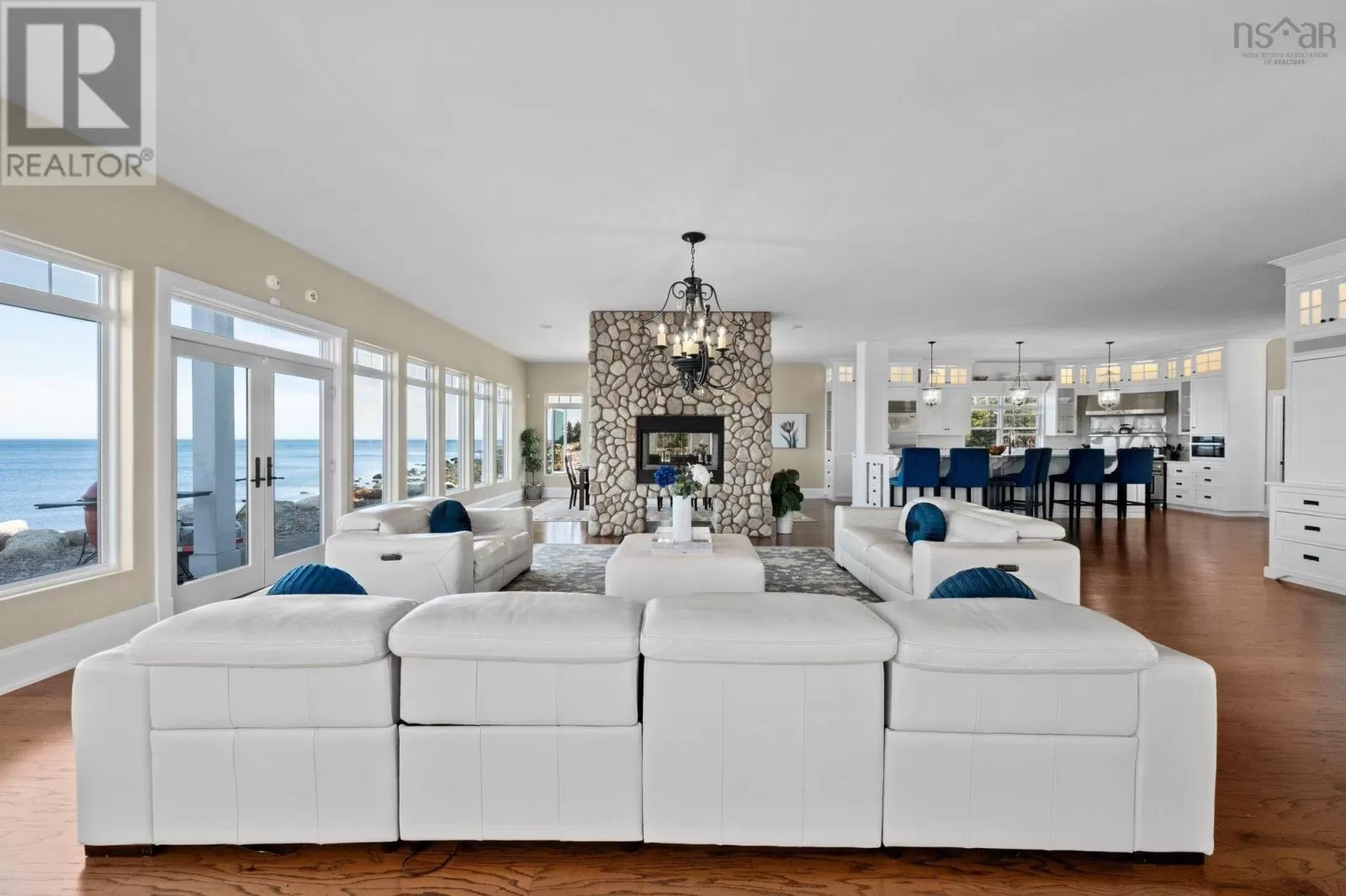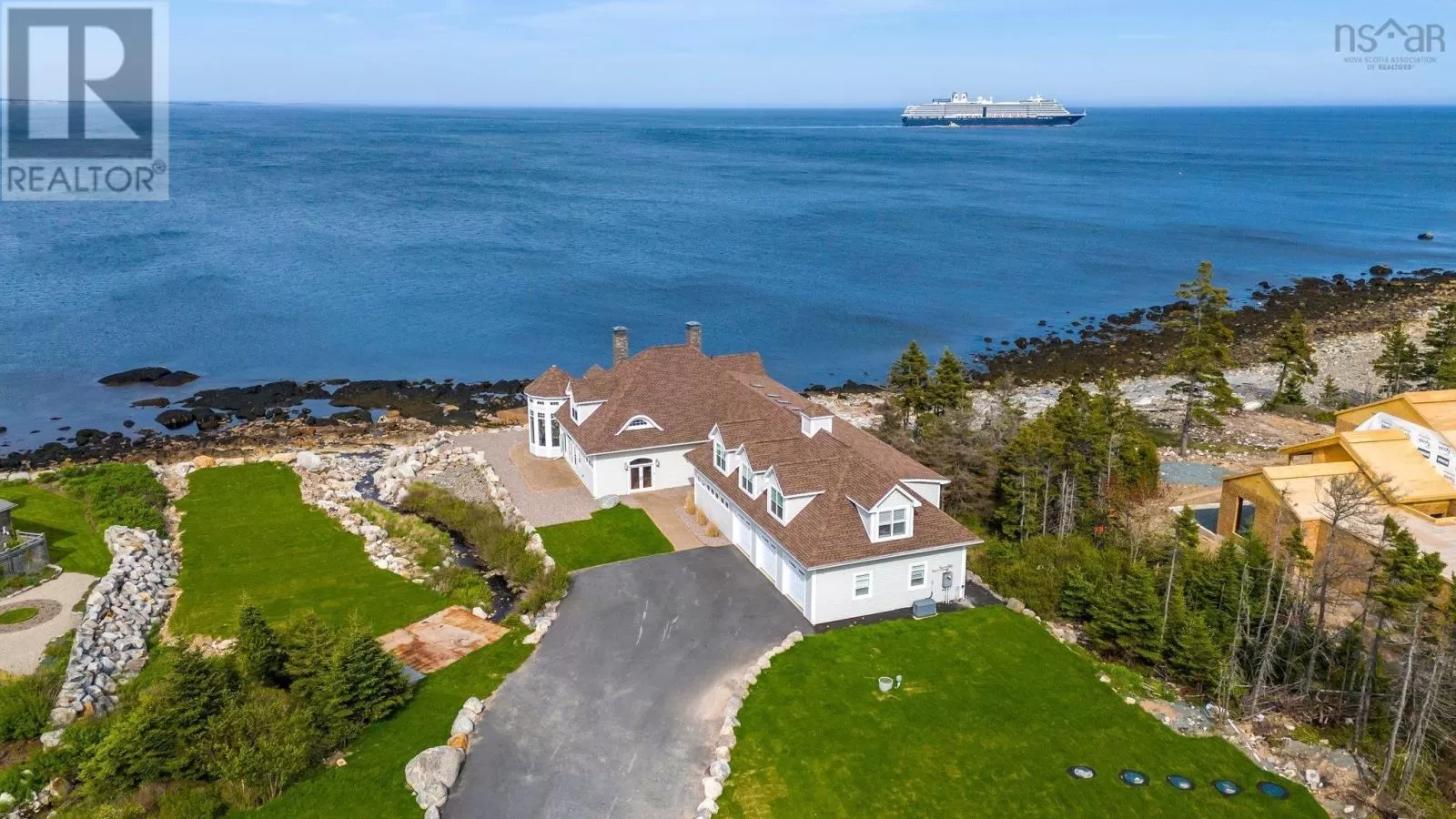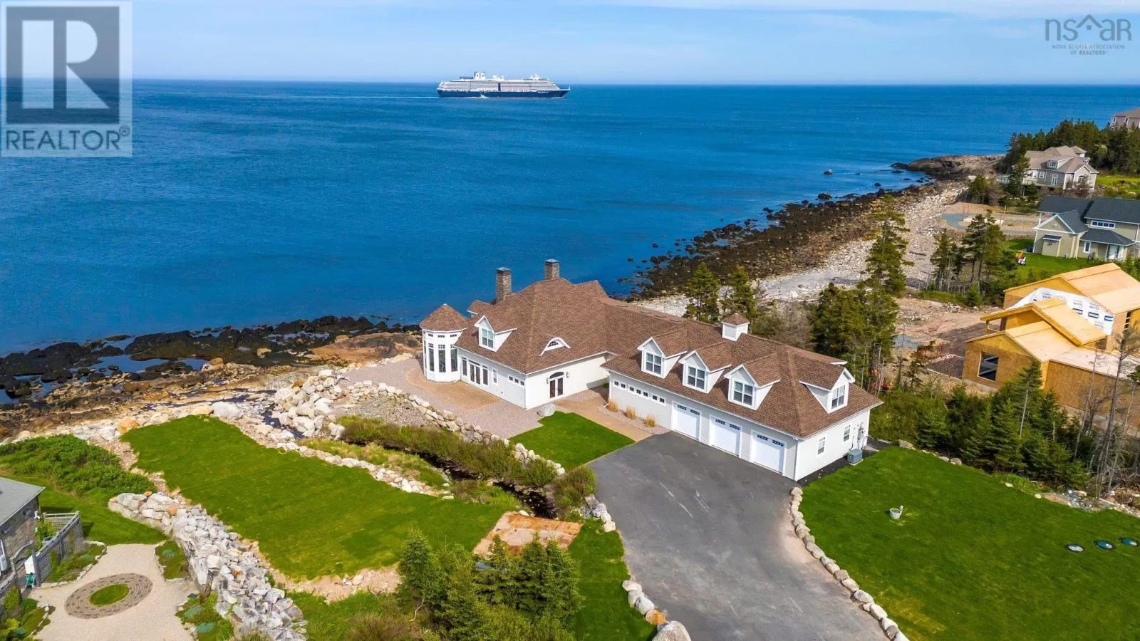 Herring Cove Rd to Ketch Harbour Rd. #446 on left side of road This magnificent 6400 sq ft estate offers an astounding 155 feet of unobstructed ocean frontage with panoramic views. As you enter the property via the private, stone-lined driveway, you'll be captivated by the beautifully landscaped grounds and breathtaking vistas. Inside, the oversized windows in the main living area ensure you're always connected to the stunning Nova Scotia shipping lanes, whether you're entertaining guests or relaxing by the double-sided wood-burning fireplace. The ultimate dream kitchen boasts custom white cabinetry, quartz countertops, a spacious island that comfortably seats six, a farmhouse sink, and high-end appliances. Adding to its appeal are a butler's pantry and a second kitchen. The main level is further complemented by an 8 x 8 ft walk-in fridge, a bonus room/den, a 2-piece bath, a mudroom, a storage room, and an attached garage featuring two separate storage areas. Ascend either the front or back staircase to the second level, where versatile open areas await your personal touch. Double doors lead to the expansive primary suite, which includes a remarkable walk-in closet with laundry, fireplace and a 6-piece ensuite. This suite also features two balconies: one overlooking the ocean and the other with a private hot tub. Three additional generously sized bedrooms, a cozy reading nook, multiple closets, and a 4-piece bath with laundry complete this level. Numerous upgrades have been completed in the last year, including leveling of the front and side retaining walls, sod/lawn replacement, installation of a water storage system with five 1500-gallon cisterns buried outside and two 750-gallon cisterns indoors, increased well flow rate, and an upgraded water filtration system. Additionally, outdoor lighting spanning approximately 750m along the oceanfront has been installed. A comprehensive list of these upgrades is available for your review. Located in the prestigious The Breakers , this exceptional property is only 25 mins form downtown. (id:27476)