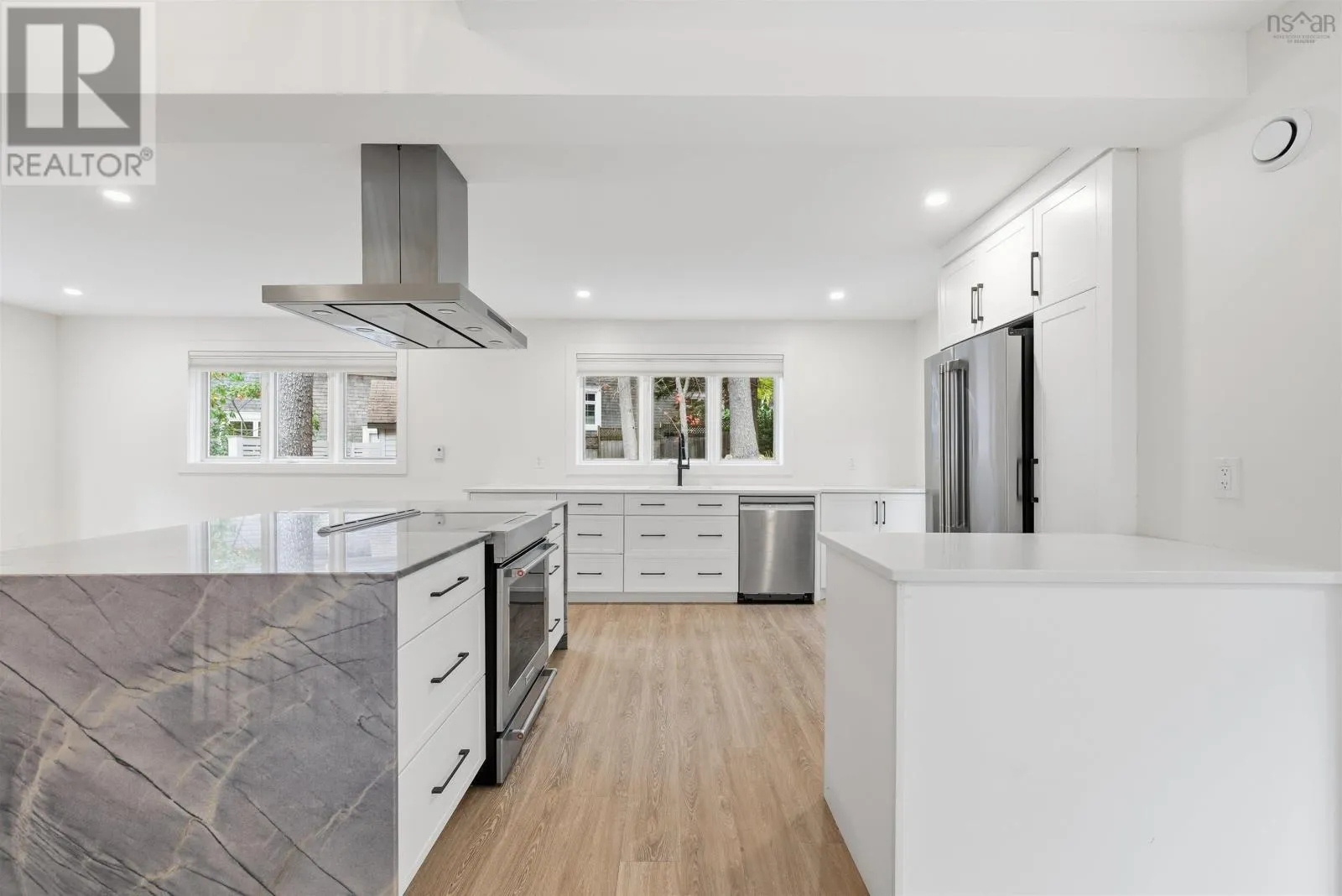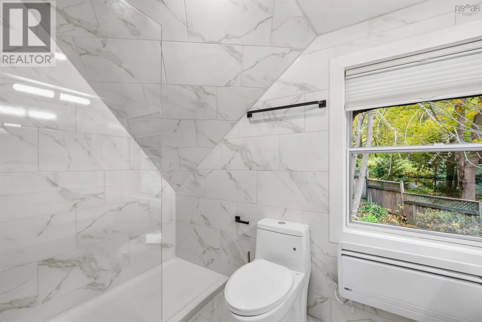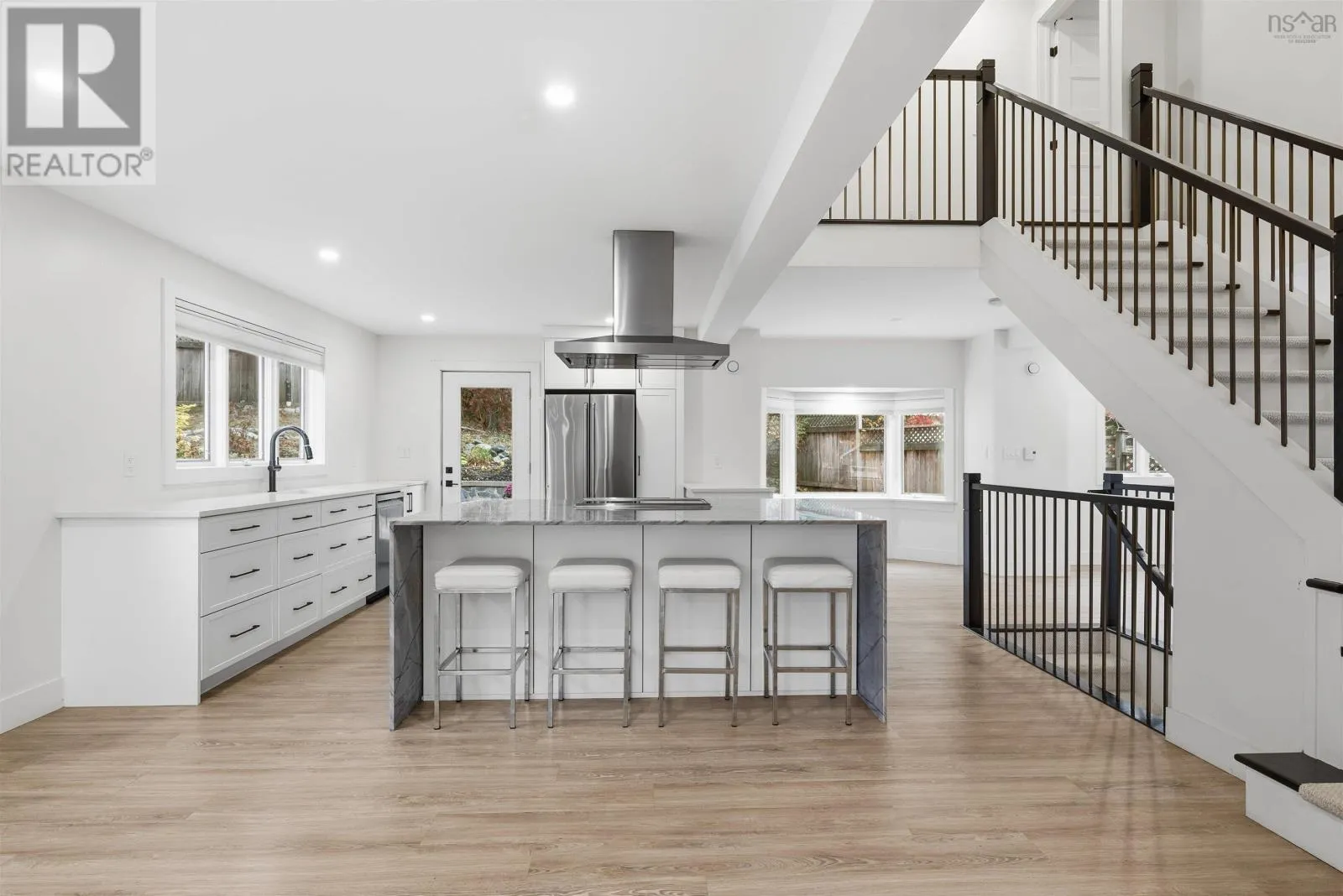 Bedford Hwy to Shore Drive Introducing this impressive property in Bedford's most desirable and prestigious neighbourhood.680 Shore Drive has a modern condo feel with all the pluses of an urban oasis. The main floors open layout flows easily and you can have a dining room in multiple areas. The living room is a stagers dream flooded with natural light from the large windows with electric fireplace and so much space. The kitchen has cupboards aplenty and a center island with a gorgeous marble waterfall countertop. Two bedrooms upstairs each with their own ensuite. The downstairs is completely finished with a rec room, large games room/flex space, full bath, separate laundry and storage room. Convenient access from kitchen to expansive back deck overlooking your low maintenance garden and fenced yard. Sweet little she shed or man cave with windows and electric fireplace. Walk to the Bedford Yacht Club and all the conveniences of Bedford. (id:27476)