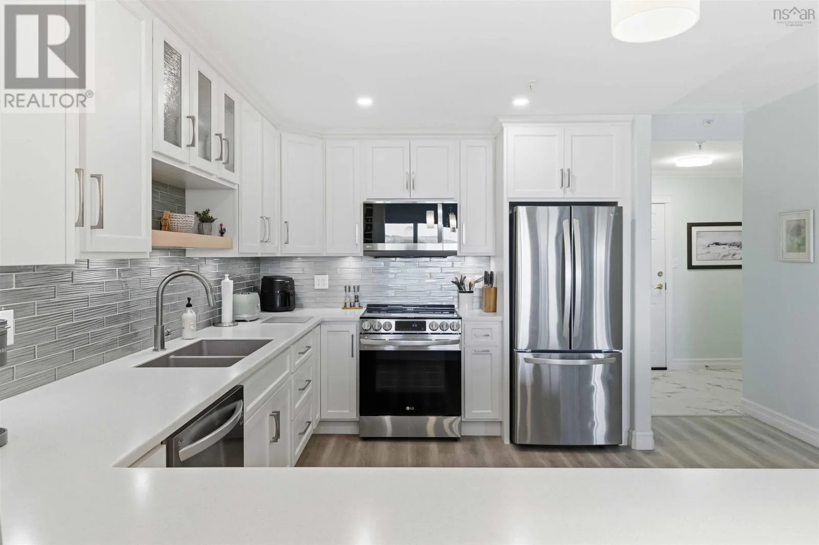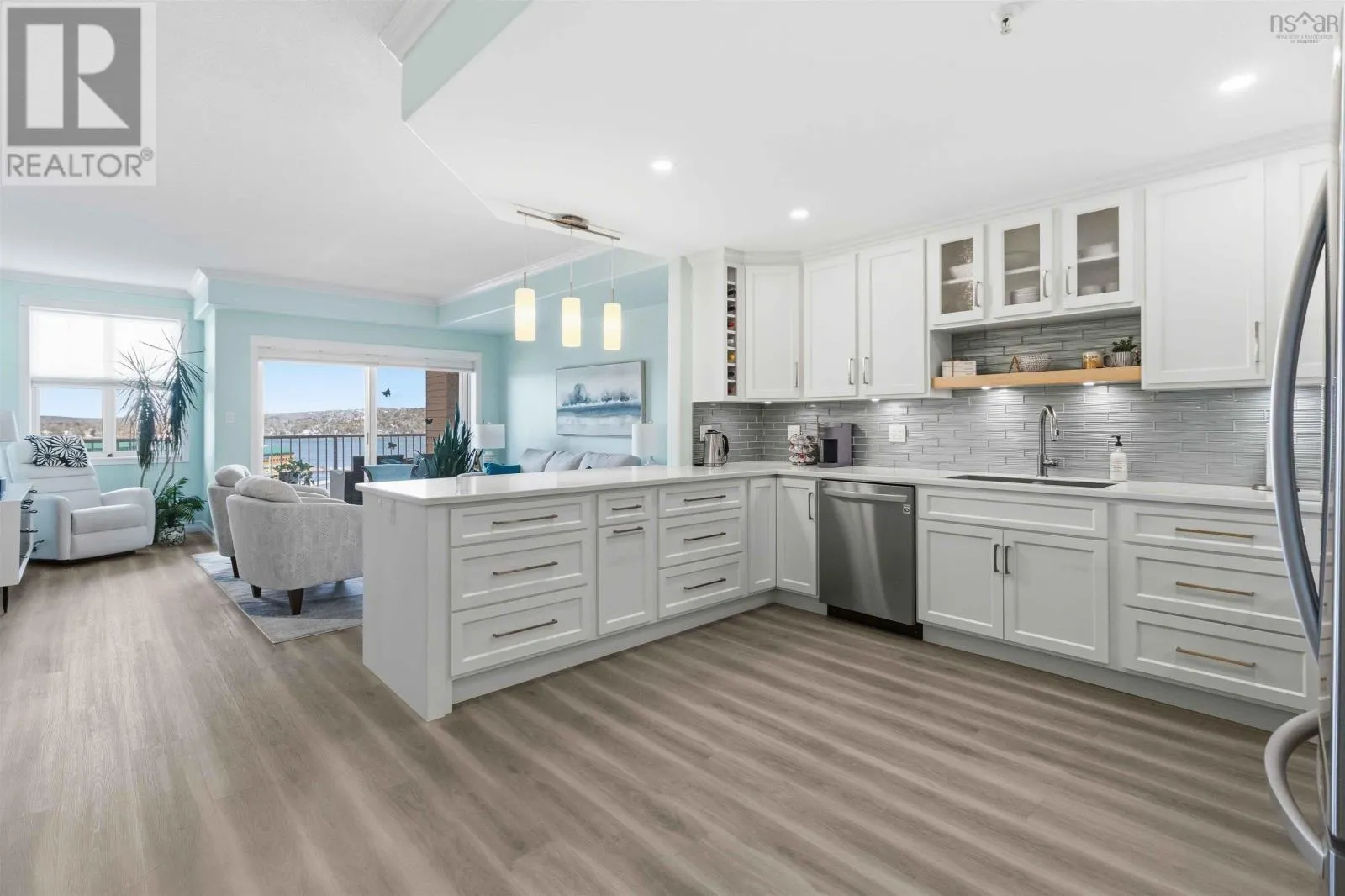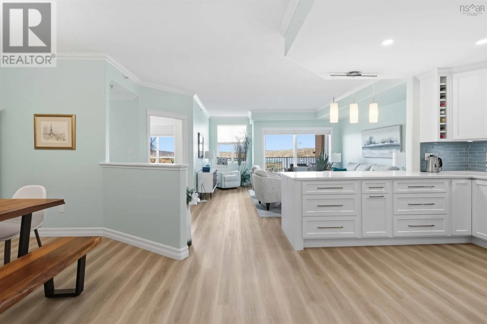 Bedford Hwy to Nelsons Landing Blvd. Welcome to 308-50 Nelsons Landing Blvd - a one-of-a-kind condo in the heart of Bedford, where thoughtful design, high-end finishes, and stunning views come together in a way that's hard to find. Renovated in 2023, this unit has been transformed into a bright, open-concept space that feels both modern and inviting from the moment you walk in. At the center of the unit is a beautifully crafted custom kitchen, built with wood framing and finished with elegant Corian countertops. It's a space that blends style and function effortlessly, opening into the main living area to create a seamless flow that's perfect for both everyday living and entertaining. New flooring runs throughout the unit, tying everything together with a fresh, cohesive feel. The primary bedroom features a custom-designed mural wall that adds character and warmth, along with a spacious walk-in closet. The ensuite bath has been upgraded, complete with a tiled walk-in shower and a generous soaker tub - ideal for unwinding at the end of the day. You'll enjoy the in-unit laundry room and separate dining area for more formal meals. Beyond the interior, this condo continues to impress with features that make daily life easy and comfortable. The deck/patio was refinished just last fall, offering a refreshed outdoor space to relax and take in the incredible views of the Bedford Basin, plus a generous storage room conveniently located next to the underground parking space. Residents enjoy access to a community room, gym, library, workshop, and even a car wash bay. There's an active social committee that organizes events, making it easy to feel part of a welcoming community. For visiting friends and family, a guest suite is also available within the building. With its extensive upgrades, unique design elements, and breathtaking water views, this condo offers a rare opportunity to own something truly special in Bedford. It's not just a place to live - it's a place to enjoy, relax, and feel at home. (id:27476)