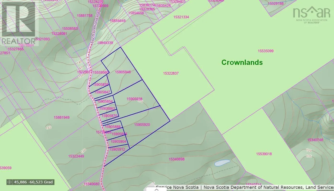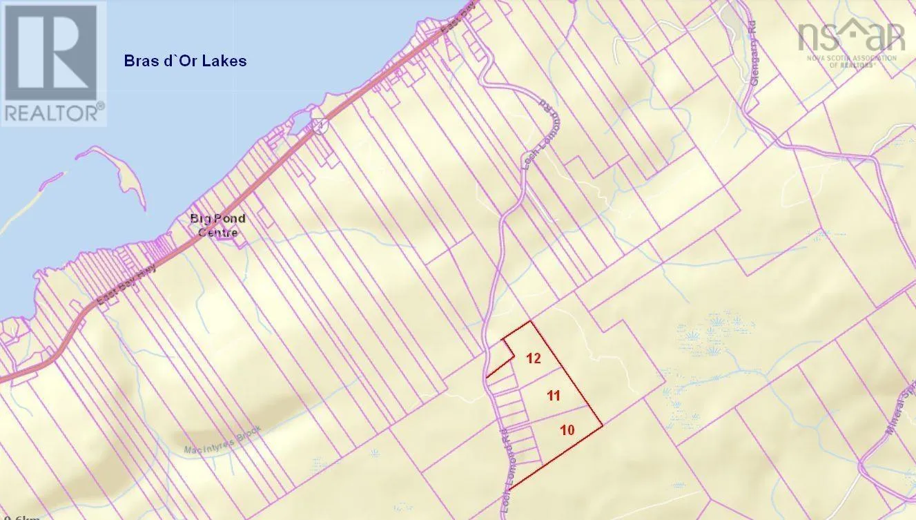 From Sydney take Hwy 4 to Big Pond then turn left onto Loch Lomond Rd. Watch for signs. You will find this attractive new development of 12 affordable building lots in the beautiful Cape Breton location of East Bay Hills in Big Pond overlooking the world-famous Bras dOr Lake. The approximately 118 Acre sub-division is located just under three kilometers from Highway 4 (St. Peters - Sydney) on Loch Lomond Road ("public road") and offers a selection of different sized "building lots" from 3.5 acres to 28 acres. The driveway approvals for all lots are already done. All properties have been surveyed and can be accessed directly from the public road. The gravelled Loch Lomond Road is cleared in winter and maintained by the province. The street is also listed in the province of Nova Scotia's current high-speed Internet ("fibre optic" / fiber optic cable), so that adequate coverage is guaranteed. Power supply has been installed along the street directly in front of the properties. It is only a 5 minute drive to beautiful Big Pond Beach on the Bras dOr Lake. The well-known Ben Eoin golf resort, marina, and ski club are only about 15 minutes away. All amenities are available only 30 minutes away in Sydney. The popular harbour & canal town of St Peters at the southern end of the Bras dOr Lake is only 35 minutes away. (id:27476)