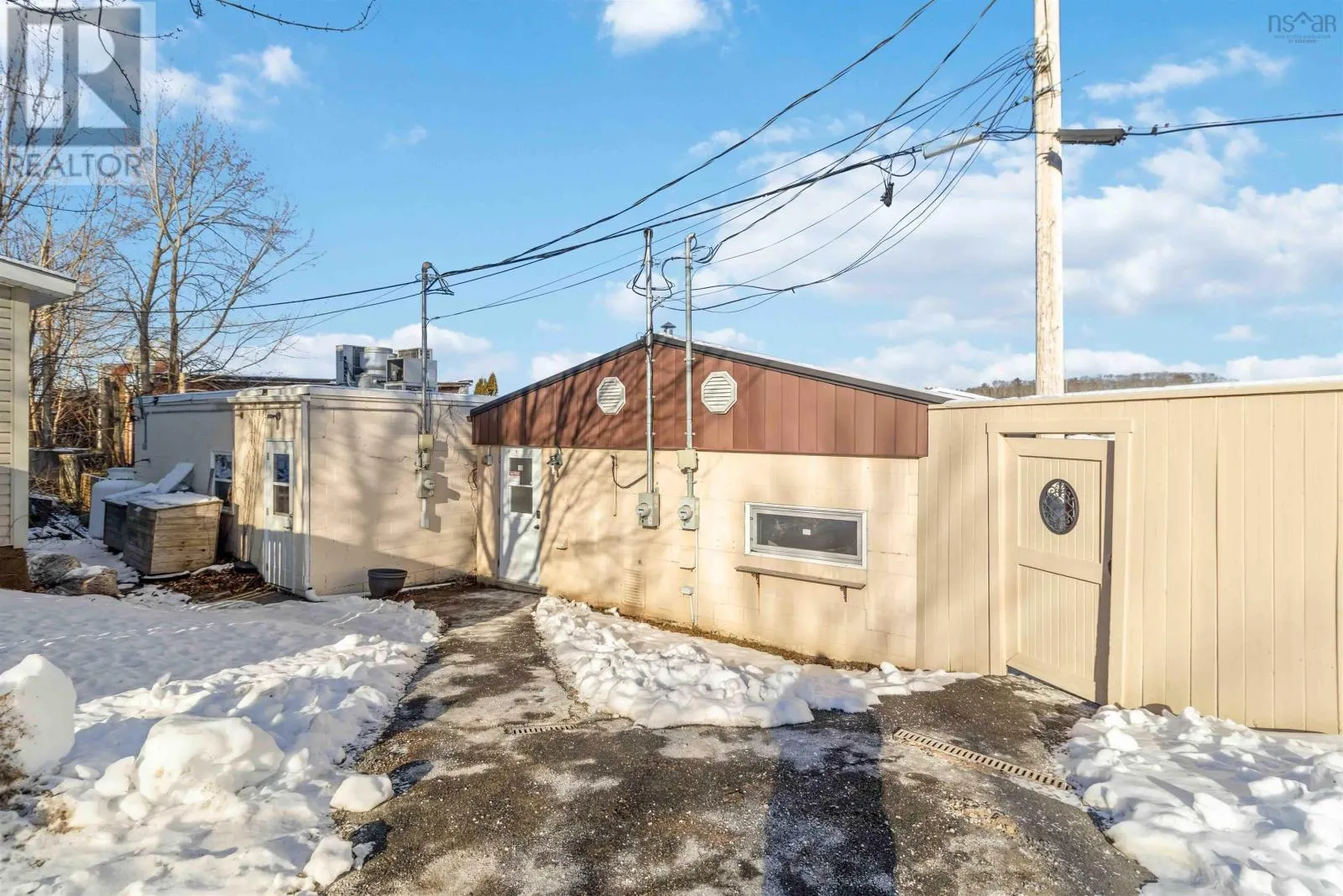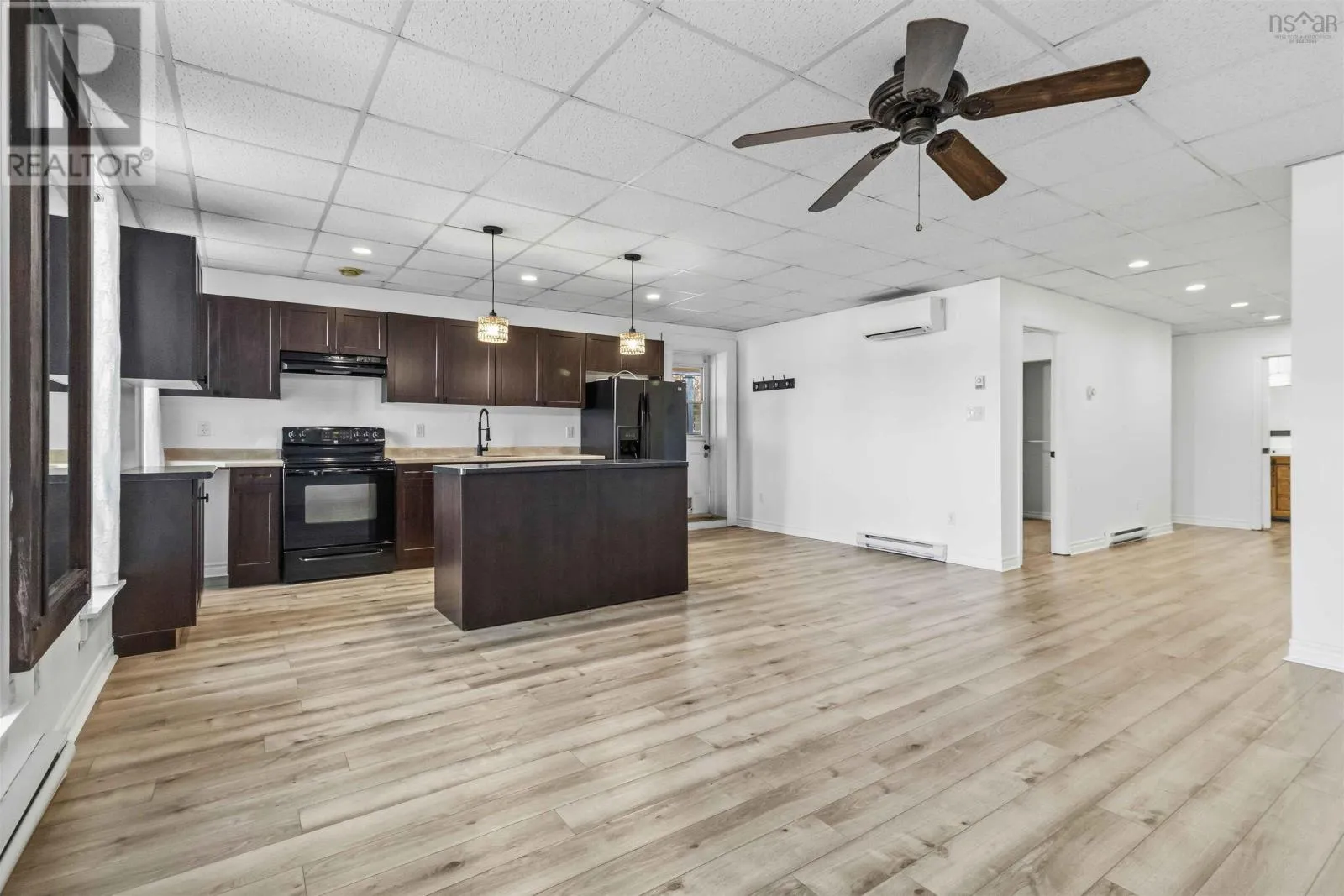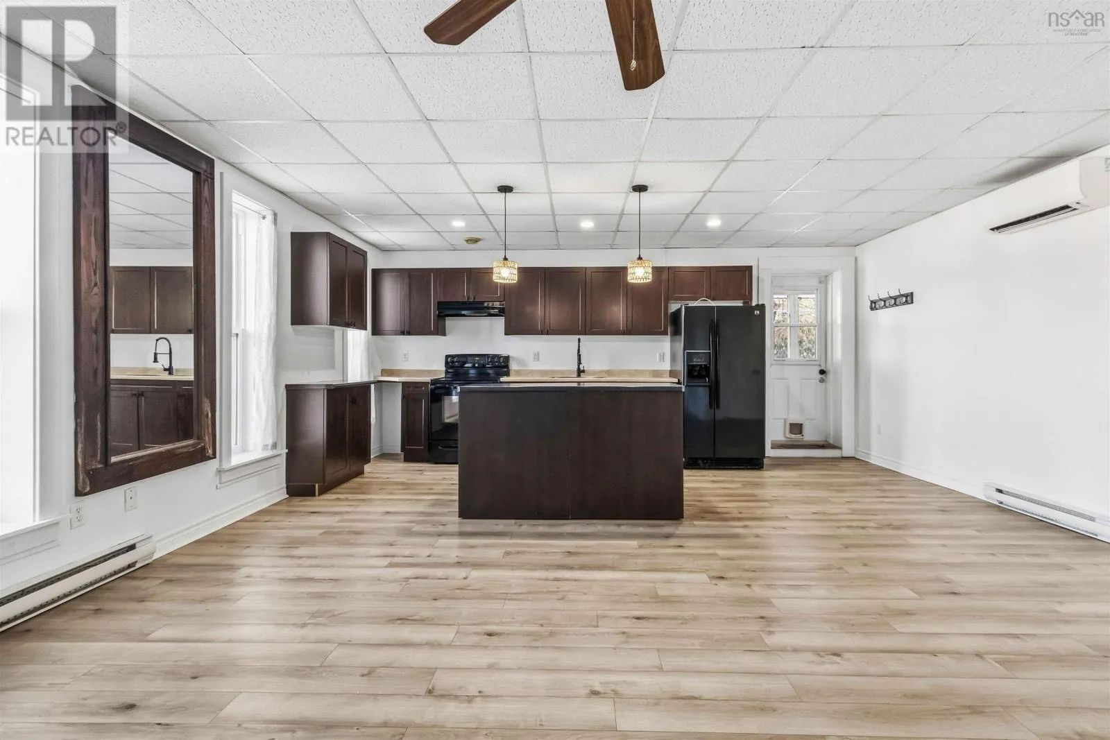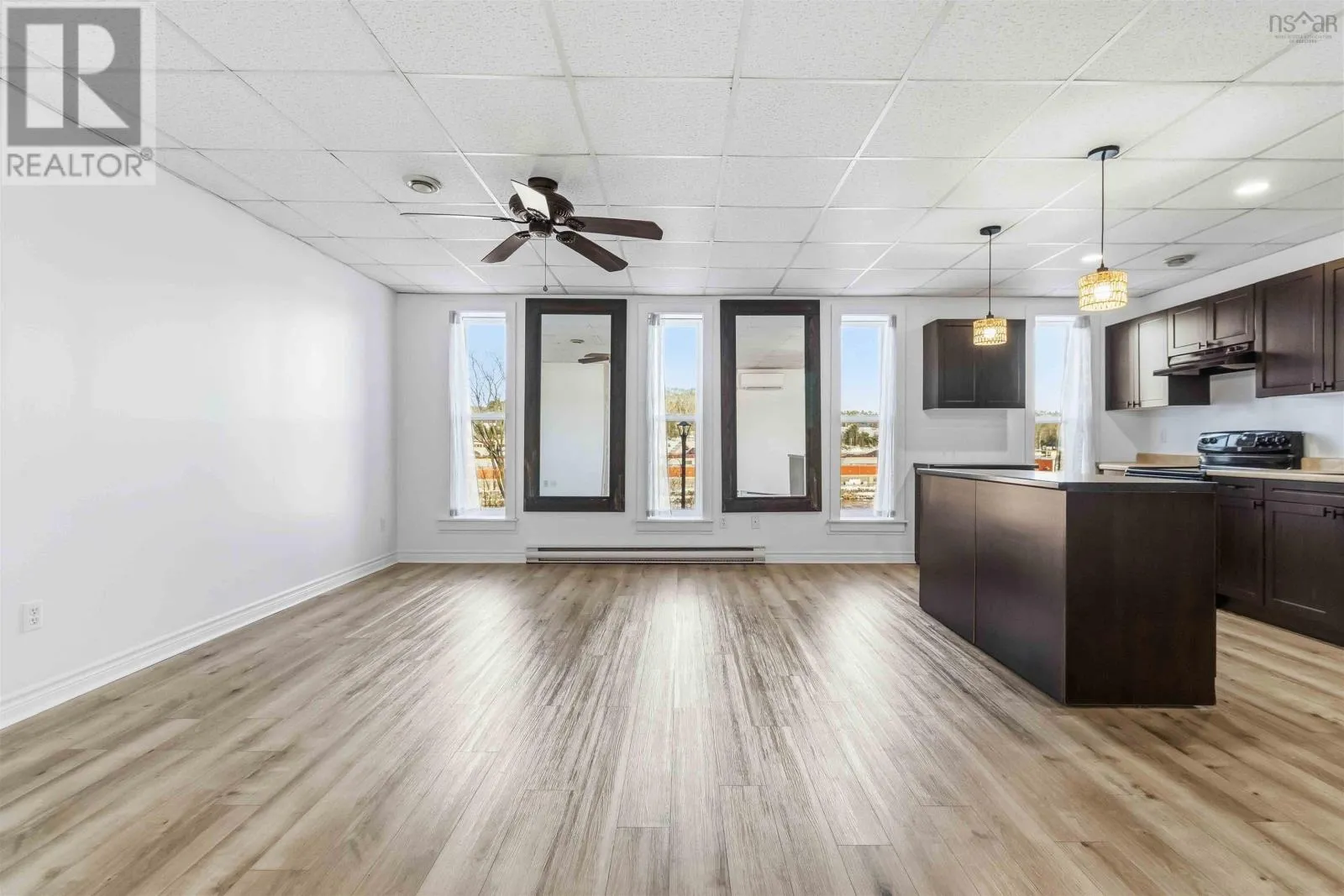 Corner of King Street & Dufferin Street, Town of Bridgewater. Renovated mixed-use commercial/residential building located on high-traffic King Street in downtown Bridgewater, within walking distance to shops, restaurants, professional services, and other key amenities. The ground-level commercial unit offers approximately 1,100 sq.ft. with prominent storefront display, currently owner-occupied as a hair salon and tanning studio. Tanning beds may be negotiated with the sale; hair salon equipment is excluded. The space includes a public washroom with washer and dryer, rear access, and on-site parking - an extremely rare and highly valuable feature in this location - along with 12'x16' and 10' x 12' storage sheds. The commercial space will be available for immediate lease upon closing. The second-floor residential unit also spans approximately 1,100 sq. ft. and underwent major renovations completed in late 2025. With its own private entrance, the unit features an open-concept layout with two bedrooms and one bath. The modern kitchen includes matching appliances including a brand new dishwasher, a large island, and opens to a covered deck ideal for enjoying views of the LaHave River. The residential unit is currently under a periodic year-to-year lease which can be terminated with 2-months notice. The building received a full exterior facelift in 2018 including new windows, a new metal roof and updated electrical panel in 2024. This is a strong investment opportunity in a sought-after, high-exposure, walkable downtown location with two easily leasable units - further strengthened by the rare inclusion of on-site parking. It is equally well-suited for an owner-occupier seeking a centrally located residence with river views while operating a business with excellent street visibility below. Beyond its current configuration, the property offers significant potential for redevelopment into additional revenue-generating residential units, subject to zoning and approvals. Consult the associated documents for more details. (id:27476)