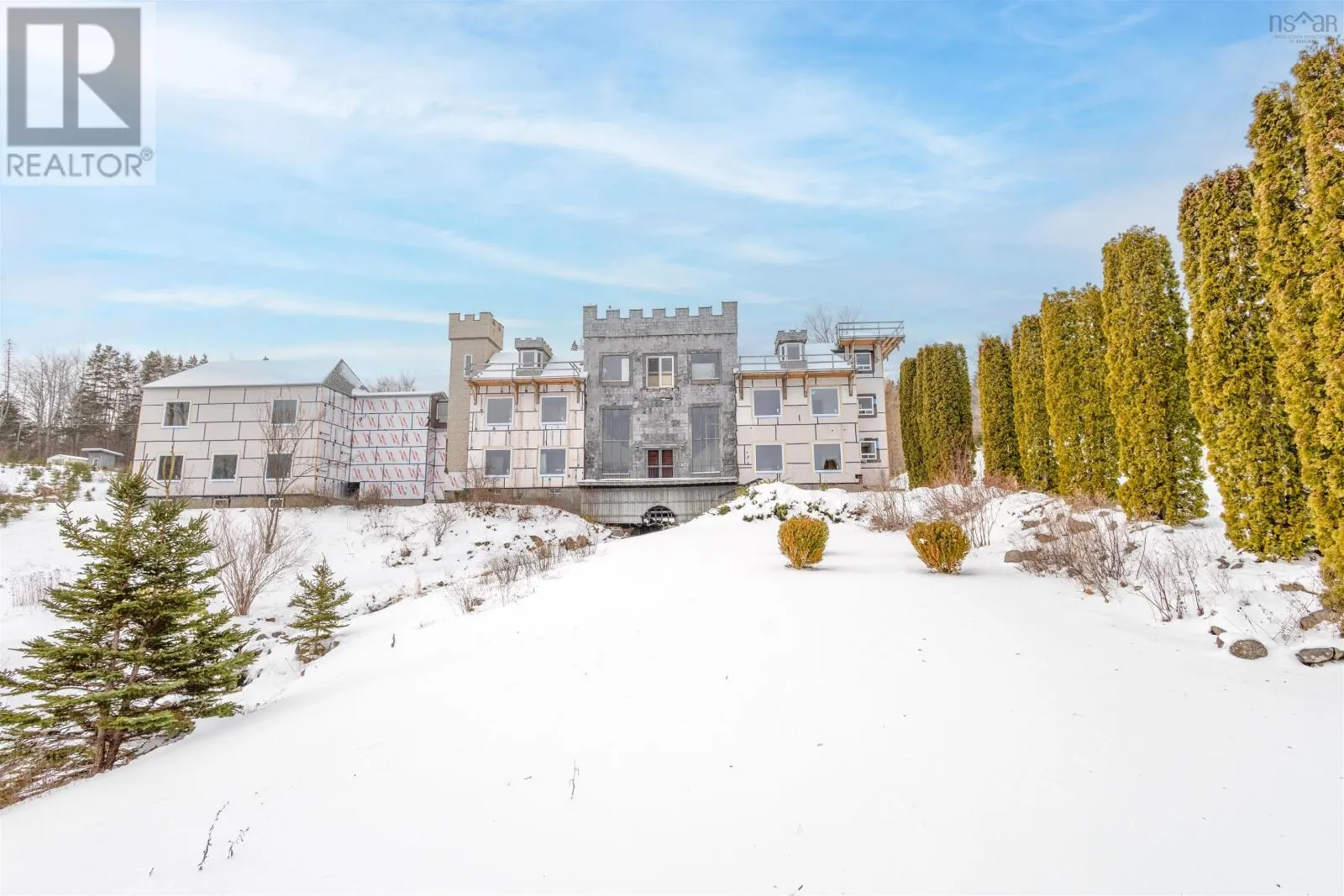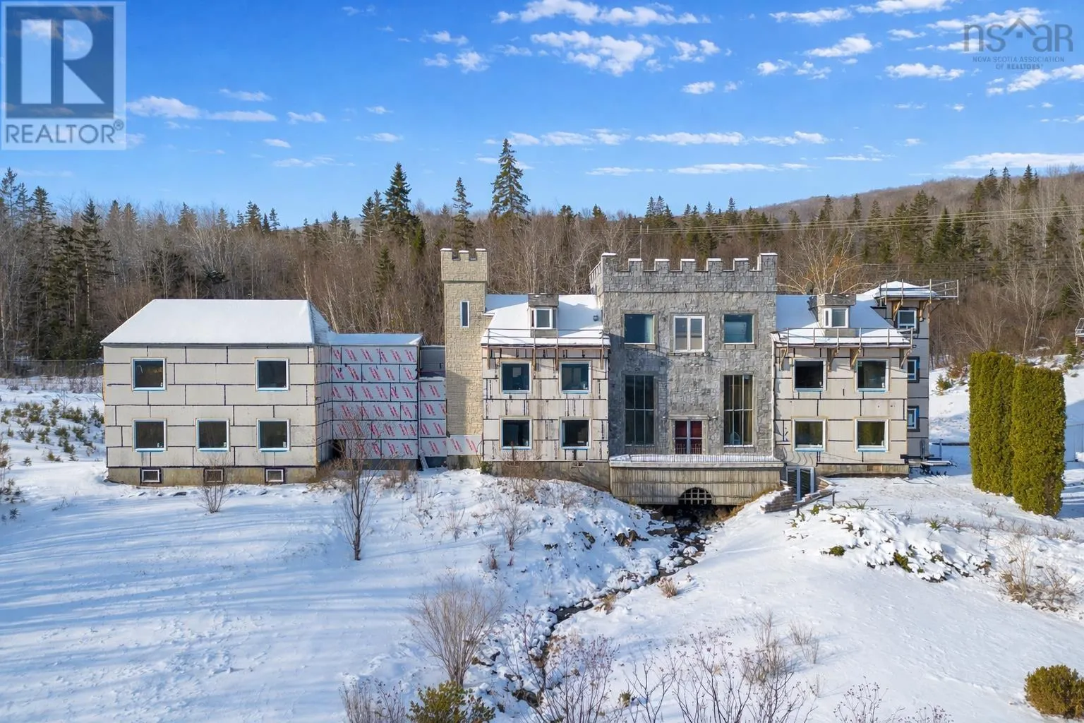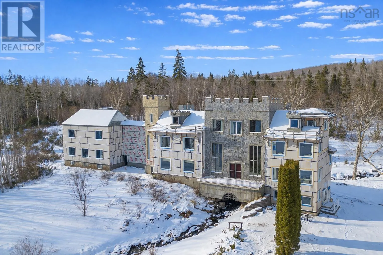 TC Highway 105 in Bucklaw. CIVIC 11980. GATED. A Cape Breton Castle! This extraordinary property presents a rare opportunity to complete and reimagine a landmark estate on almost 160 acres in Aberdeen, Cape Breton Island. Built in 1992, the castle-inspired structure is set within a striking natural landscape, highlighted by a rushing brook through the grounds, creating a truly unique atmosphere. Originally designed with commercial use in mind, the property has successfully operated as a luxury bed and breakfast and offers strong future potential as a retreat centre, boutique resort, or private estate. The expansive layout spans multiple levels and includes large common areas, 12 guest suites, a commercial kitchen, dining space, and recreational areas, reflecting the scale and ambition of its original vision. Significant progress has been made under current ownership, with major construction completed & extensive landscaping. Most of the exterior walls have been fully replaced with new studs, sheathing and most new windows installed, apart from the 'Great Room', providing a solid and modernized building envelope including most new roofing shingles. Interior finishing, including flooring, drywall in select areas, and painting, allowing a new owner to customize the final design and bring the project to completion. With the most intensive structural work behind you, the property is well positioned for transformation into an impressive destination. Surrounded by acreage, natural water features, amazing water views and access to the Bras dOr Lake, this is a rare offering for a buyer prepared to invest in completing a truly iconic Cape Breton property with exceptional scale and future potential. Purchase options could include a partnership opportunity with current owner who has an in-depth & profitable business plan along with a vision and passion for the property that was thought-out with the sellers late partner. A Cape Breton Castle could be your family legacy! (id:27476)