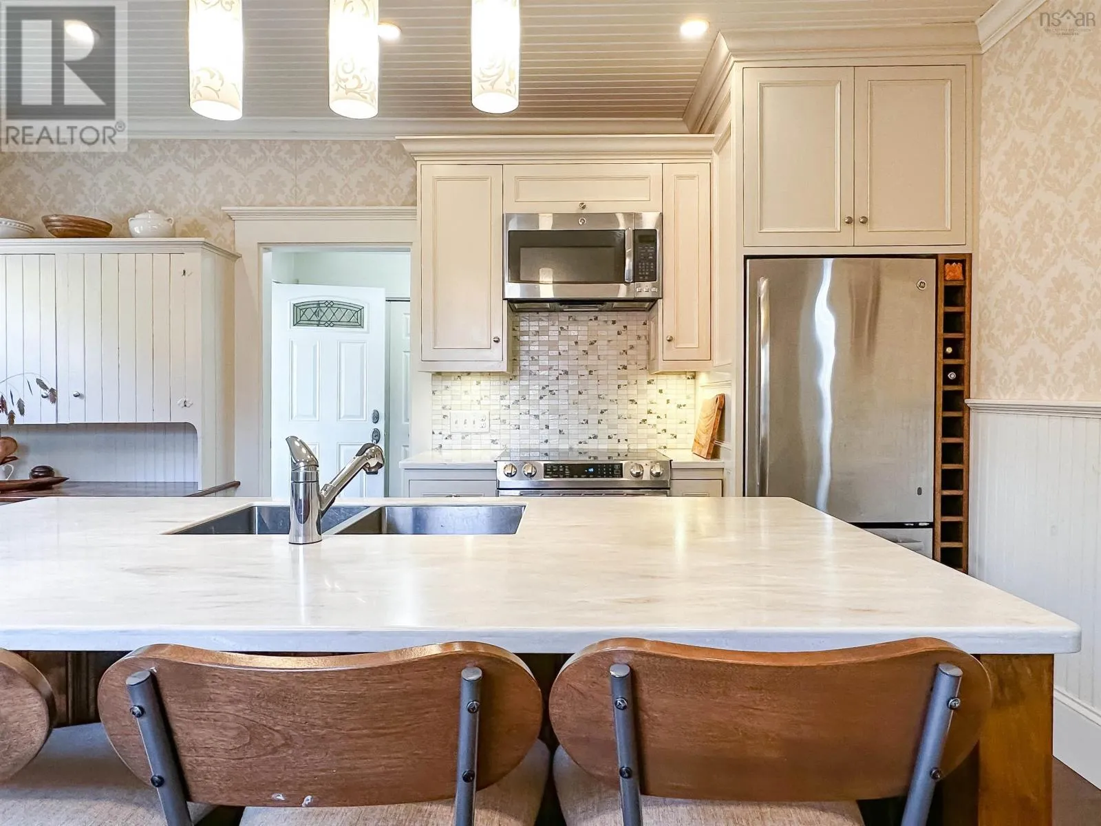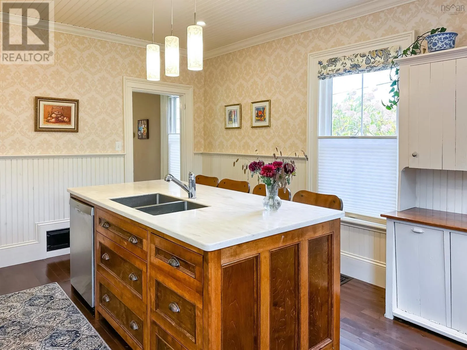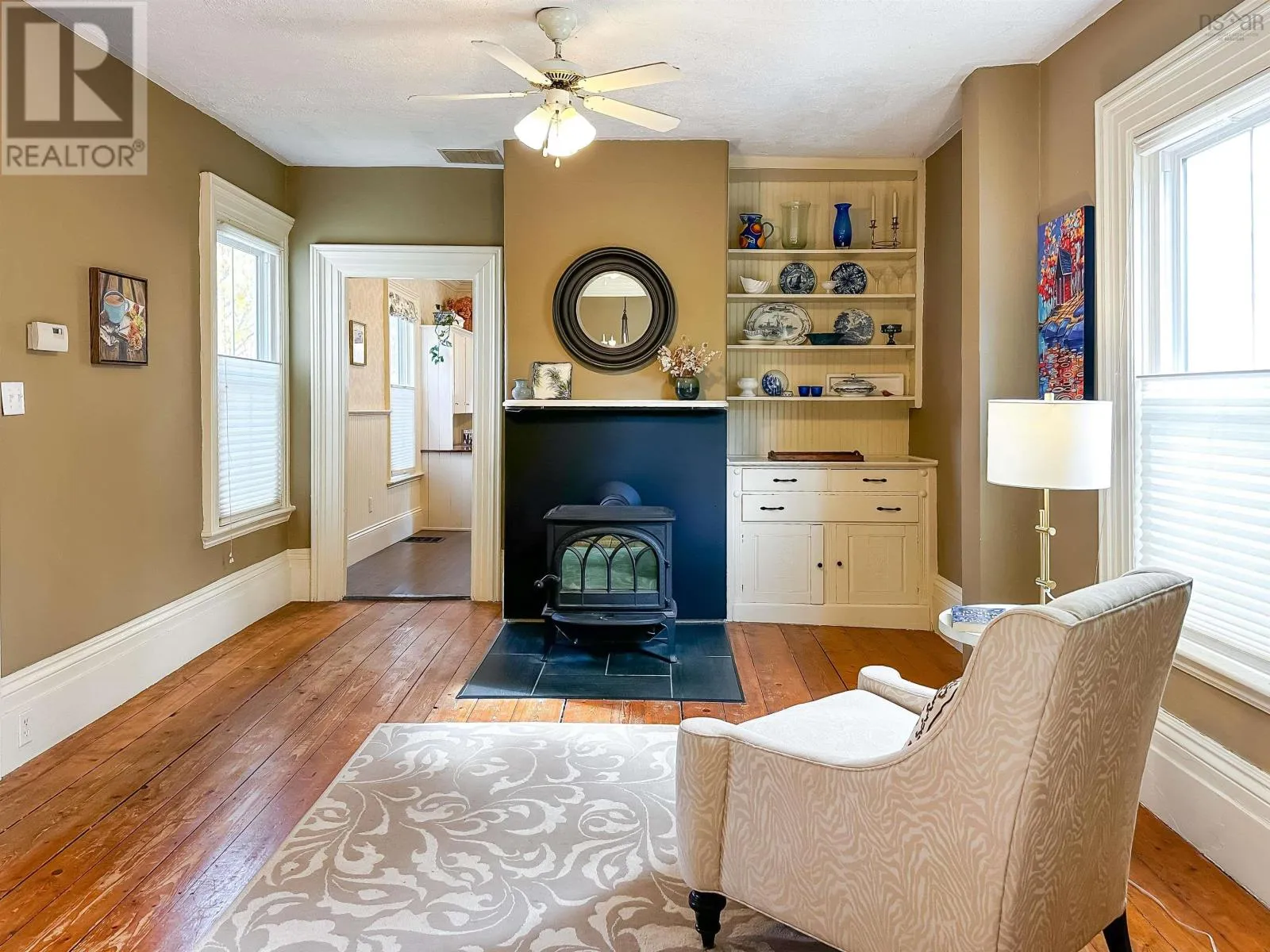 From Hwy 101 take exit 11 (Wolfville/Greenwich) and head North on 358. Travel towards Canning, turn left onto Hwy 221, property on left. Nestled in the vibrant village of Canning, this beautifully maintained 2-storey home offers the perfect blend of character, comfort, and modern updatesall within walking distance of local shops, cafes, and both the elementary and high schools. Step inside to discover a thoughtfully designed main floor layout featuring a welcoming front foyer, a cozy living room, and a spacious family room anchored by a wood stoveperfect for chilly evenings. The elegant, renovated kitchen (2018) is a true standout, complete with a custom island, Corian countertops, and a layout thats ideal for family meals and entertaining. A formal dining room opens to the back patio and garden area, offering seamless indoor-outdoor living. You'll also find a convenient back entrance with laundry and a half bath, tucked away for practicality and ease. Upstairs, you'll find four bedrooms and a full 4-piece bathroom, ideal for growing families or those needing extra space for guests or a home office. Original features such as the curved staircase and historic "marble" wall finish add unique character and timeless appeal throughout the home. Additional features include metal roof (2018), updated windows (approx. 10 years ago) and Single detached garage. This home is a rare find in a welcoming community, offering a lifestyle of comfort, charm, and convenience. Whether you're relaxing by the fire or enjoying the local shops, cafés and restaurants, this property truly offers the best of the Annapolis Valley. Just a 10-minute drive to Wolfville and quick access to the highway, this location strikes the ideal balance between small-town living and urban convenience. (id:27476)
