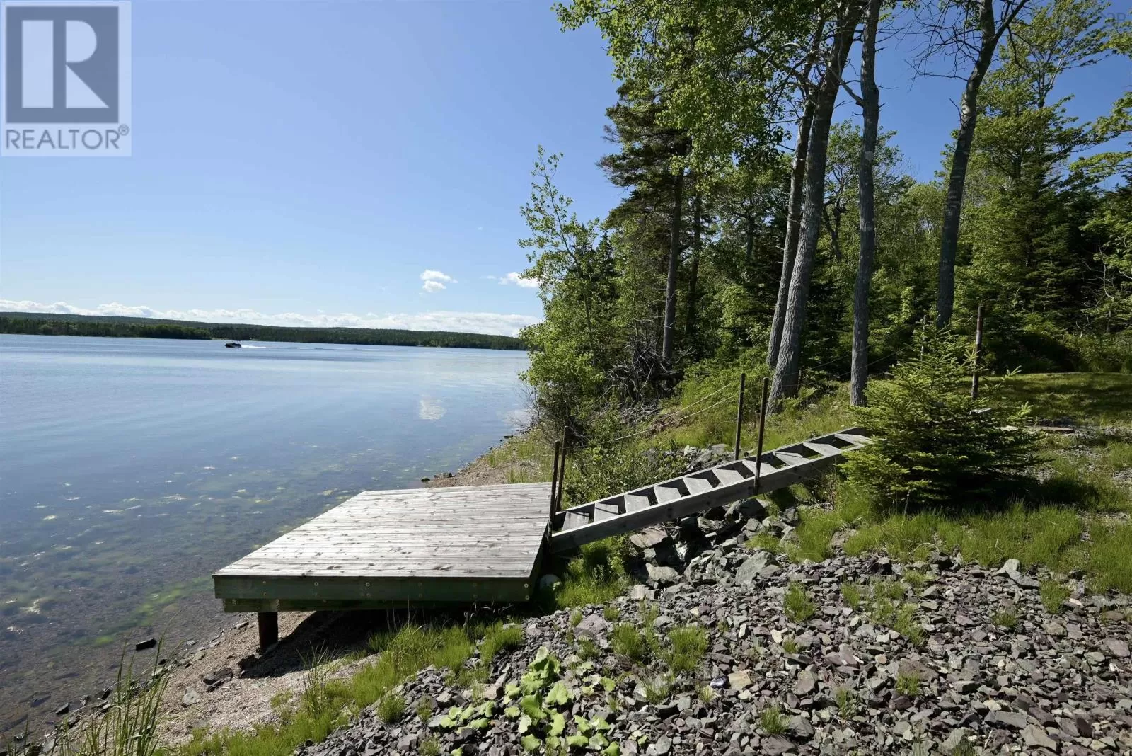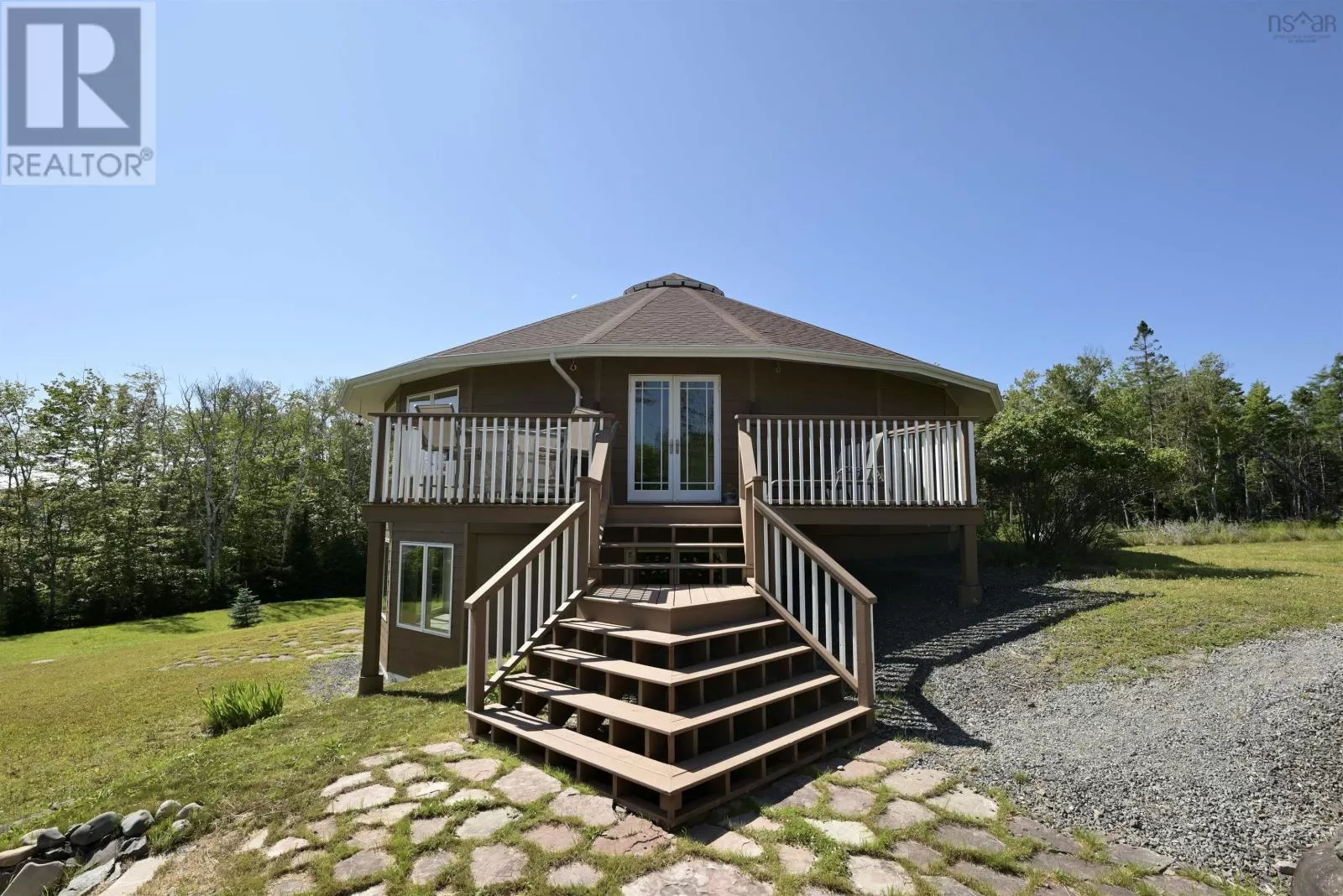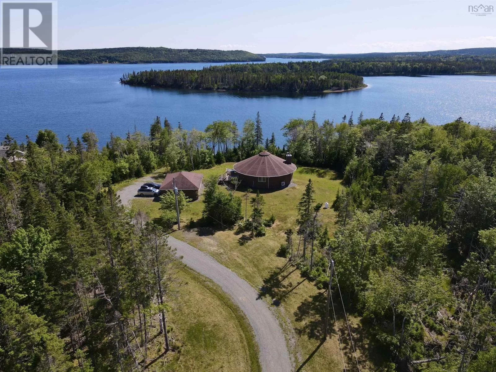 Take West Bay Highway from St Peter's. Take a right onto Cedar Drive. you will see Cape George Estates Sign. Take a right onto Maple Drive. Sign at road. Welcome to the Round House of Cape George Estates, an exceptional Deltec-designed, 18-sided home on 2.7 acres with 200 feet of deep, sheltered waterfront on the Bras dOr Lake. With seven south-facing sides of Marvin Integrity windows on both levels, the home is filled with natural light and offers sweeping water views. The Bras dOr here is remarkably deep - large enough to even accommodate a 140-foot yacht that came through St. Georges Channel last year - making it a boaters dream. Inside, 3,350 square feet of living space showcase high-end finishes and a thoughtful layout. On the upper level, youll find a spacious great room with 3/4" solid maple flooring, cedar ceiling, and a stone fireplace with gas insert and blower. The kitchen offers quartz countertops, gas range, French-door refrigerator, pantry with chest freezer, and extensive quality cookware. This level also features a large primary bedroom with a stunning ensuite bathroom, a generous walk-in pantry, and a convenient half bath. Additional highlights include a wet bar, stereo sound system, central vacuum, dedicated laundry room, and climate-controlled attic. It is the perfect space for entertaining guests and enjoying the views. A custom iron spiral staircase leads down to the lower level, where a bright, above-grade seating area opens to two additional bedrooms and a full bathroom. A Napoleon woodstove adds warmth and character. The home includes a brand-new Move Air heat pump system (2024, with 10-year warranty) providing whole-home heating and cooling. Outside, enjoy a 160-sq-ft deck with views of sailboats in the channel, a detached 26' x 32' two-car garage with extra storage, a gravel RV parking area with 110V hookup, and a marine-treated shore platform with permits for a floating dock and mooring. This remarkable property comes fully furnished with beautiful solid hardwood furniture offering a true turnkey opportunity to own on one of Cape Bretons most unique and admired water (id:27476)