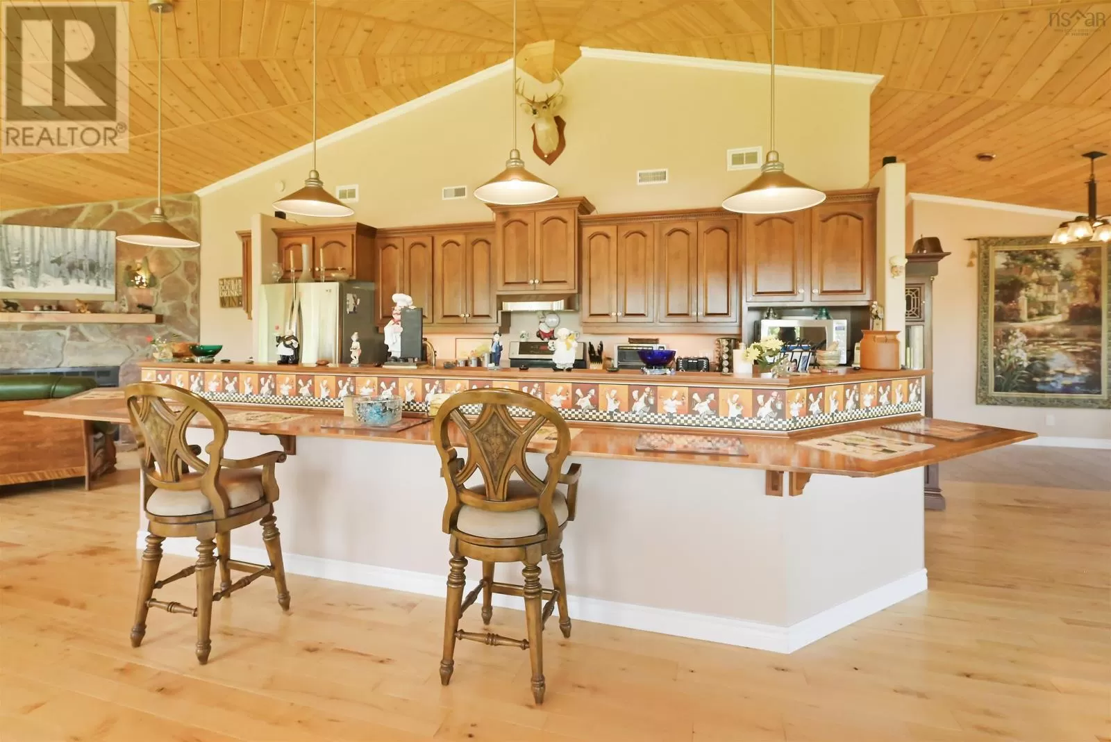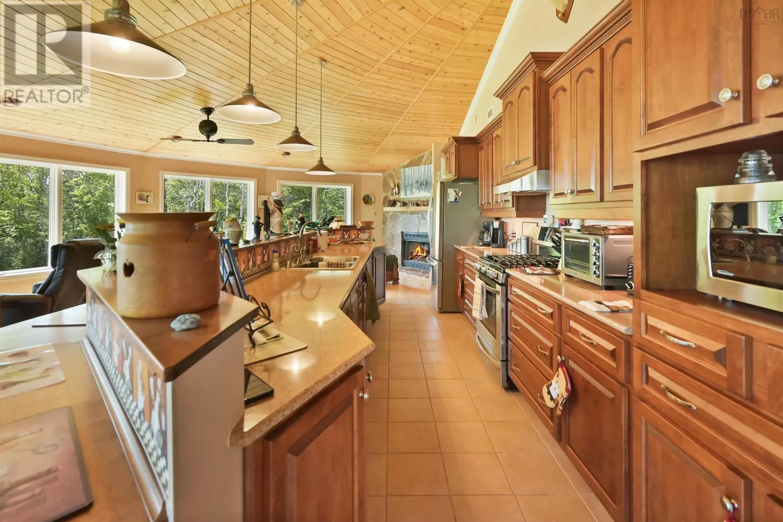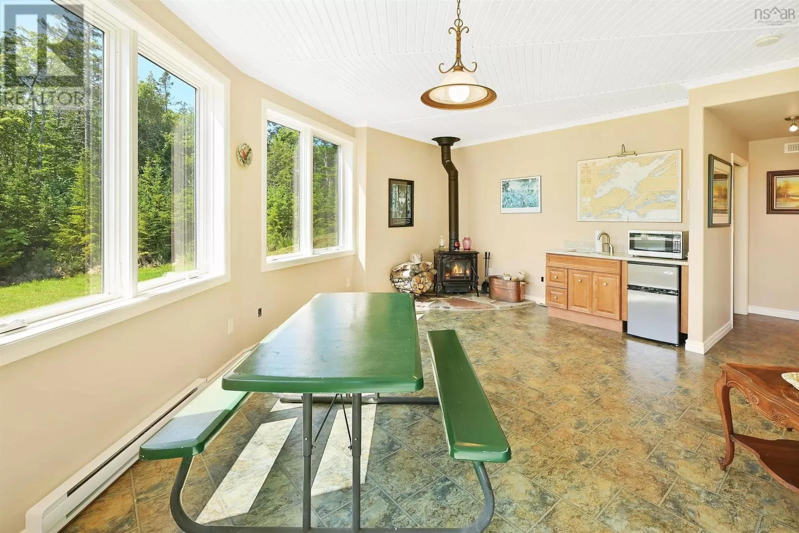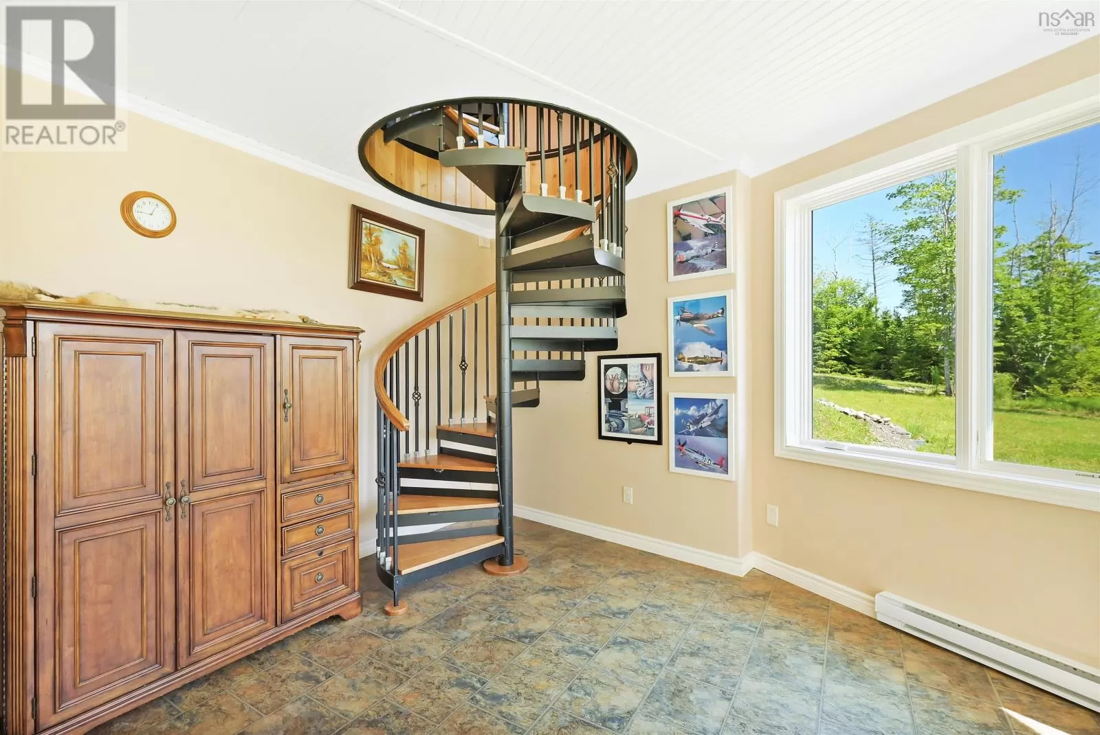 Take West Bay Highway from St Peter's. Take a right onto Cedar Drive. you will see Cape George Estates Sign. Take a right onto Maple Drive. Sign at road. Welcome to the Round House of Cape George Estates, an exceptional Deltec-designed, 18-sided home on 2.7 acres with 200 feet of deep, sheltered waterfront on the Bras dOr Lake. With seven south-facing sides of Marvin Integrity windows on both levels, the home is filled with natural light and offers sweeping water views. The Bras dOr here is remarkably deep - large enough to even accommodate a 140-foot yacht that came through St. Georges Channel last year - making it a boaters dream. Inside, 3,350 square feet of living space showcase high-end finishes and a thoughtful layout. On the upper level, youll find a spacious great room with 3/4" solid maple flooring, cedar ceiling, and a stone fireplace with gas insert and blower. The kitchen offers quartz countertops, gas range, French-door refrigerator, pantry with chest freezer, and extensive quality cookware. This level also features a large primary bedroom with a stunning ensuite bathroom, a generous walk-in pantry, and a convenient half bath. Additional highlights include a wet bar, stereo sound system, central vacuum, dedicated laundry room, and climate-controlled attic. It is the perfect space for entertaining guests and enjoying the views. A custom iron spiral staircase leads down to the lower level, where a bright, above-grade seating area opens to two additional bedrooms and a full bathroom. A Napoleon woodstove adds warmth and character. The home includes a brand-new Move Air heat pump system (2024, with 10-year warranty) providing whole-home heating and cooling. Outside, enjoy a 160-sq-ft deck with views of sailboats in the channel, a detached 26' x 32' two-car garage with extra storage, a gravel RV parking area with 110V hookup, and a marine-treated shore platform with permits for a floating dock and mooring. This remarkable property comes fully furnished with beautiful solid hardwood furniture offering a true turnkey opportunity to own on one of Cape Bretons most unique and admired water (id:27476)
