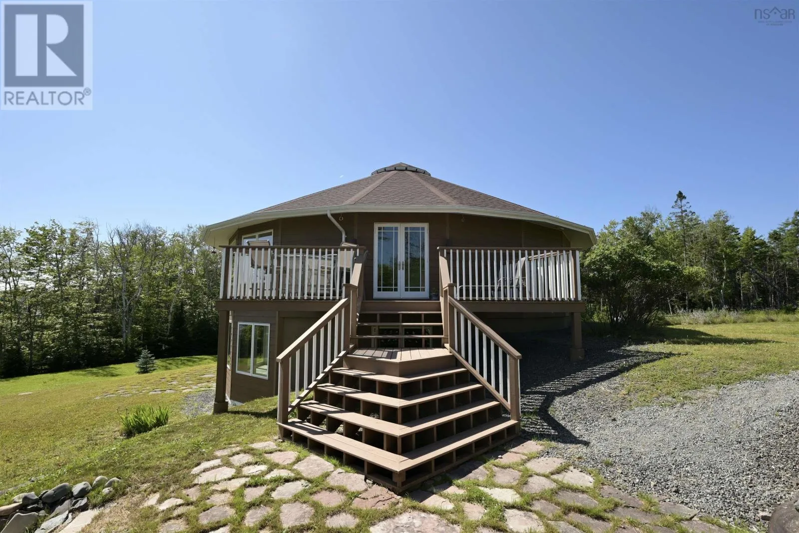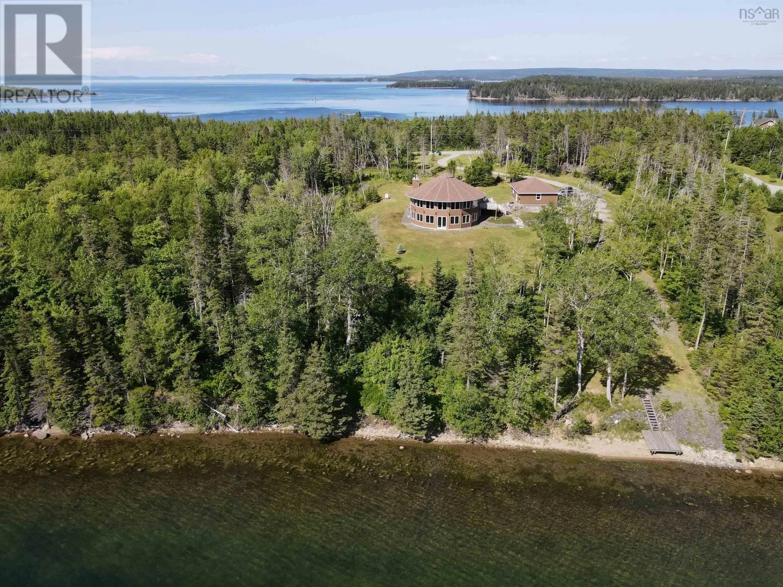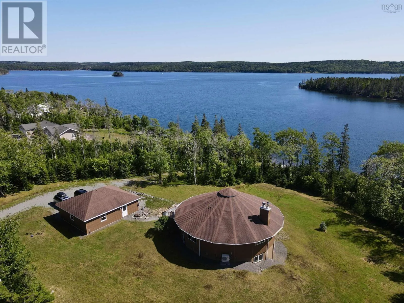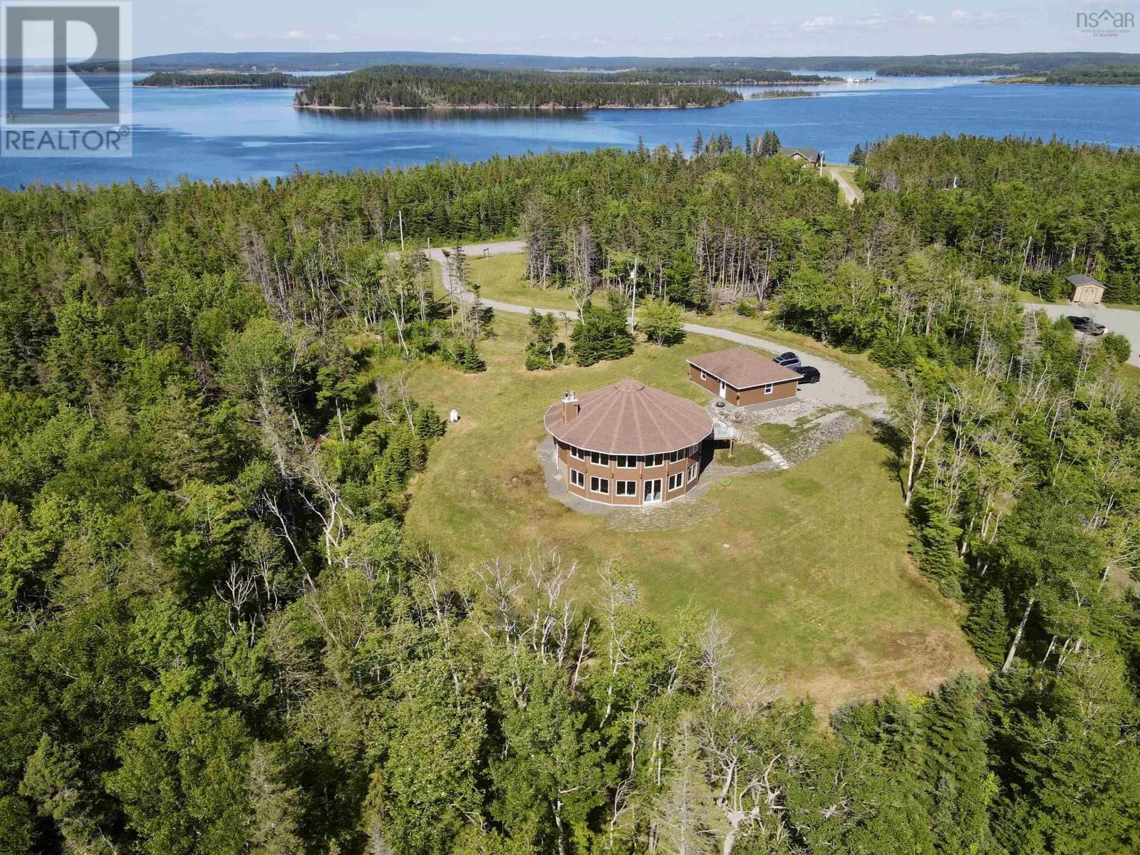Take West Bay Highway from St Peter's. Take a right onto Cedar Drive. you will see Cape George Estates Sign. Take a right onto Maple Drive. Sign at road. Welcome to the Round House of Cape George Estates, an exceptional Deltec-designed, 18-sided home on 2.7 acres with 200 feet of deep, sheltered waterfront on the Bras dOr Lake. With seven south-facing sides of Marvin Integrity windows on both levels, the home is filled with natural light and offers sweeping water views. The Bras dOr here is remarkably deep - large enough to even accommodate a 140-foot yacht that came through St. Georges Channel last year - making it a boaters dream. Inside, 3,350 square feet of living space showcase high-end finishes and a thoughtful layout. On the upper level, youll find a spacious great room with 3/4" solid maple flooring, cedar ceiling, and a stone fireplace with gas insert and blower. The kitchen offers quartz countertops, gas range, French-door refrigerator, pantry with chest freezer, and extensive quality cookware. This level also features a large primary bedroom with a stunning ensuite bathroom, a generous walk-in pantry, and a convenient half bath. Additional highlights include a wet bar, stereo sound system, central vacuum, dedicated laundry room, and climate-controlled attic. It is the perfect space for entertaining guests and enjoying the views. A custom iron spiral staircase leads down to the lower level, where a bright, above-grade seating area opens to two additional bedrooms and a full bathroom. A Napoleon woodstove adds warmth and character. The home includes a brand-new Move Air heat pump system (2024, with 10-year warranty) providing whole-home heating and cooling. Outside, enjoy a 160-sq-ft deck with views of sailboats in the channel, a detached 26' x 32' two-car garage with extra storage, a gravel RV parking area with 110V hookup, and a marine-treated shore platform with permits for a floating dock and mooring. This remarkable property comes fully furnished with beautiful solid hardwood furniture offering a true turnkey opportunity to own on one of Cape Bretons most unique and admired water (id:27476)