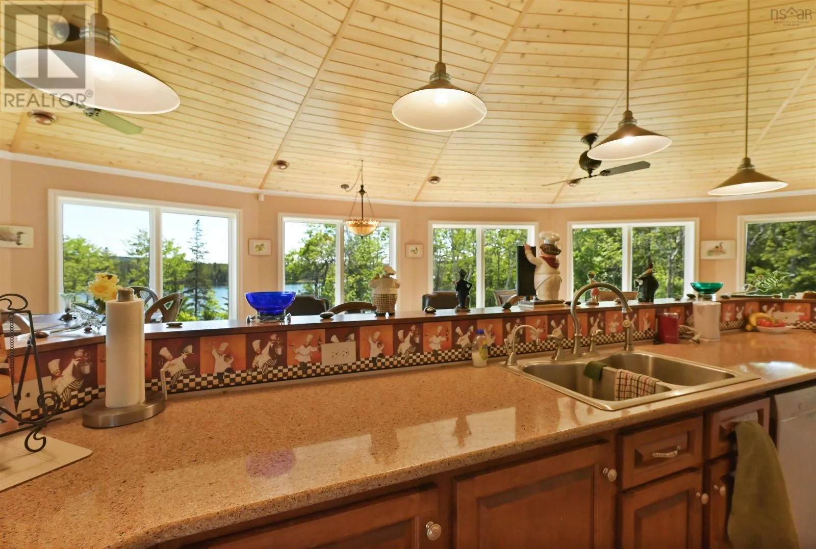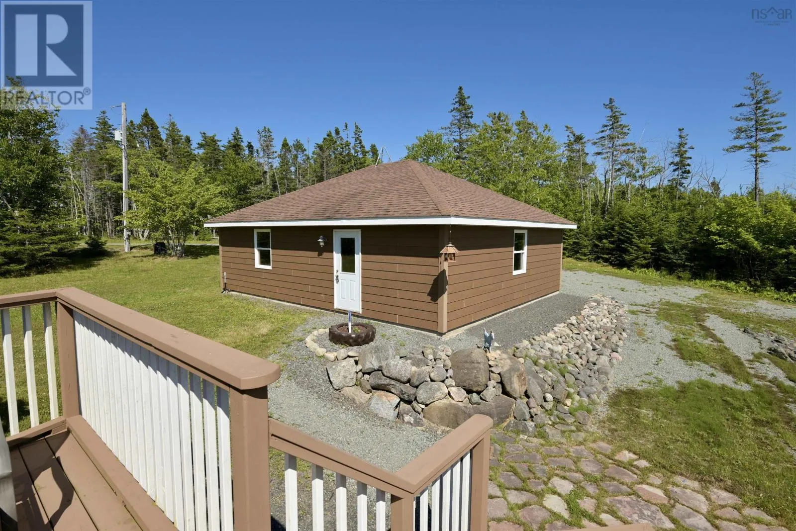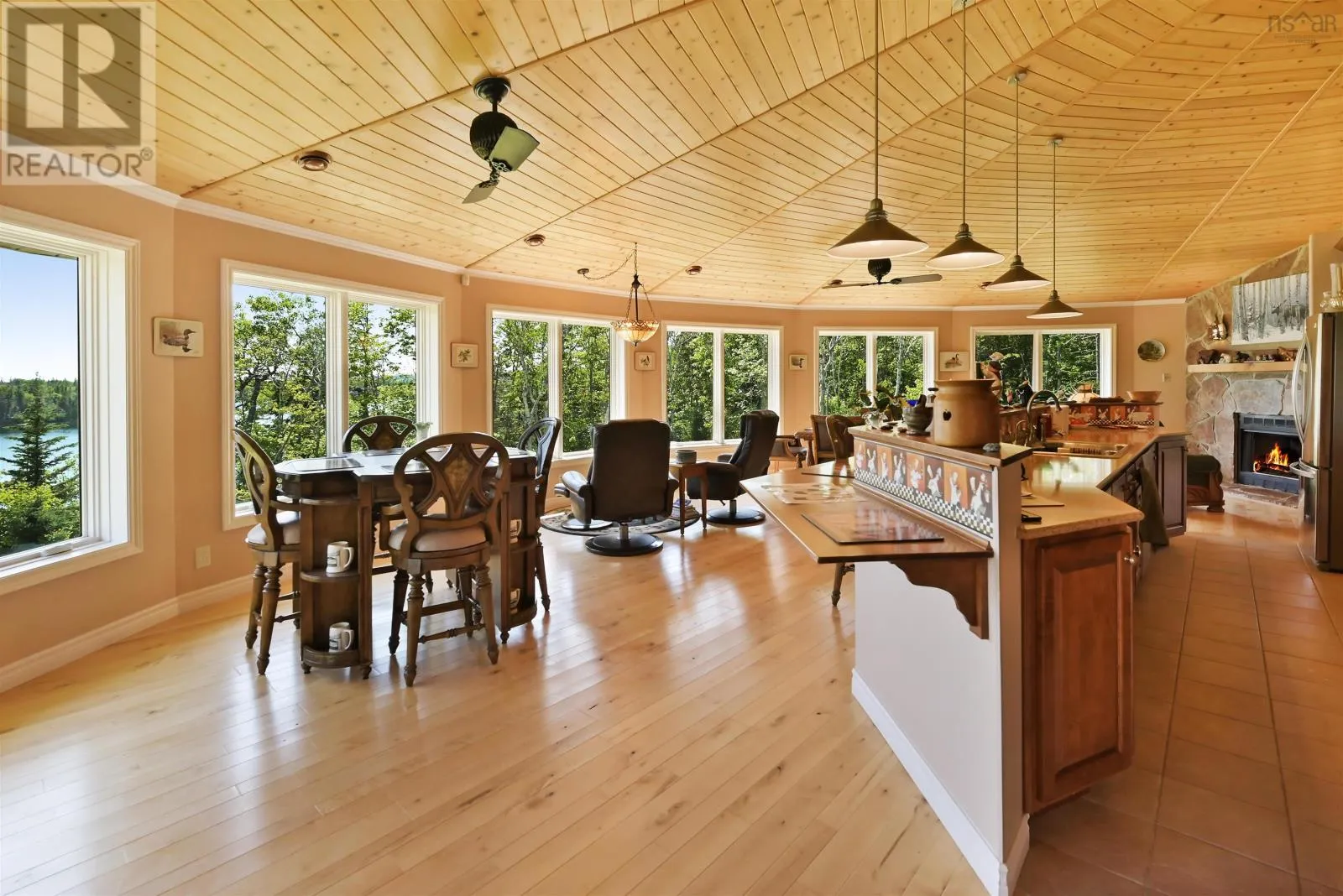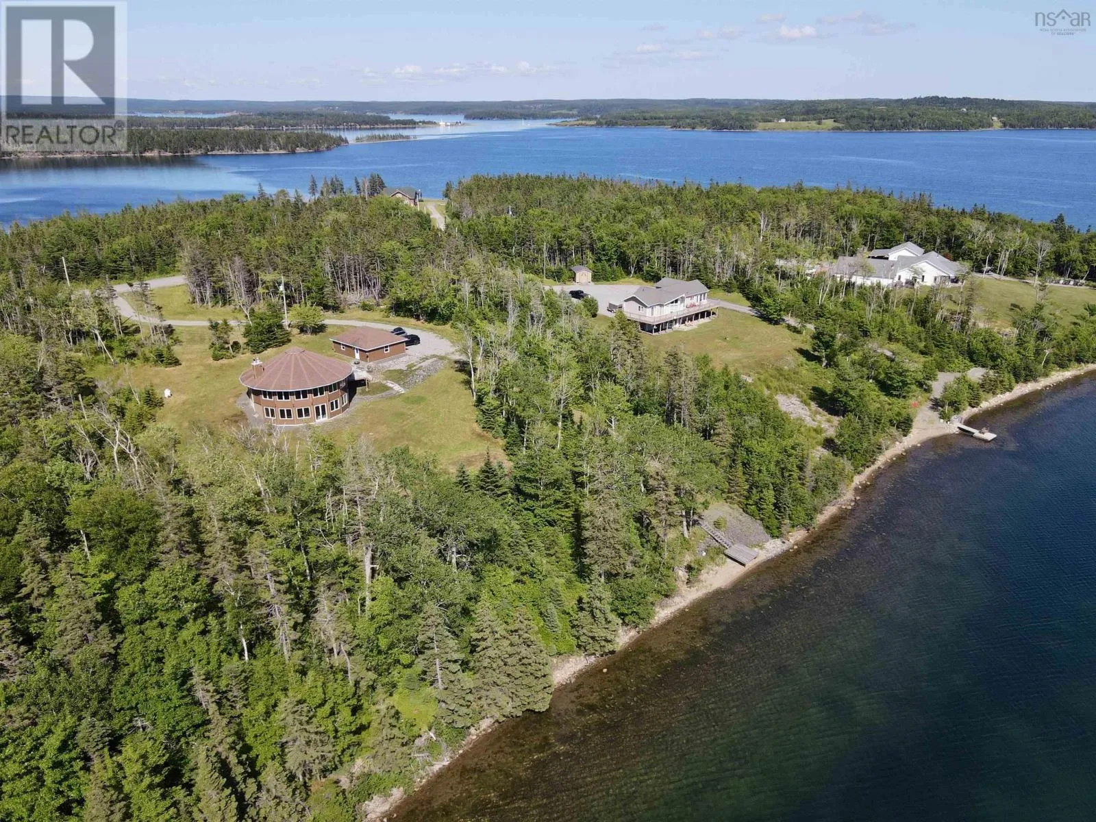 Take West Bay Highway from St Peter's. Take a right onto Cedar Drive. you will see Cape George Estates Sign. Take a right onto Maple Drive. Sign at road. Welcome to the Round House of Cape George Estates, an exceptional Deltec-designed, 18-sided home on 2.7 acres with 200 feet of deep, sheltered waterfront on the Bras dOr Lake. With seven south-facing sides of Marvin Integrity windows on both levels, the home is filled with natural light and offers sweeping water views. The Bras dOr here is remarkably deep - large enough to even accommodate a 140-foot yacht that came through St. Georges Channel last year - making it a boaters dream. Inside, 3,350 square feet of living space showcase high-end finishes and a thoughtful layout. On the upper level, youll find a spacious great room with 3/4" solid maple flooring, cedar ceiling, and a stone fireplace with gas insert and blower. The kitchen offers quartz countertops, gas range, French-door refrigerator, pantry with chest freezer, and extensive quality cookware. This level also features a large primary bedroom with a stunning ensuite bathroom, a generous walk-in pantry, and a convenient half bath. Additional highlights include a wet bar, stereo sound system, central vacuum, dedicated laundry room, and climate-controlled attic. It is the perfect space for entertaining guests and enjoying the views. A custom iron spiral staircase leads down to the lower level, where a bright, above-grade seating area opens to two additional bedrooms and a full bathroom. A Napoleon woodstove adds warmth and character. The home includes a brand-new Move Air heat pump system (2024, with 10-year warranty) providing whole-home heating and cooling. Outside, enjoy a 160-sq-ft deck with views of sailboats in the channel, a detached 26' x 32' two-car garage with extra storage, a gravel RV parking area with 110V hookup, and a marine-treated shore platform with permits for a floating dock and mooring. This remarkable property comes fully furnished with beautiful solid hardwood furniture offering a true turnkey opportunity to own on one of Cape Bretons most unique and admired water (id:27476)
