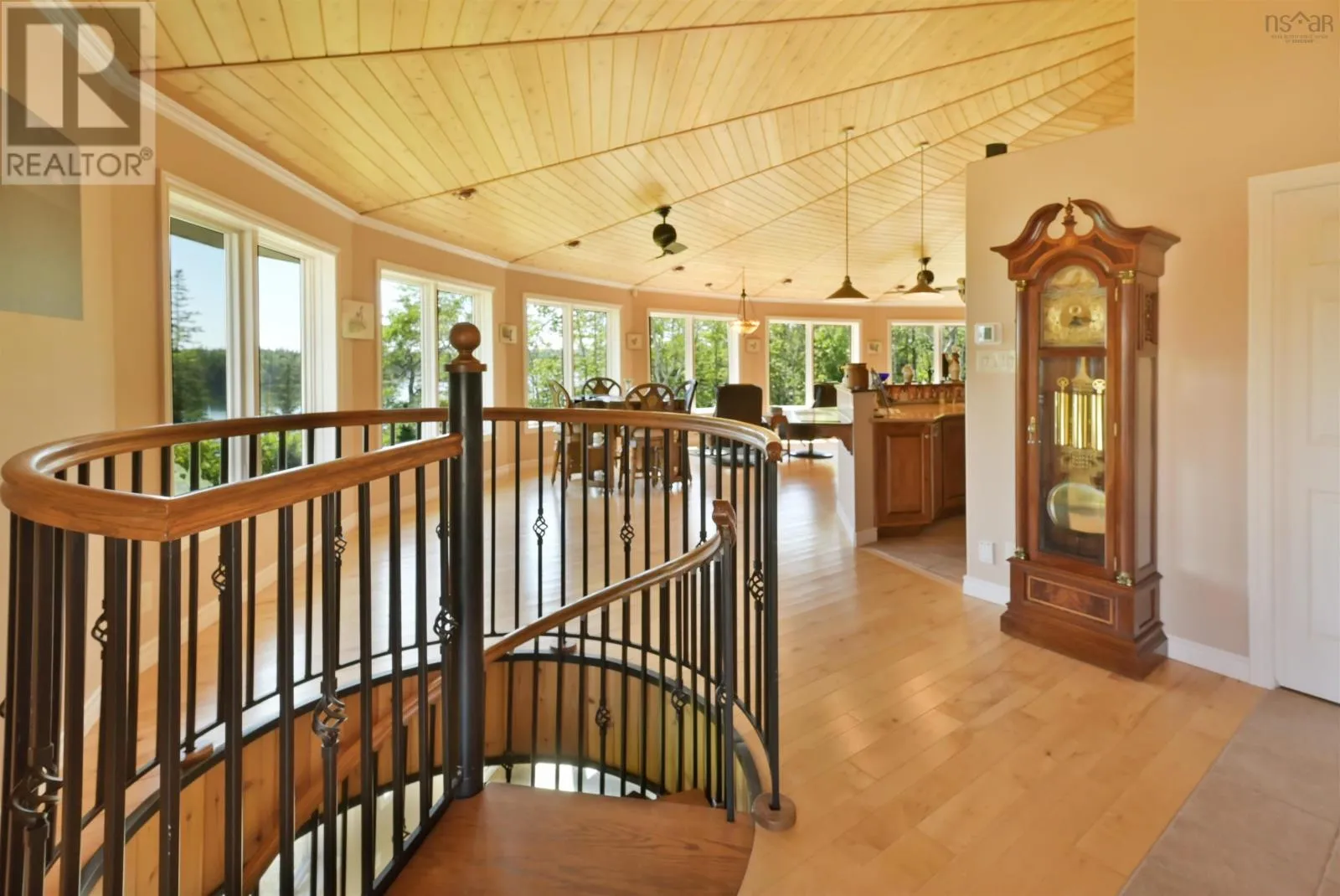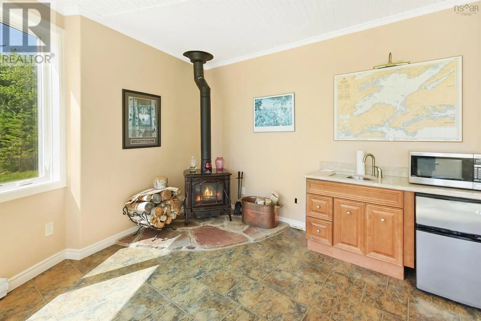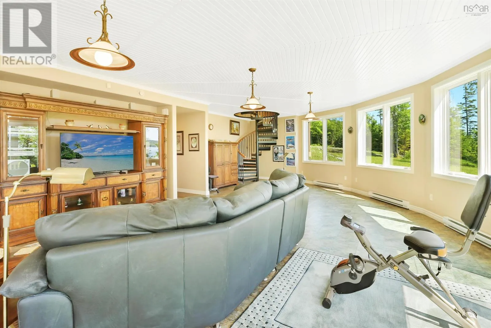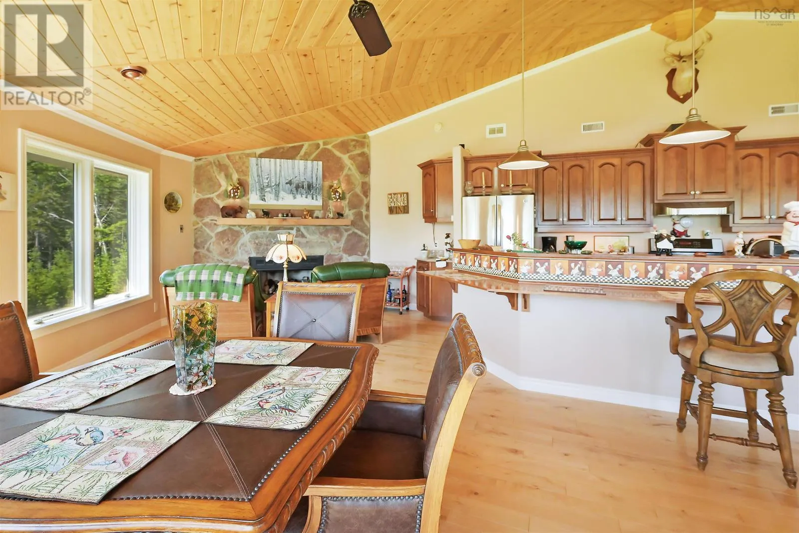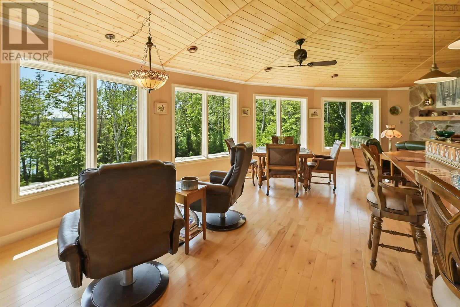 Take West Bay Highway from St Peter's. Take a right onto Cedar Drive. you will see Cape George Estates Sign. Take a right onto Maple Drive. Sign at road. Welcome to the Round House of Cape George Estates, an exceptional Deltec-designed, 18-sided home on 2.7 acres with 200 feet of deep, sheltered waterfront on the Bras dOr Lake. With seven south-facing sides of Marvin Integrity windows on both levels, the home is filled with natural light and offers sweeping water views. The Bras dOr here is remarkably deep - large enough to even accommodate a 140-foot yacht that came through St. Georges Channel last year - making it a boaters dream. Inside, 3,350 square feet of living space showcase high-end finishes and a thoughtful layout. On the upper level, youll find a spacious great room with 3/4" solid maple flooring, cedar ceiling, and a stone fireplace with gas insert and blower. The kitchen offers quartz countertops, gas range, French-door refrigerator, pantry with chest freezer, and extensive quality cookware. This level also features a large primary bedroom with a stunning ensuite bathroom, a generous walk-in pantry, and a convenient half bath. Additional highlights include a wet bar, stereo sound system, central vacuum, dedicated laundry room, and climate-controlled attic. It is the perfect space for entertaining guests and enjoying the views. A custom iron spiral staircase leads down to the lower level, where a bright, above-grade seating area opens to two additional bedrooms and a full bathroom. A Napoleon woodstove adds warmth and character. The home includes a brand-new Move Air heat pump system (2024, with 10-year warranty) providing whole-home heating and cooling. Outside, enjoy a 160-sq-ft deck with views of sailboats in the channel, a detached 26' x 32' two-car garage with extra storage, a gravel RV parking area with 110V hookup, and a marine-treated shore platform with permits for a floating dock and mooring. This remarkable property comes fully furnished with beautiful solid hardwood furniture offering a true turnkey opportunity to own on one of Cape Bretons most unique and admired water (id:27476)