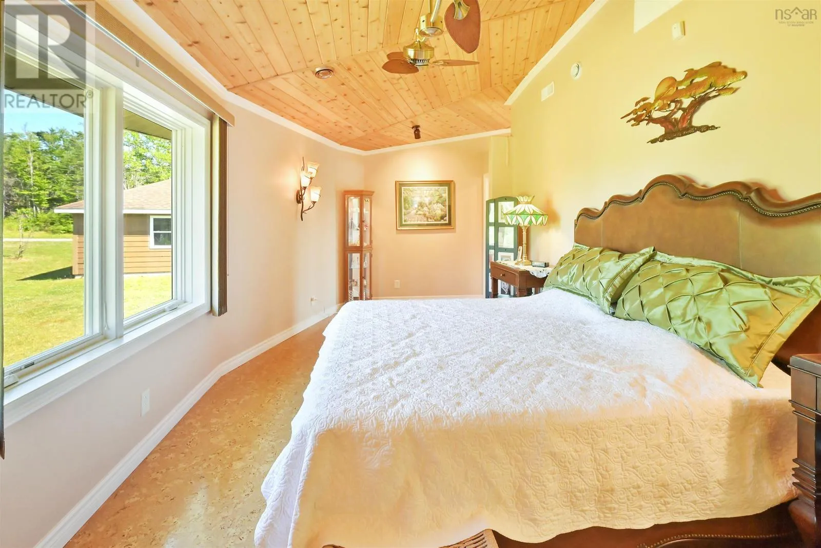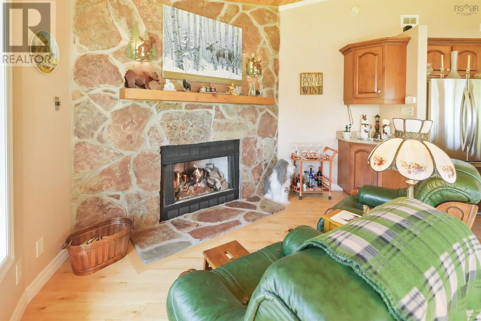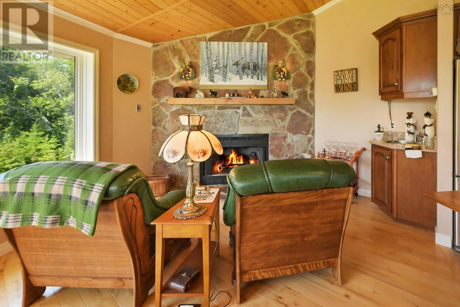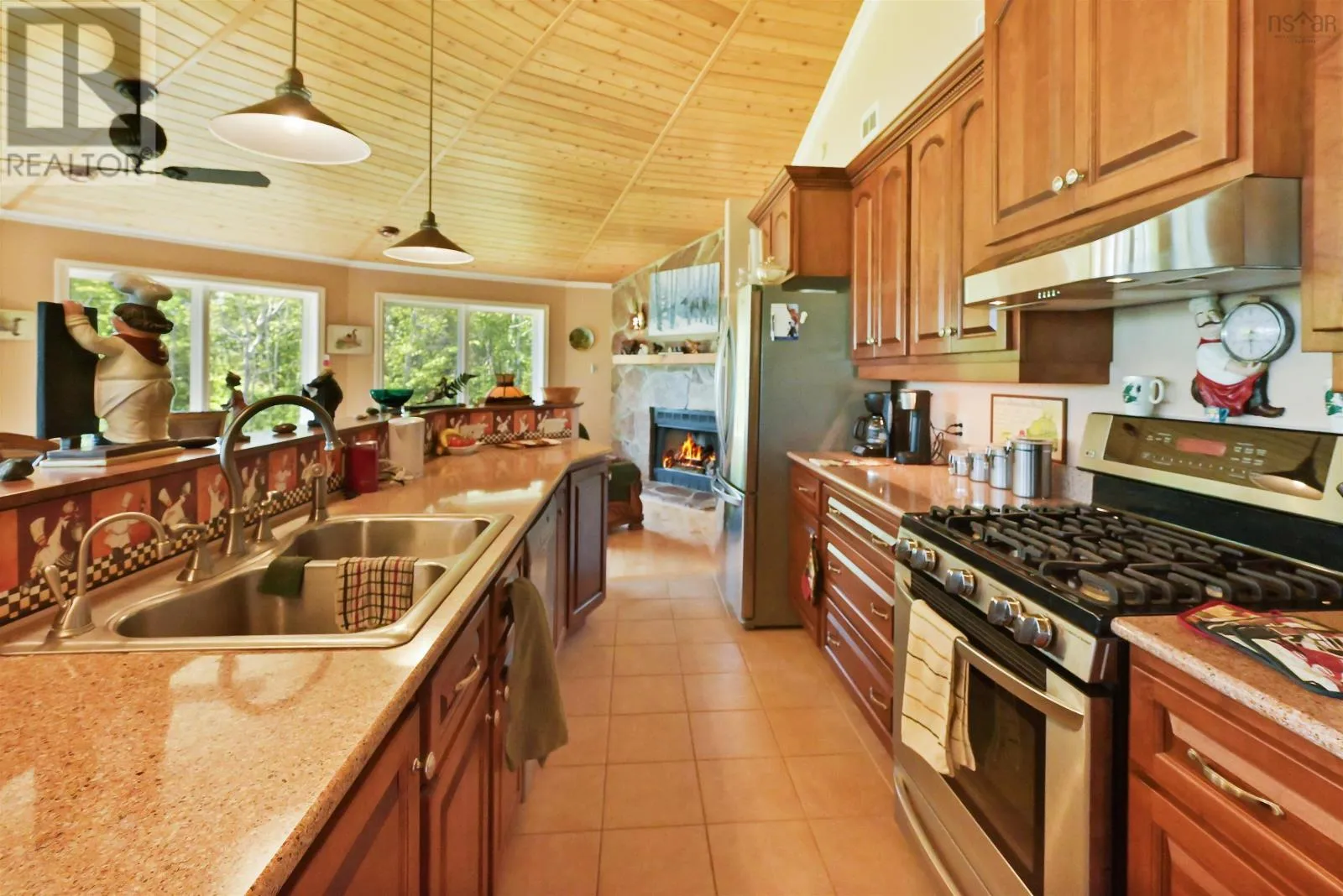Take West Bay Highway from St Peter's. Take a right onto Cedar Drive. you will see Cape George Estates Sign. Take a right onto Maple Drive. Sign at road. Welcome to the Round House of Cape George Estates, an exceptional Deltec-designed, 18-sided home on 2.7 acres with 200 feet of deep, sheltered waterfront on the Bras dOr Lake. With seven south-facing sides of Marvin Integrity windows on both levels, the home is filled with natural light and offers sweeping water views. The Bras dOr here is remarkably deep - large enough to even accommodate a 140-foot yacht that came through St. Georges Channel last year - making it a boaters dream. Inside, 3,350 square feet of living space showcase high-end finishes and a thoughtful layout. On the upper level, youll find a spacious great room with 3/4" solid maple flooring, cedar ceiling, and a stone fireplace with gas insert and blower. The kitchen offers quartz countertops, gas range, French-door refrigerator, pantry with chest freezer, and extensive quality cookware. This level also features a large primary bedroom with a stunning ensuite bathroom, a generous walk-in pantry, and a convenient half bath. Additional highlights include a wet bar, stereo sound system, central vacuum, dedicated laundry room, and climate-controlled attic. It is the perfect space for entertaining guests and enjoying the views. A custom iron spiral staircase leads down to the lower level, where a bright, above-grade seating area opens to two additional bedrooms and a full bathroom. A Napoleon woodstove adds warmth and character. The home includes a brand-new Move Air heat pump system (2024, with 10-year warranty) providing whole-home heating and cooling. Outside, enjoy a 160-sq-ft deck with views of sailboats in the channel, a detached 26' x 32' two-car garage with extra storage, a gravel RV parking area with 110V hookup, and a marine-treated shore platform with permits for a floating dock and mooring. This remarkable property comes fully furnished with beautiful solid hardwood furniture offering a true turnkey opportunity to own on one of Cape Bretons most unique and admired water (id:27476)