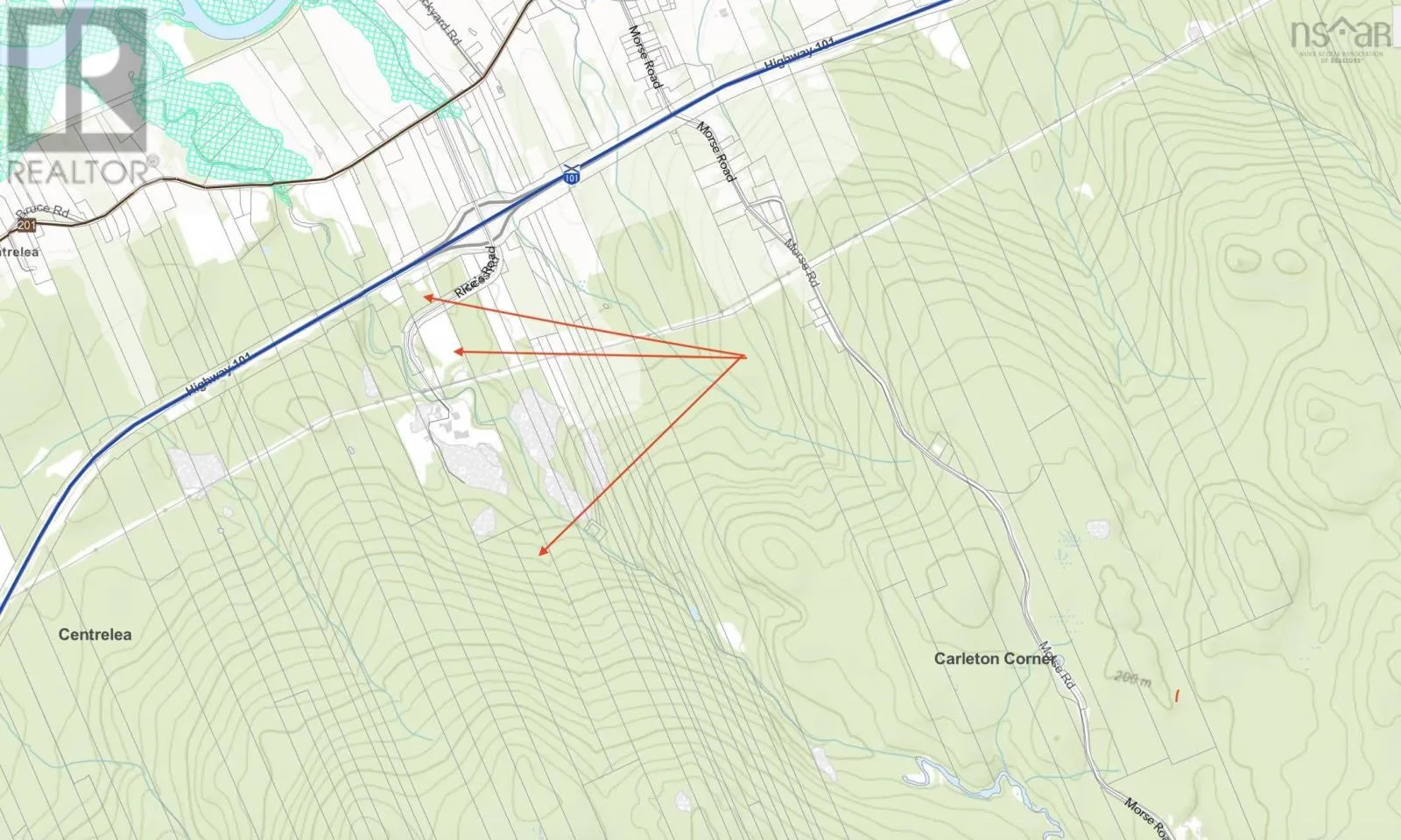 From Hwy 201 at Rice Road, South side of Hwy 201 Sixty acres +/-, in 3 Parcels at Rice Road, Carleton Corner. A 17.7 acre parcel is in two sections separated by Rice Road. This is a high visibility potential development property with easy access/visibility to Hwy 101. Also included is an additional 42 acres of wooded property accessed by a right-of-way from the Rice Road property. Establish your new business or home and have a wonderful recreational wooded property close by. (id:27476)