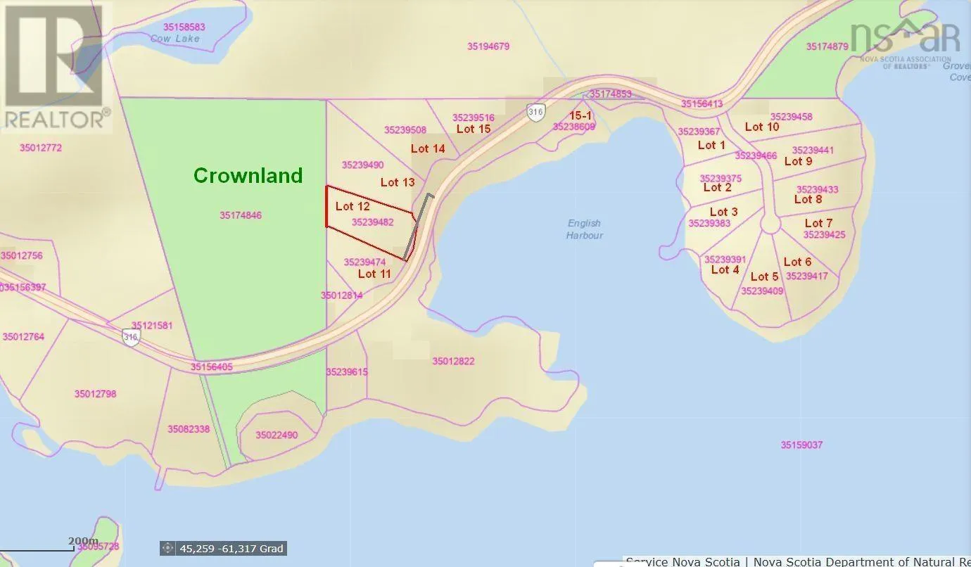 From Guysborough travel South on Hwy 16 for 1km then turn right onto Larrys River Road for 27 kms then turn right onto Hwy 316 (Marine Drive) for 9 kms to Lot 12 English Harbour (just across the road from civic #4709). In a breathtaking Atlantic location, you will find this spacious property directly above the "Marine Drive" in Guysborough County, Nova Scotia near "Tor Bay" and Port Felix. Lot 12 is +/- 3.6 Acres and offers you a wonderful panoramic location with breathtaking panoramic views over the sheltered bay of "English Harbour" and far out to the Atlantic Ocean in the upper part of the property. Just across the street is a small, publicly accessible beach area right at your doorstep, perfect for swimming, sunbathing and beach walks. The property is ideal for building a single-family or holiday home. There is no obligation to build. Likewise, there are no restrictive covenants. This also offers investors a valuable investment opportunity with a wide range of possible uses in one of the most beautiful Atlantic locations in Nova Scotia. Guysborough with its daily necessities and Canso are both only half an hour away. The popular small university town of Antigonish is an hour and 15 minutes away. Halifax International Airport can be easily reached in just under three hours via well-developed highways. (id:27476)