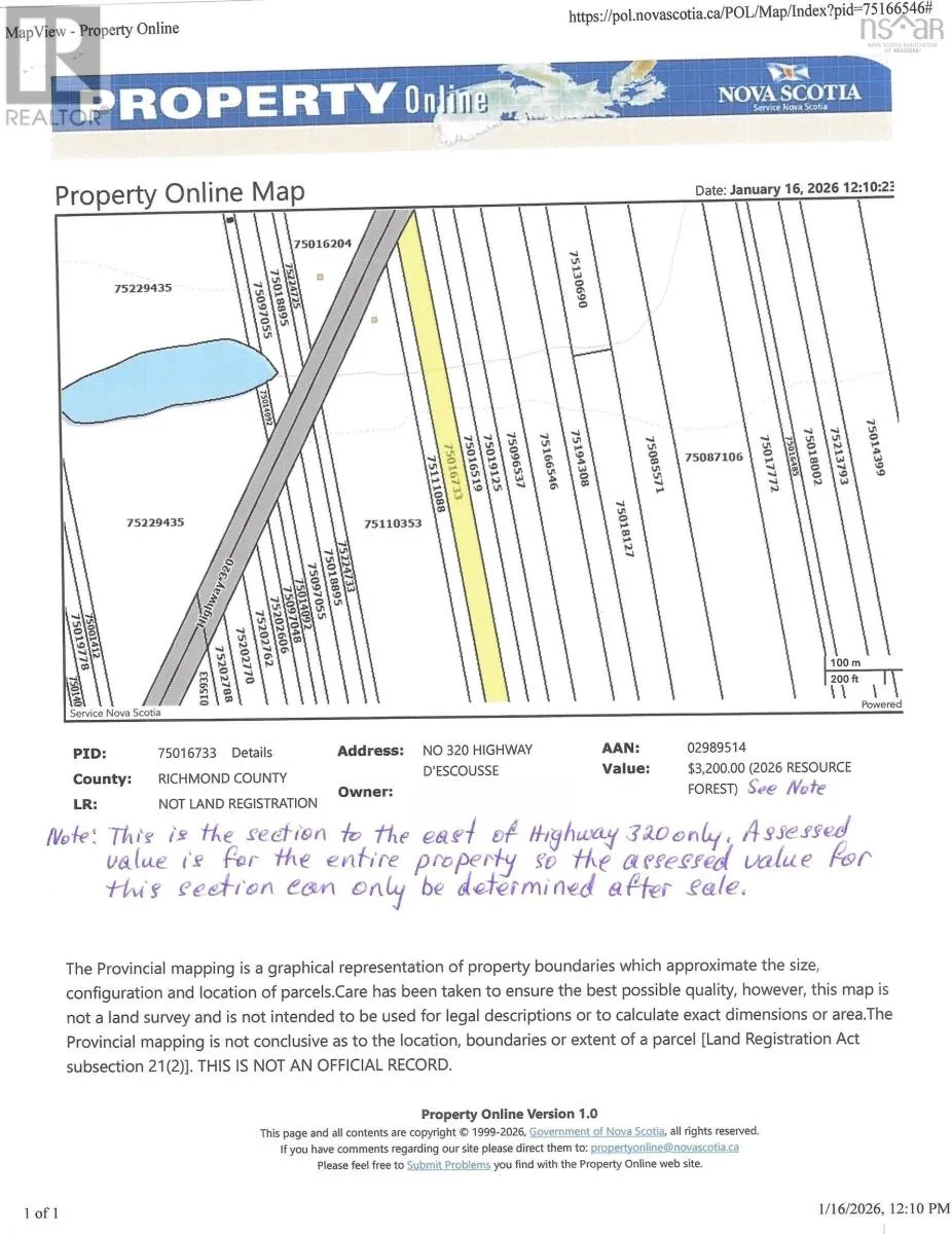 Highway 320 from the community of D'Escousse to the town of Arichat. On the Southwestern tip of Cape Breton Island, you will find a charming little Island retreat called Isle Madame. On this beautiful little Island, you will discover some of Nova Scotia's best places for kayaking, fishing, hunting, surfing, hiking, ATV and bike riding in the rough or on groomed trails, plus comfortable inns, bed and breakfasts, charming restaurants and cafés, fish markets and spectacular seaside views from just about everywhere. You will also discover beaches, lighthouses and other amazing sights wherever you go. This hidden gem is where Acadian culture lives on through song, music, dance and crafts. You can own a small piece of this island paradise at a very affordable price. This property takes in approximately 15.6 acres of vacant woodland beginning on the east side of Highway 320 and bounded on the south by lands owned by Hennessey/Landry. The property is a short walk to the DEscousse Harbour and the Lennox Passage Yacht Club, ideally located for boaters sailing in and out of the Bras DOr Lakes. This is an ideal property for a home, cottage or camp. (id:27476)