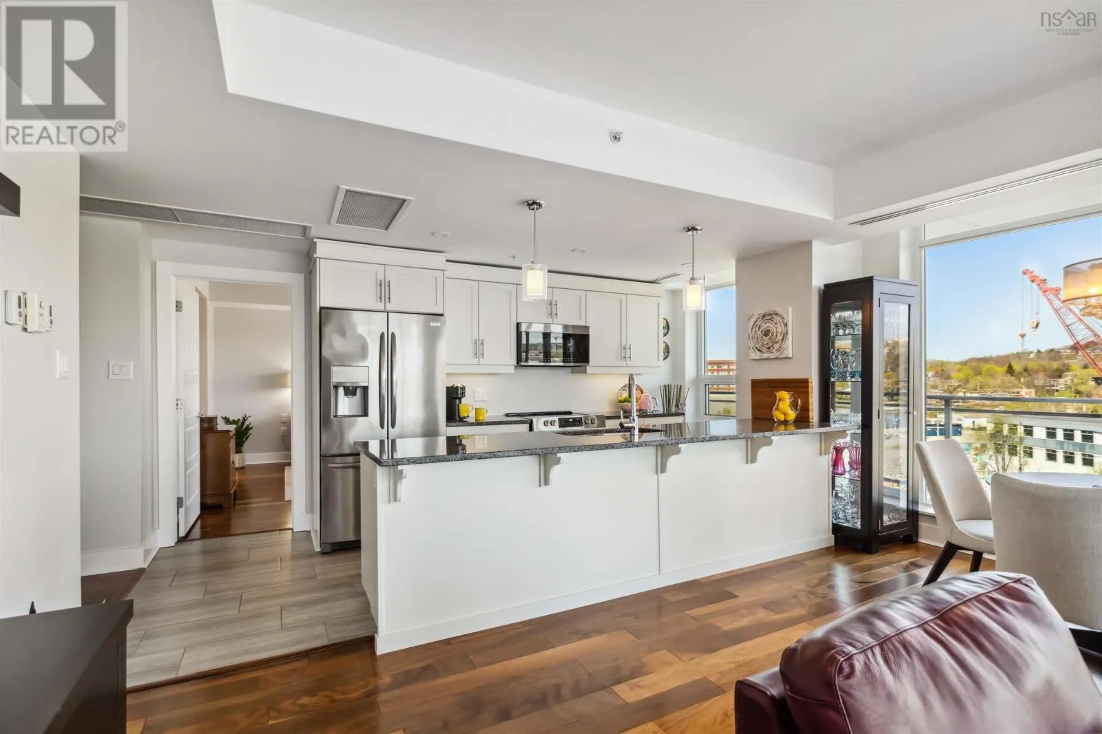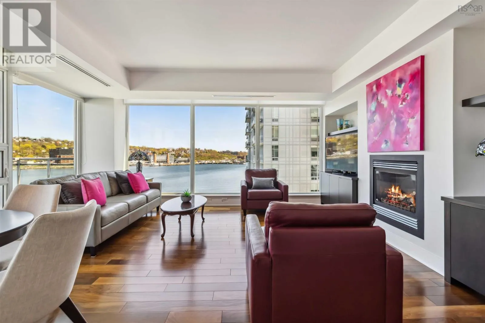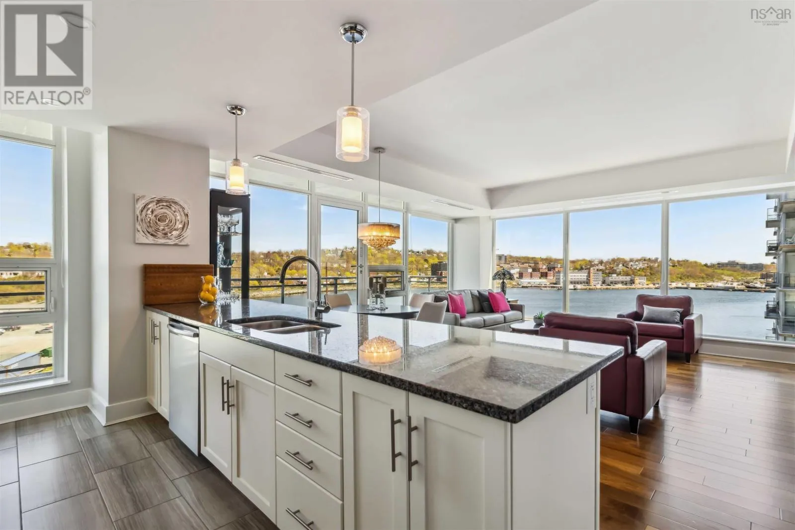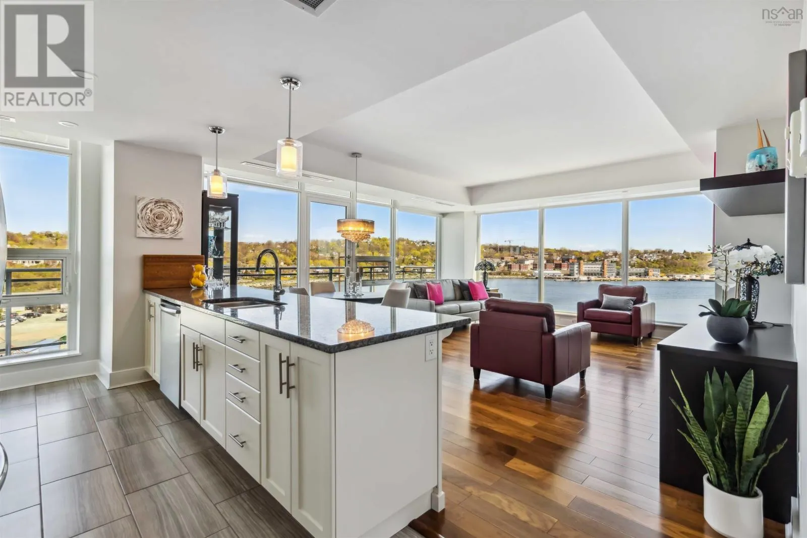 Alderney Drive to Kings Wharf Place - 2nd building on left The Keelson Welcome to Unit 502 ~ The Keelson at Kings Wharf, Dartmouths premier waterfront community. This spacious corner unit condo featuring 1,375 square foot two-bedroom, two-bath condo with a den and offers the perfect blend of comfort, style, and convenience with stunning waterviews. From the moment you walk in, youll appreciate the open-concept layout, high ceilings, and floor-to-ceiling windows that flood the space with natural light. The kitchen is a chefs dream with granite countertops, a large peninsula, and high-end stainless steel appliances (option for natural gas stove). Great room features natgas fireplace, stunning vistas and gleaming floors ~ ideal for flexible design for any decor. Quick access to the 42' long balcony that offers plenty of outdoor space and ideal for taking in the calm views of Dartmouth Cove and the city beyond. The primary suite features double closets and a spa-inspired ensuite with a walk-in shower an deep soaker tub + bonus access to balcony. The den offers flexible space for a home office or media room, while the second bedroom and main bath provide privacy and functionality for family or visitors. Immaculate throughout, pre-inspected and well maintained the condo boasts custom built in cabinetry, custom window coverings and is move in ready. The Keelson building includes fitness room, guest suite ($), social room, parking & storage, on-site resident Super, professional property management and the condo offers ducted heating & air conditioning throughout. Condo fees include h&c water, heat, a/c & natural gas for stove & fireplace in a pet friendly building. Enjoy morning coffee or evening sunsets can be enjoyed on your private balcony with harbour views all while located just steps from the Alderney Ferry, cafés, restaurants, library, specialty shops & services, marina and transit. Luxury condo living in the heart of Downtown Dartmouth. (id:27476)