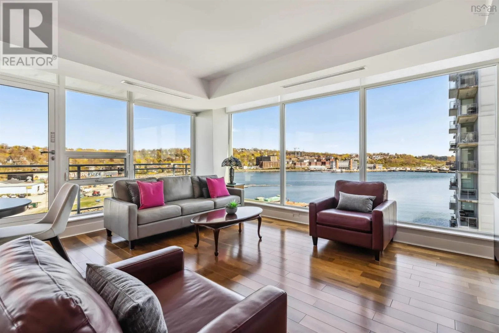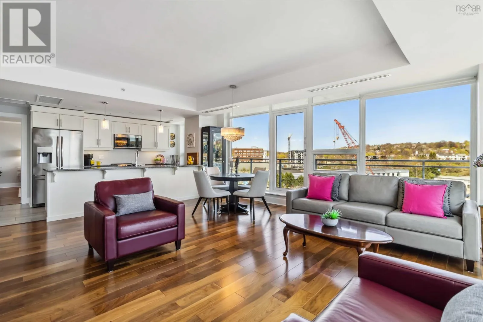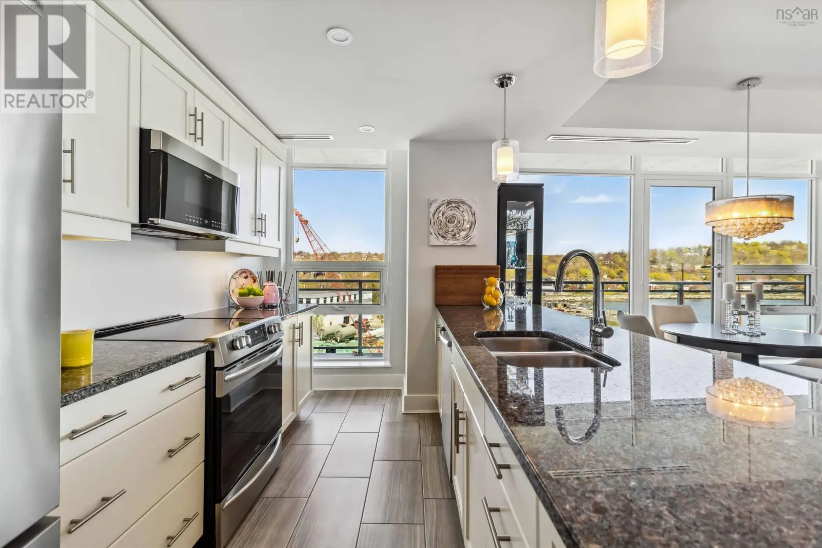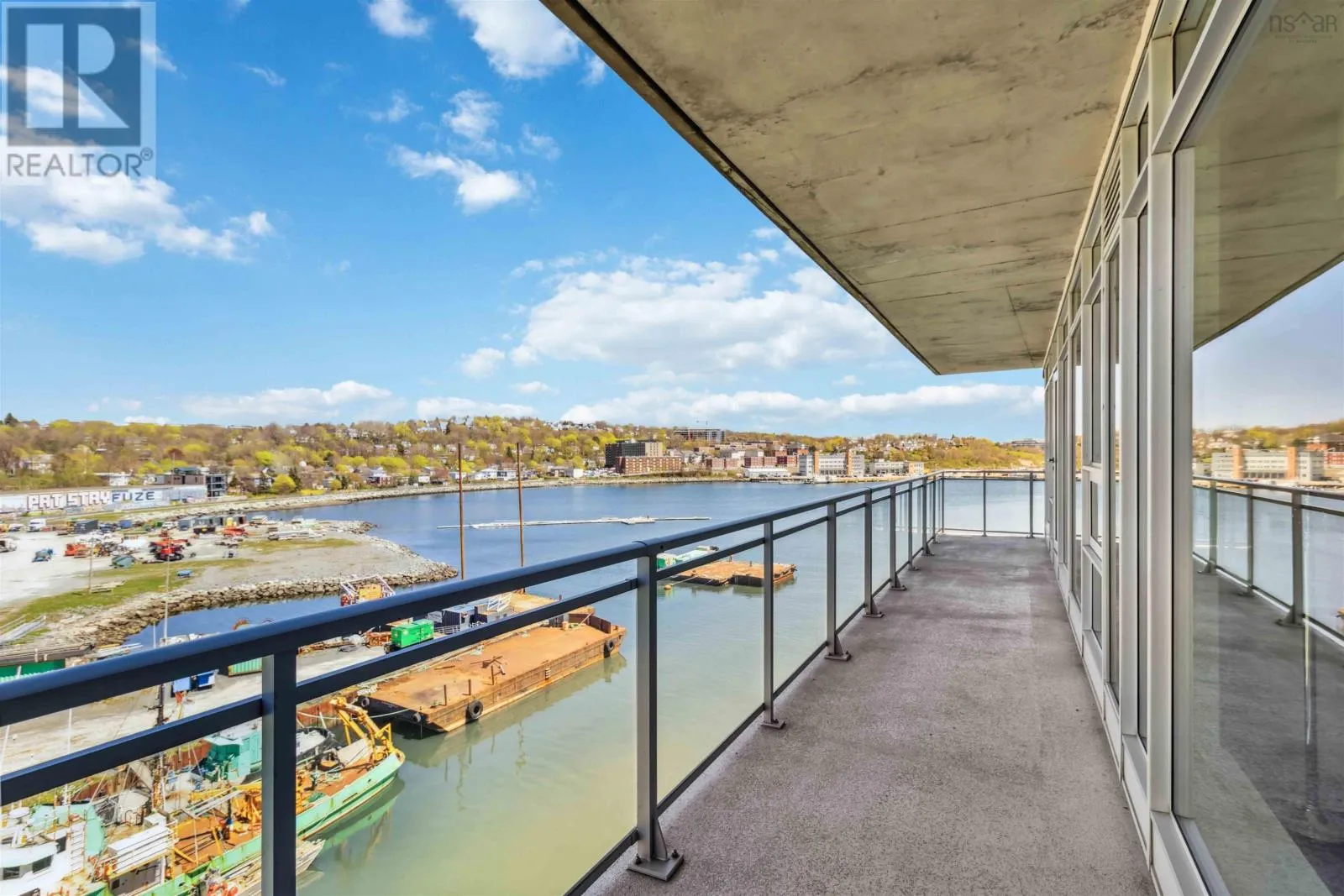 Alderney Drive to Kings Wharf Place - 2nd building on left The Keelson Welcome to Unit 502 ~ The Keelson at Kings Wharf, Dartmouths premier waterfront community. This spacious corner unit condo featuring 1,375 square foot two-bedroom, two-bath condo with a den and offers the perfect blend of comfort, style, and convenience with stunning waterviews. From the moment you walk in, youll appreciate the open-concept layout, high ceilings, and floor-to-ceiling windows that flood the space with natural light. The kitchen is a chefs dream with granite countertops, a large peninsula, and high-end stainless steel appliances (option for natural gas stove). Great room features natgas fireplace, stunning vistas and gleaming floors ~ ideal for flexible design for any decor. Quick access to the 42' long balcony that offers plenty of outdoor space and ideal for taking in the calm views of Dartmouth Cove and the city beyond. The primary suite features double closets and a spa-inspired ensuite with a walk-in shower an deep soaker tub + bonus access to balcony. The den offers flexible space for a home office or media room, while the second bedroom and main bath provide privacy and functionality for family or visitors. Immaculate throughout, pre-inspected and well maintained the condo boasts custom built in cabinetry, custom window coverings and is move in ready. The Keelson building includes fitness room, guest suite ($), social room, parking & storage, on-site resident Super, professional property management and the condo offers ducted heating & air conditioning throughout. Condo fees include h&c water, heat, a/c & natural gas for stove & fireplace in a pet friendly building. Enjoy morning coffee or evening sunsets can be enjoyed on your private balcony with harbour views all while located just steps from the Alderney Ferry, cafés, restaurants, library, specialty shops & services, marina and transit. Luxury condo living in the heart of Downtown Dartmouth. (id:27476)