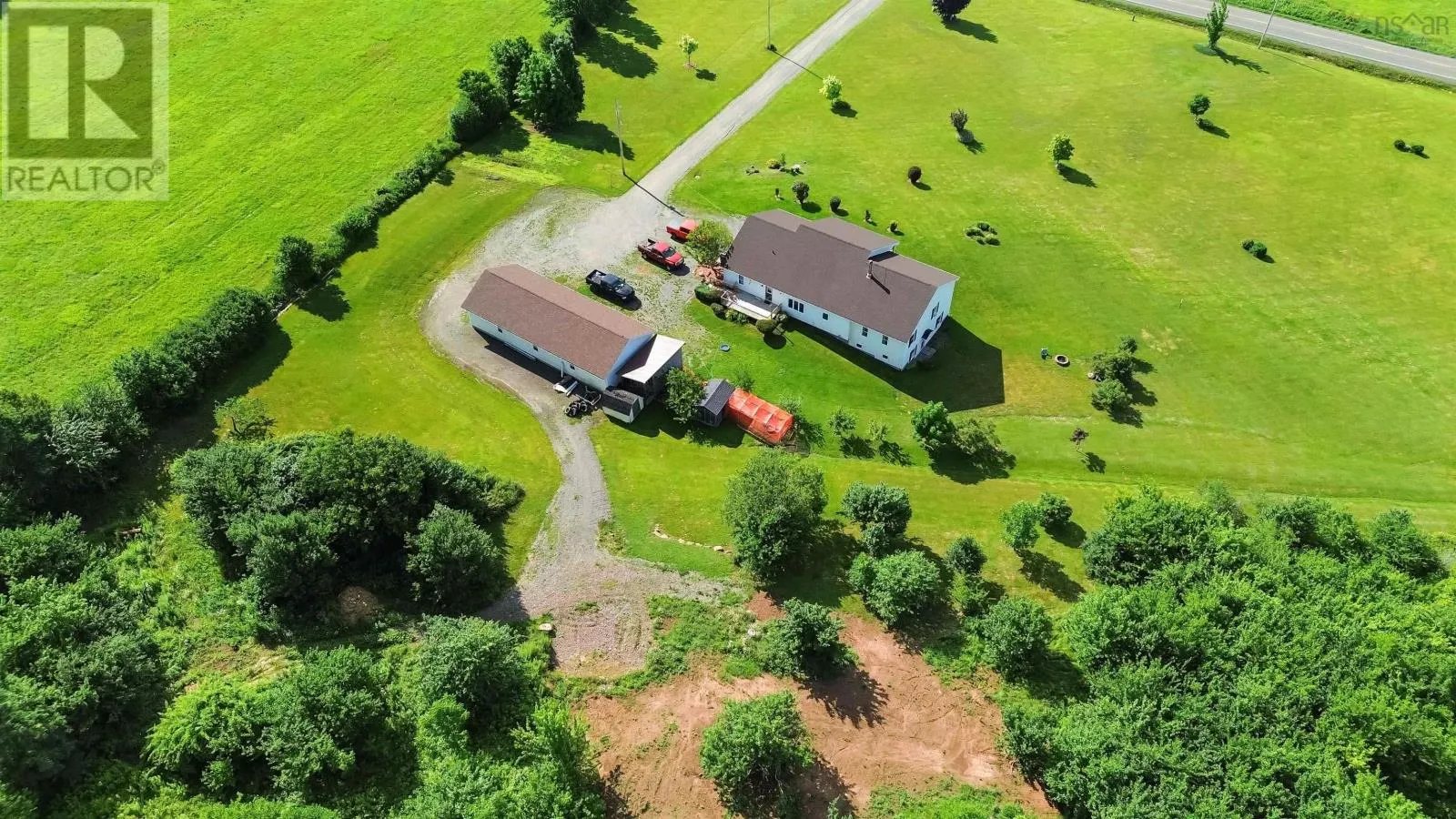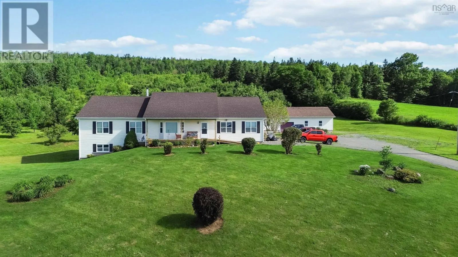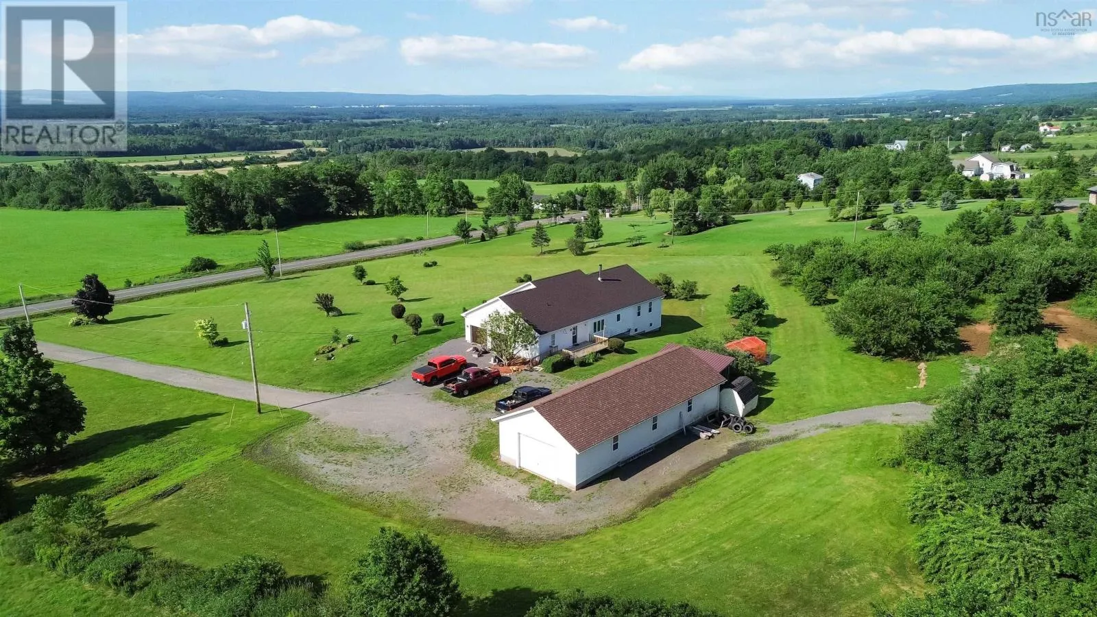 North on Victoria Rd, from Aylesford, West on Hwy 221 to civic on the right. Nestled in the picturesque Annapolis Valley, 2135 Highway 221 in Aylesford, NS, is a jaw dropping rancher on 13+ acres of breathtaking land. Outdoor enthusiasts will love the private trails and rolling hills, perfect for hiking, dirt biking, and four-wheeling, while nature lovers can enjoy the lush, well-maintained yard with mature fruit trees, berry patches and space for a vegetable garden. The inviting front deck presents a perfect spot to enjoy your morning coffee or an evening refreshment while taking in the spectacular views of the Annapolis Valley. With over 3,000 sqft of thoughtfully designed living space, the open-concept main level is filled with natural light that flows in the spacious living room and large eat-in kitchen, which is equipped with new appliances and a cozy wood stove. The primary bedroom connects to the spa-like main bath with a soaker jet tub and walk-in shower, while two additional main-level bedrooms offer comfort and convenience. The rear foyer includes a main level laundry area and backyard access. The lower level expands the living space with a massive fourth bedroom, full bath, ample storage, and a second living area that can serve as a fifth bedroom if desired, plus a convenient walkout. Additional features include a heated attached double garage and a massive wired 24x60 detached garage/workshop, including an oversized front door for easy access for heavy machinery or recreational toys. A firewood shed adds extra storage and is easily accessible from the back door. Designed for accessibility, the home has ramped entries, is fully wheelchair-friendly, and includes a generator hook-up. The driveway light enhances nighttime visibility and safety. Heating is provided by radiant in-floor heating and the wood stove. Just minutes from highway access and amenities, this private yet convenient home is perfect for those seeking space, nature, and comfort! Don't miss this opportunity to make 2135 Highway 221 yours! (id:27476)