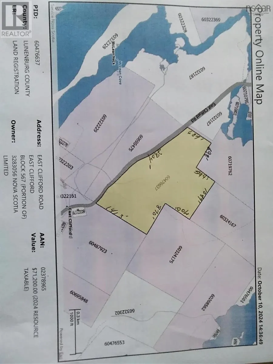 From Hwy 103 Exit 13, head west 15 km on Hwy 325 to East Clifford Road on the right, then on east on EAST CLIFFORD ROAD CONTINUE PAST A SMALL BRIDGE PROPERTY ON THE RIGHT SIGNED AND FLAGGED BY SURVEYOR 27 HECTARES --66.718 ACRES OF WOODED LAND WITH A COUPLE OF HAULING ROADS SOME GROWN OVER .THE LAND HAS BEEN REDFLAGGEDBY SURVEYOR AT FRONT OF PROPERTY,SIGNS POSTED INSIDE THE TAPED TREES.THERE ARE APPROXIMATE 2804 FT OF ROADFRONTAGE ,SEVERALL POWER POLES ON THE LAND,PROPERTY ON THE RIGHT SIDE OF EAST CLIFFORD ROAD SUBJECT TO HST (id:27476)
