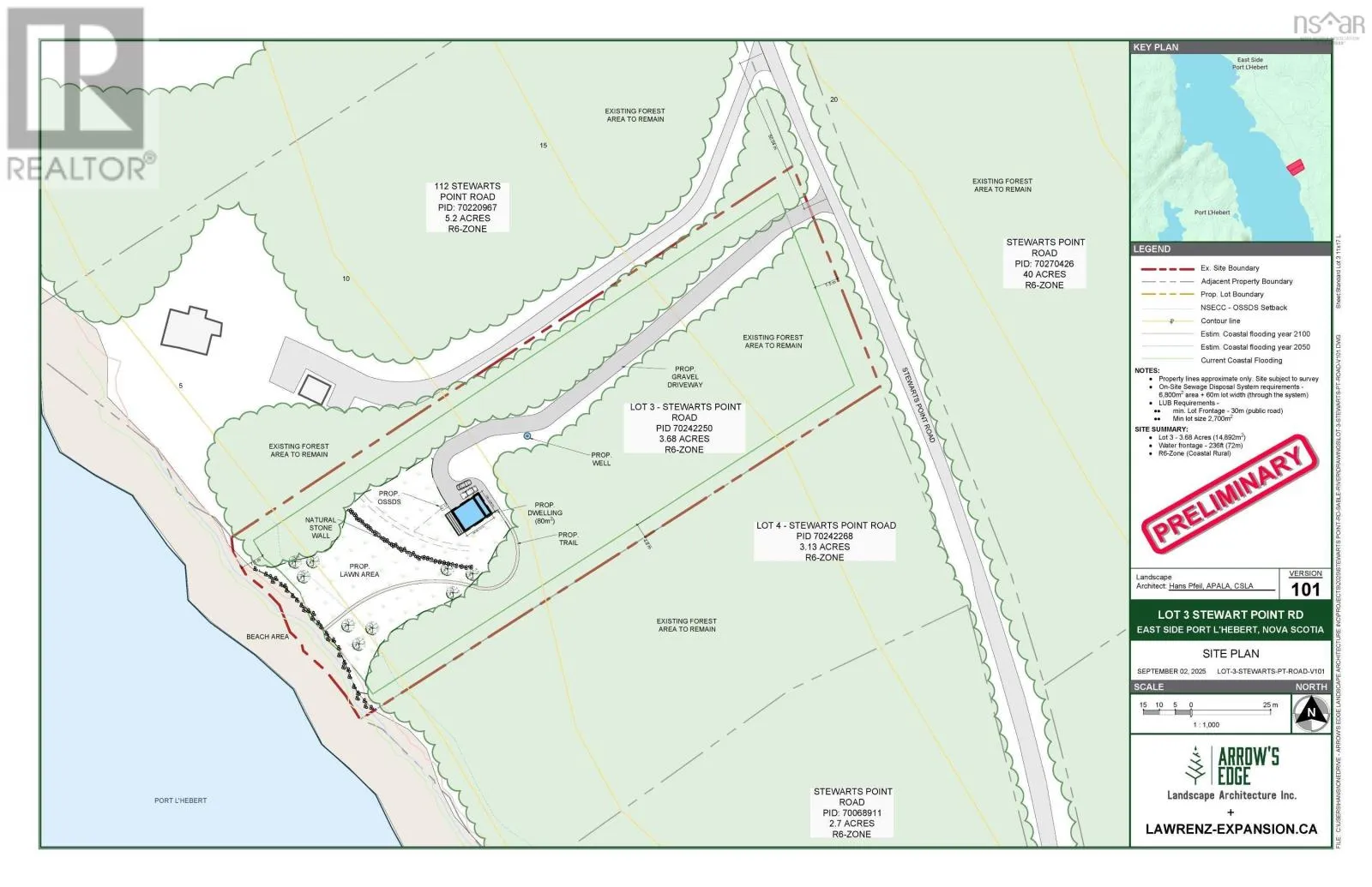 Exit 22 Highway 103, turn onto Highway 3, and turn right onto Port L'Herbert Road. Continue on East Port L'Herbert Rd and East Side Port L'Herbert Rd until it turns into Stewarts Point Rd. LOT 3 is on the right, just past civic # 112 and before LOT 4 which is also for sale. Signed. Discover the beauty and tranquility of Nova Scotia's Atlantic coast with this exceptional 3.68-acre surveyed oceanfront property, offering 238 feet of dramatic, rocky shoreline in the peaceful community of East Port L'Hebert. Surrounded by mature trees and unspoiled wilderness, this expansive lot provides a private, serene setting where you can fully embrace coastal living. With preliminary site plan and year-round road access, the property is ideal for a custom oceanfront home, a cozy cottage retreat, or a long-term investment. Its generous size and natural landscape offer endless possibilities to design the escape you've always envisioned - wake to the sound of waves, explore nearby coves and nature reserves, and enjoy unforgettable Atlantic sunsets. The adjacent Lot 4 is also available, and both oceanfront parcels can be purchased together at a discounted package price, offering a rare opportunity to secure an exceptional stretch of Nova Scotia's coastline. Don't miss your chance to own a piece of this breathtaking and unspoiled shore. (id:27476)