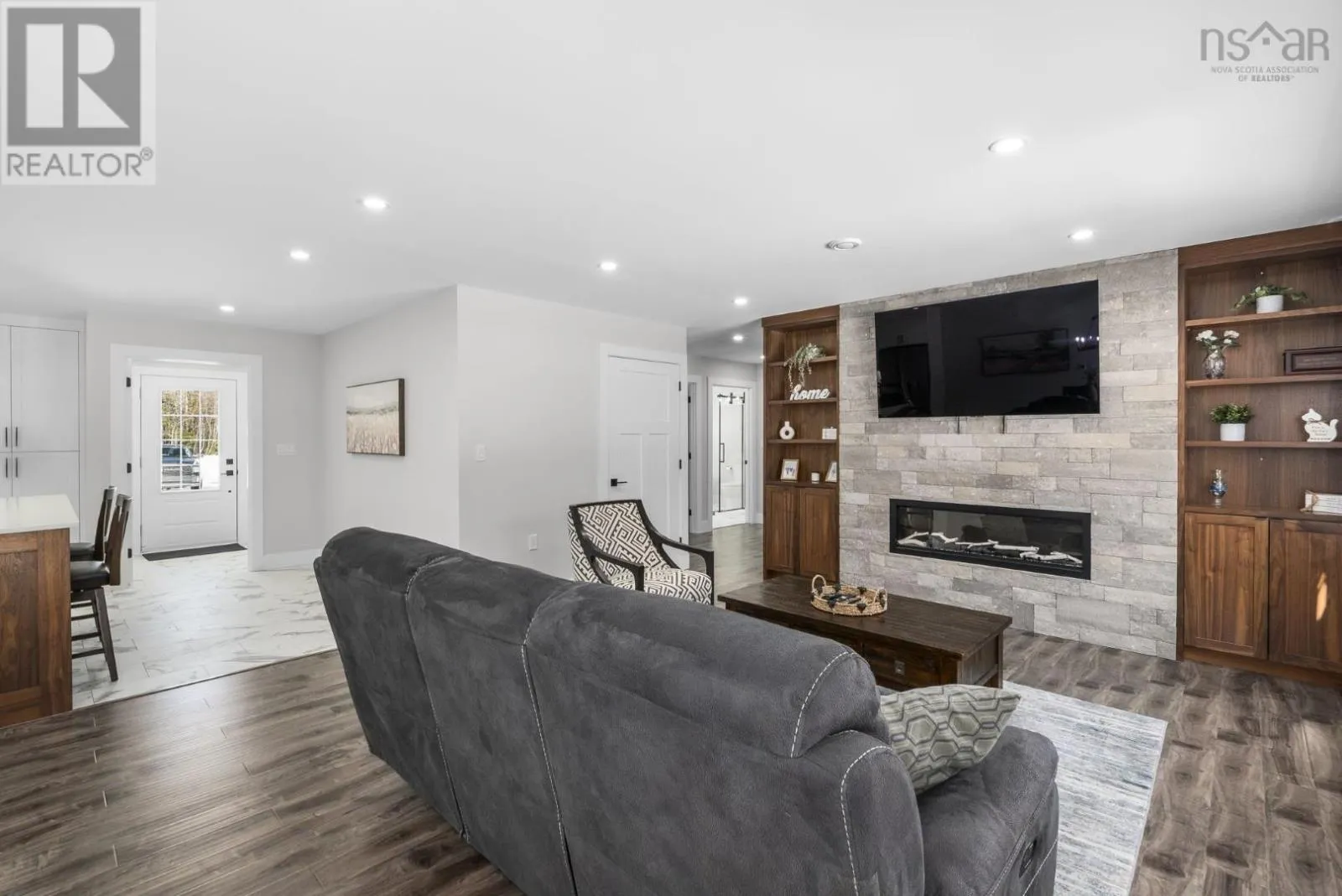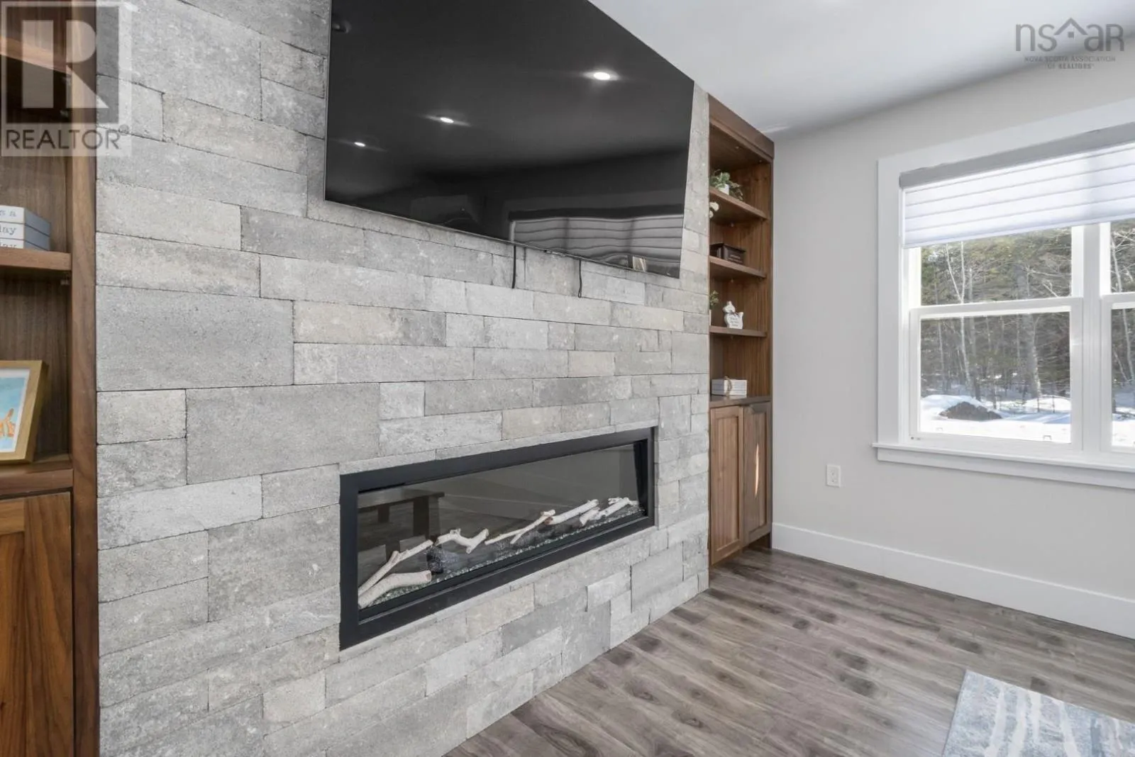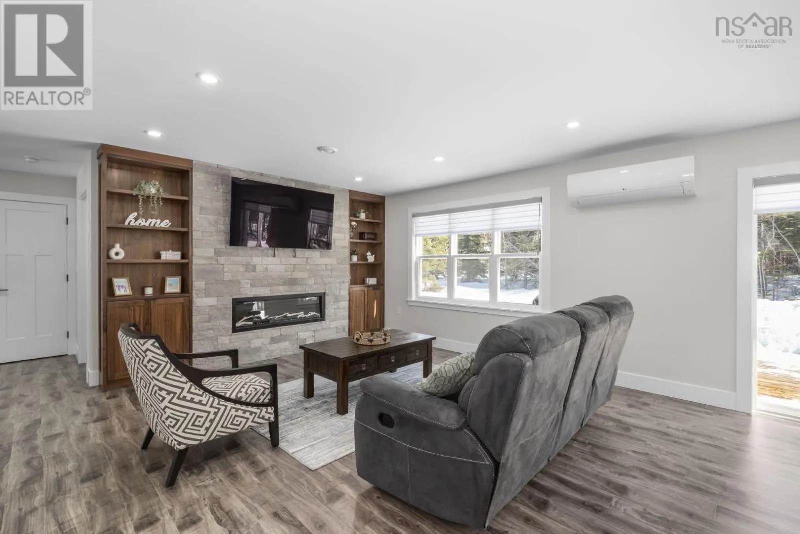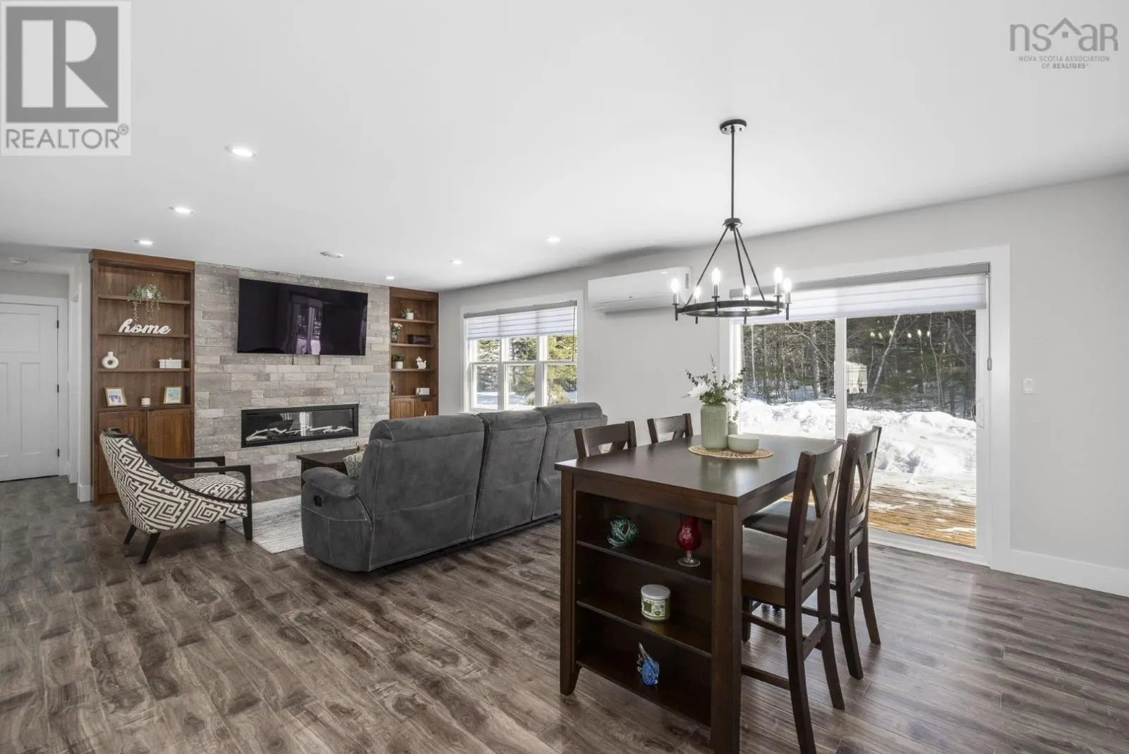 East Uniacke Road to Nature Drive, left on Loon Point Trail Enjoy peaceful country living in this almost brand new 2-bedroom, 1.5-bath bungalow. A welcoming entry leads to an open-concept living space highlighted by a stunning feature wall with walnut built-in bookshelves and a cozy electric fireplace, along with an efficient ductless heat pump. The stylish kitchen features Wi-Fi appliances, white shaker-style cabinetry, Corian countertops and backsplash, and a beautiful walnut island. The spacious primary bedroom includes a walk-in closet, while the second bedroom is well-sized and ideal for guests or a home office. The elegant 5-piece main bath offers a double vanity and luxurious soaker tub. A convenient powder room and laundry area with Wi-Fi washer and dryer are located near the garage entrance. Enjoy in-floor radiant heat throughout the main level and in the attached oversized single garage. Durable luxury vinyl tile flooring runs throughout the home. Outside, the property offers excellent curb appeal, a large level lot with room for a detached garage or extra parking, and a quiet ground-level deck off the dining area. Residents enjoy lake access for boating, swimming, and fishing, along with community trails and a beautiful natural setting of coves, islands, forests, and wildlife offering a relaxed cottage-country lifestyle within commuting distance of Halifax. (id:27476)