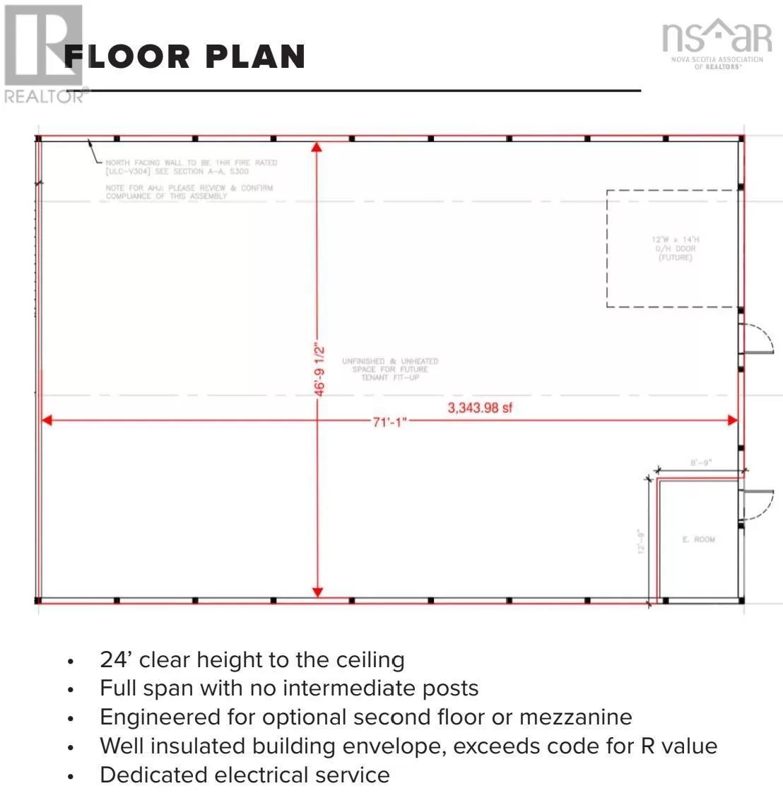 Exit 8 from Halifax - Turn Left, Left at Park Road, Right onto Enterprise Way 1 Enterprise Way, located in the Elmsdale Business Park, Nova Scotia, offers an exceptional opportunity for business owners seeking a strategic and accessible location. This newly constructed 3,343 sq. ft. warehouse features 24-foot clearance, a fully insulated building envelope exceeding code requirements, and a full-span design with no intermediate posts. Engineered for an optional second floor or mezzanine, the space also includes a dedicated electrical service to support various business needs. Conveniently positioned just 30 minutes from Halifax and minutes from the airport, Elmsdale is one of Nova Scotias fastest-growing regions. The business park offers a diverse mix of commercial and industrial spaces, attracting a wide range of businesses. With a thriving business community, ample development potential, and a commitment to supporting entrepreneurs, the Elmsdale Business Park is a prime location for businesses looking to establish or expand their presence in the province. (id:27476)