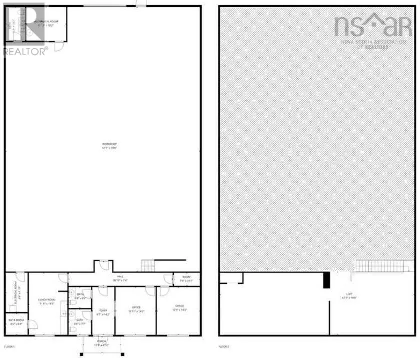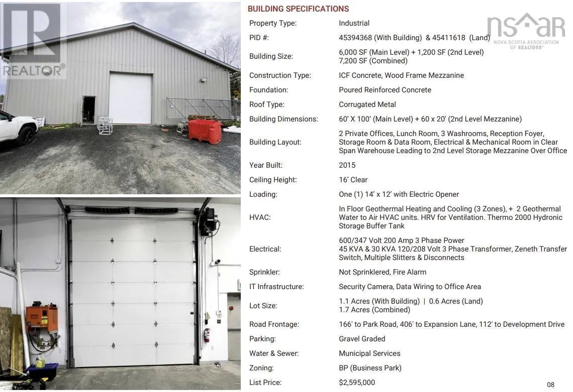 Highway 102 to Exit 8, Turn left at top of ramp, turn left onto Park Road, #293 is on the right side on the corner of Expansion Lane & Park Drive. Built in 2015, this 7,200 SF modern ICF Concrete industrial building on 1.7 Acres with frontage on 3 streets in the Elmsdale Industrial Park offers 6,000 SF(60' X 100') ground floor with clear span column spacing, plus 1,200 SF Heavy Wood Frame mezzanine(60' X 20') with office below. Features include 16' clear ceiling height, one 14' x 12' grade loading door with electronic opener, 600/347 Volt 200 Amp 3 Phase Power with 45 KVA & 30 KVA 120/208 Volt 3 Phase Transformers & Zeneth Transfer Switch, geothermal in floor heating/cooling (3 zones), additional Ducted Heat Pump units, HRV Ventilalation, reception foyer, 2 offices, 3 washrooms, data/electrical rooms, mezzanine storage, and municipal water/sewer. Rare large fenced and gated yard area suitable for 53' Tractor Trailer maneuvering. (id:27476)