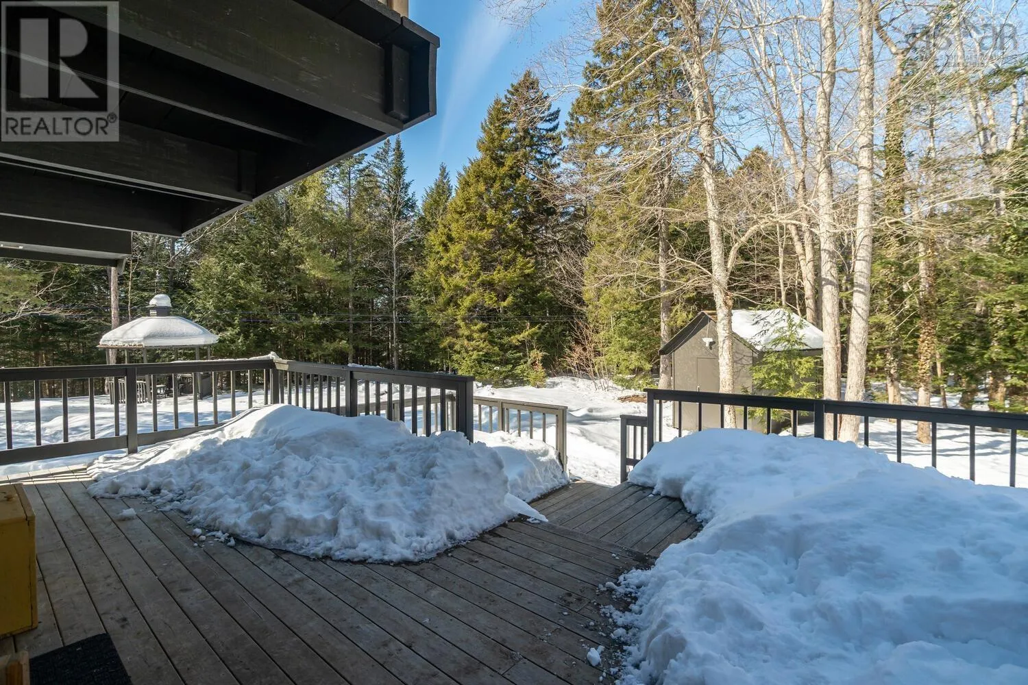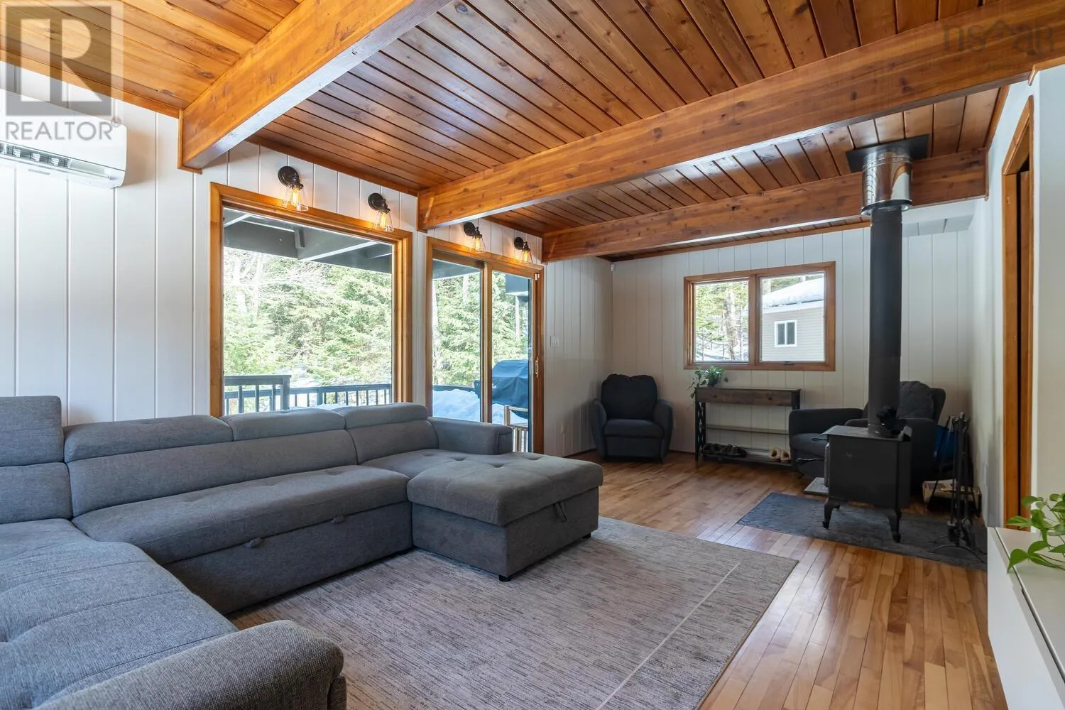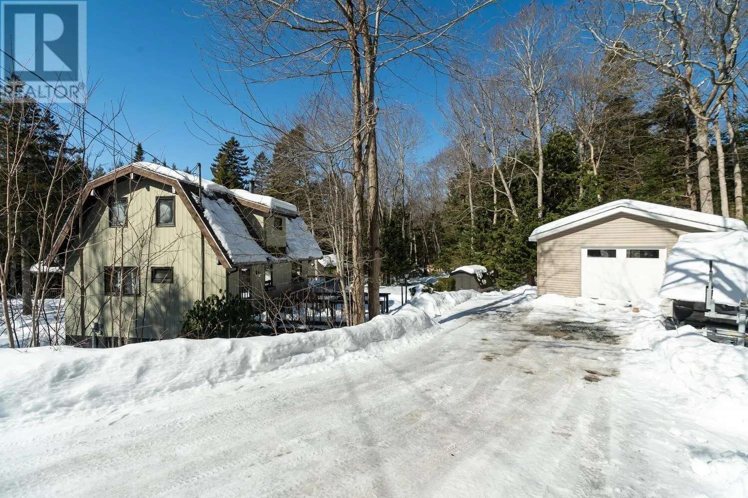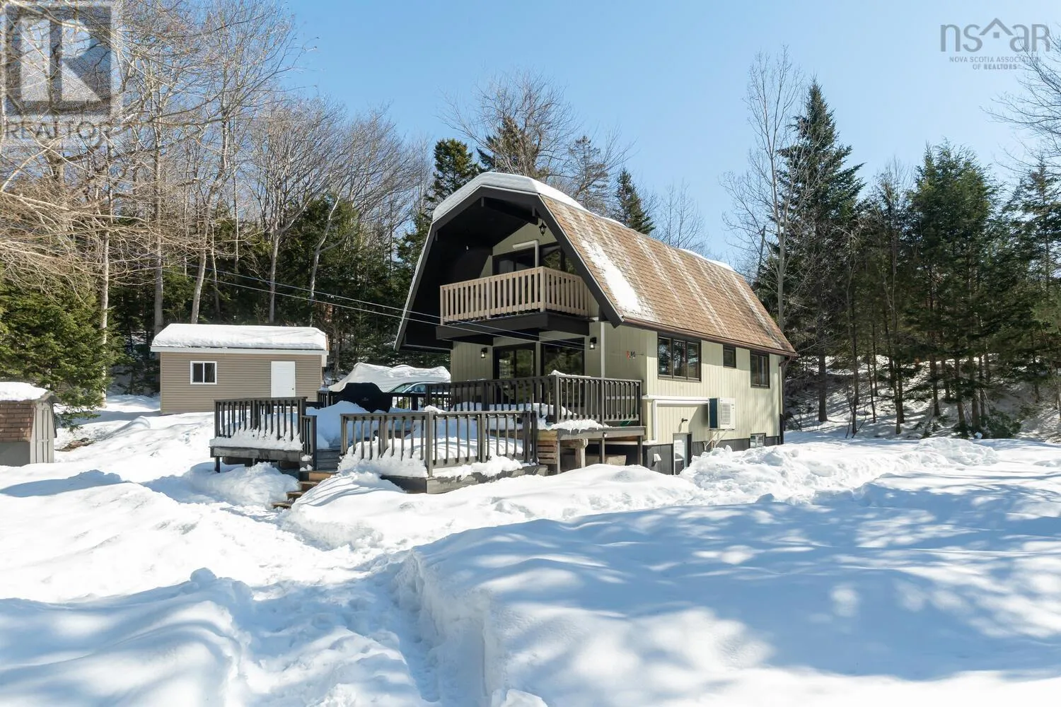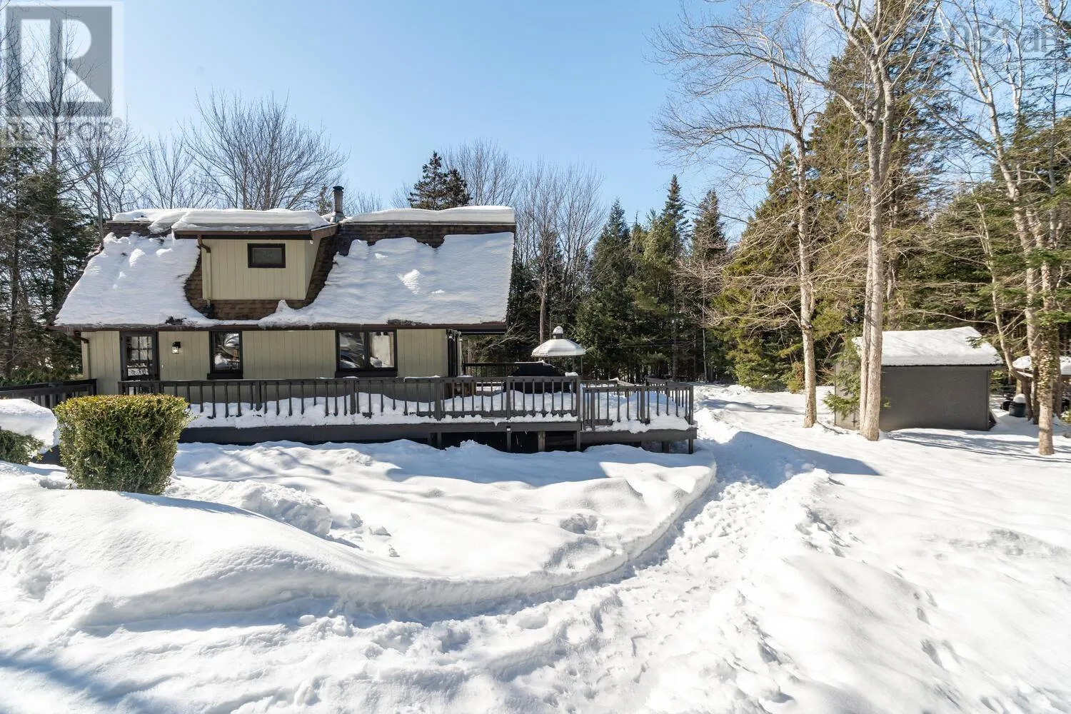 Fridge, stove, washer, dryer, dishwasher. Welcome to your private retreat! This two story chalet style home sitting sheltered amongst mature trees surrounding the home for total privacy. Step inside to find modern interior updates. The main level has a stunning new kitchen featuring new cupboards, granite countertops, a stylish backsplash, and a new sink and faucet, complemented by a newer fridge, stove and dishwasher. Both bathrooms have been updated as well. Cozy up to the wood stove on chilly nights in the living room. Separate dining room, half bath complete the main level. Two bedrooms and a full bath on the 2nd level. Enjoy total seclusion. Relax on the large two-level deck or the private balcony off the primary bedroom, which has two skylights with remote control blinds. In addition to the electric heat there are three ductless heat pumps for heating and cooling. The lower level has a large rec-room and bedroom, laundry utility area and a walk-out entrance. The seller is also offering a $3,000 basement flooring allowance to finish the flooring in the rec-room and bedroom to your taste. New Septic system in 2021. Minutes from Laurie, Oakfield Provincial Parks and HRM's Shubie Park, to enjoy, walks, swimming, boating, or picnic areas. The new highway connects to Exit 5A of Highway 102 a new Aerotech Connector ensures a safer, more efficient commute of just minutes to the airport. A hobbyists dream! The brand-new 20x20 finished detached garage comes equipped with its own electrical panel and a pellet stove for year-round projects. A quick closing is possible. A virtual tour will be available tomorrow. Book your private viewing today. (id:27476)