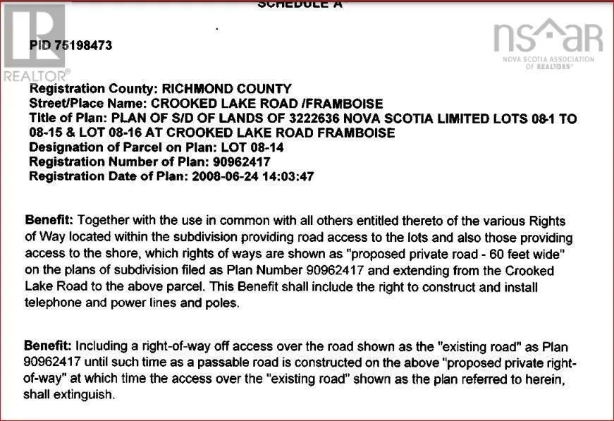 From the Fleur-de-lis Trail, turn onto Crooked Lake Rd, travel to the end until you arrive at the beach, walk along the beach and look for the sign. Using Google Maps - Latitude/Longitude 45.700268°, -60.335473° Oceanfront Property Lot 08-14 Crooked Lake Rd, Framboise This breathtaking 7.4-acre parcel of oceanfront land offers a rare opportunity to own a piece of Cape Bretons stunning coastline. Located on Crooked Lake Road in the quiet, scenic community of Framboise, the property opens onto the wide sandy shoreline of Morrison Beach - also known as Framboise Beach. Whether youre seeking a peaceful retreat, seasonal getaway, or long-term investment, this coastal property offers incredible potential in an unspoiled natural setting. The land is part of an approved subdivision plan and is land registered, with a Nova Scotia Environment assessment confirming its suitability for an on-site sewage system (permit required). The property is off-grid, ideal for solar solutions, and features a gradual incline from the ocean side with elevations from approximately 7 metres near the shore to about 21 metres above sea level (Google Earth reference in listing photos). Access is available from the existing private road that reaches the back corner of the lot, with deeded rights extending through Lot 08-16 for future road construction, should further development proceed. The beachfront itself is Crown land, offering miles of sandy beach for public enjoyment. Morrison Beach is one of Cape Bretons hidden treasures - quiet, serene, and naturally beautiful. Enjoy morning walks, campfires by the shore, and the soothing rhythm of the waves. With ample space and an unbeatable coastal setting near both ocean and lake, this property is truly one of a kind. Full listing details and drone footage available on Realtor.ca MLS® 202420999. (id:27476)
