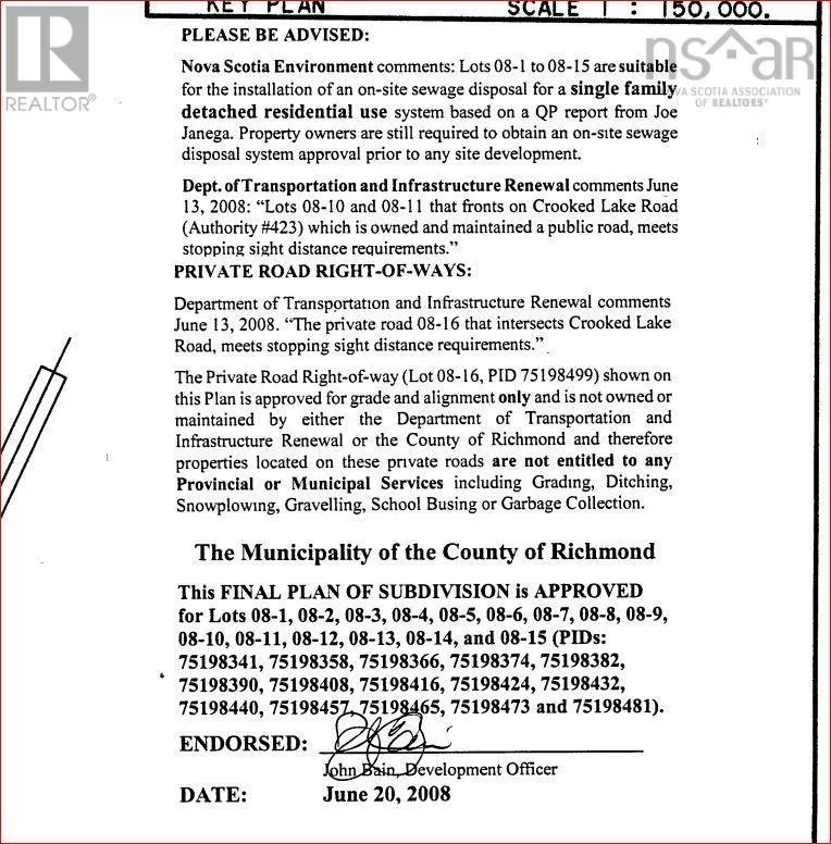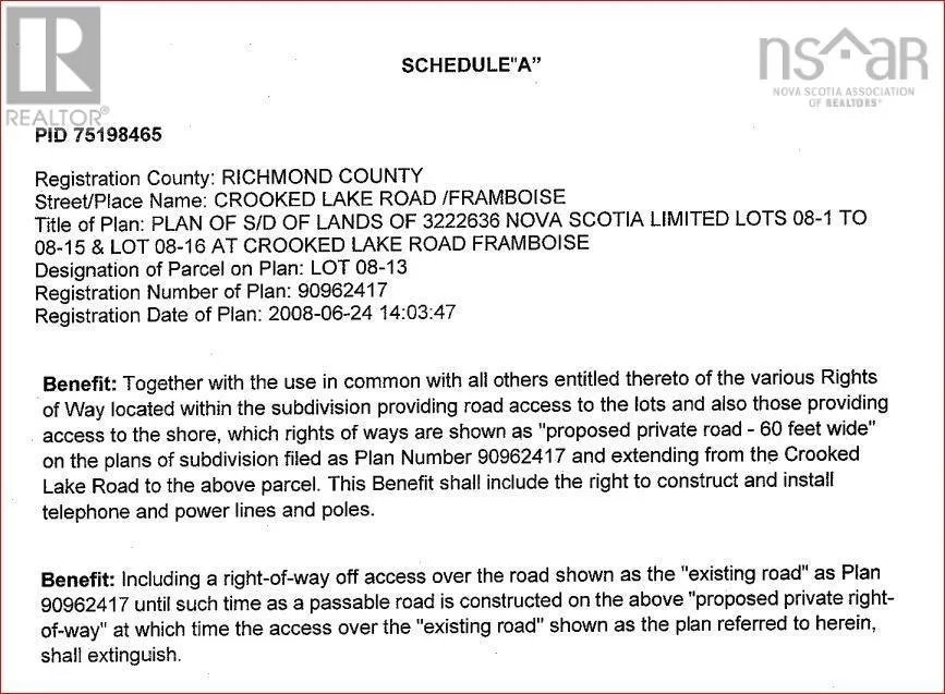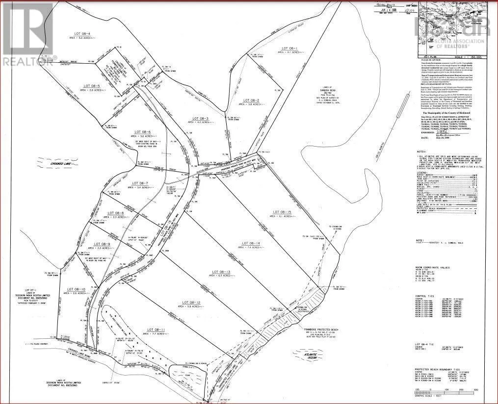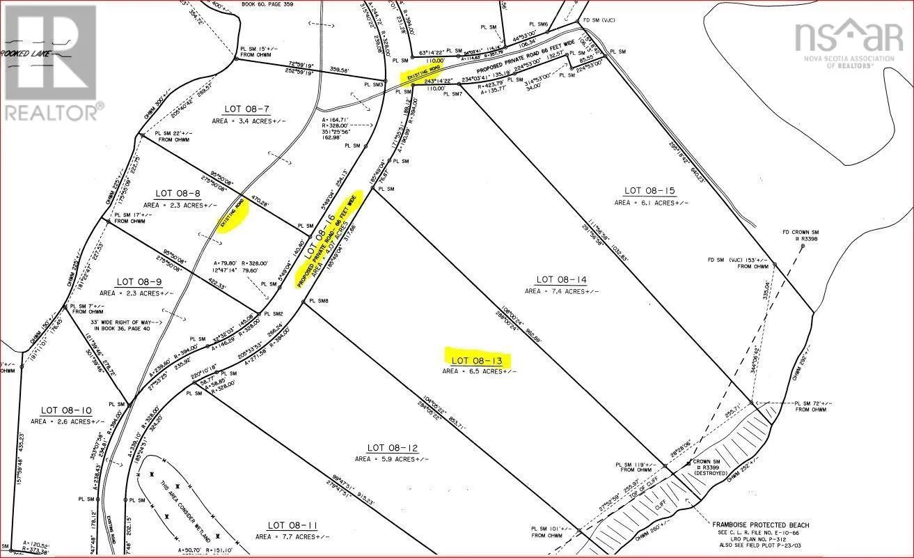 From the Fleur-de-lis Trail, turn onto Crooked Lake Rd, travel to the end until you arrive at the beach, walk along the beach and look for the signs. Oceanfront Property! Lot 08-13 Crooked Lake Rd (Framboise). This stunning 6.5-acre parcel opens onto the picturesque sandy Morrison (Framboise) Beach/Trail. Enjoy morning walks on the beach, breathe in the crisp ocean air, and be mesmerized by the soothing sound of the surf. The property is land registered, with a Nova Scotia Environment assessment confirming it is suitable for an on-site sewage system (permit required). A land survey is available in the viewing documents. The owner will have deeded rights to the Private Road Right-of-Way (Lot 08-16) shown on the survey (not yet built). This plan has approval for grade and alignment but is not owned or maintained by provincial or municipal services. Access to the property is easiest from the beachfront. (id:27476)