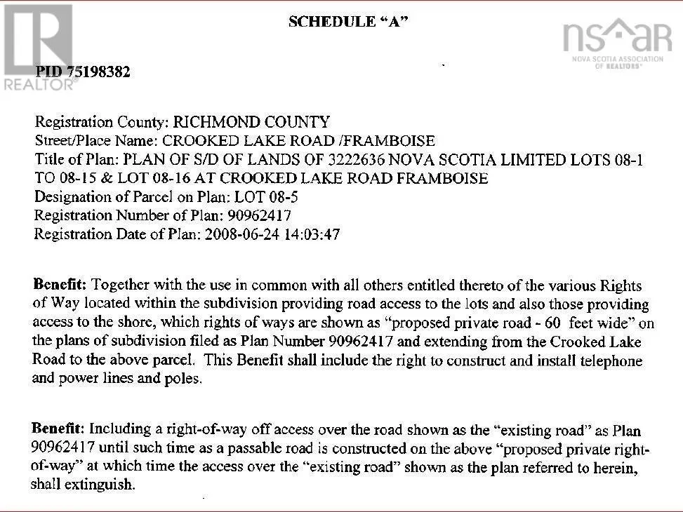 Drive to Crooked Lake Rd in Framboise, drive towards the very end, before the end there is a left turn to Cemetary Rd, drive that until the very end, the property is on the left. Located off Crooked Lake Rd in Framboise, Cape Breton, NS, this 2.9-acre property offers a stunning off-grid retreat with breathtaking views and direct access to Crooked Lake. Perfect for outdoor enthusiasts, it provides 612 feet of lakefront, ideal for activities like fishing, ATV riding, canoeing, and kayaking. The serene setting invites you to embrace outdoor living, while nearby, the iconic Morrison/Framboise Beach offers a scenic sandy beach trail, perfect for leisurely strolls. This property is an exceptional location for those seeking tranquility and adventure in nature. (Drone footage available on Realtor.ca) *MLS® Number: 202500266 Richmond County - Highland Region (id:27476)