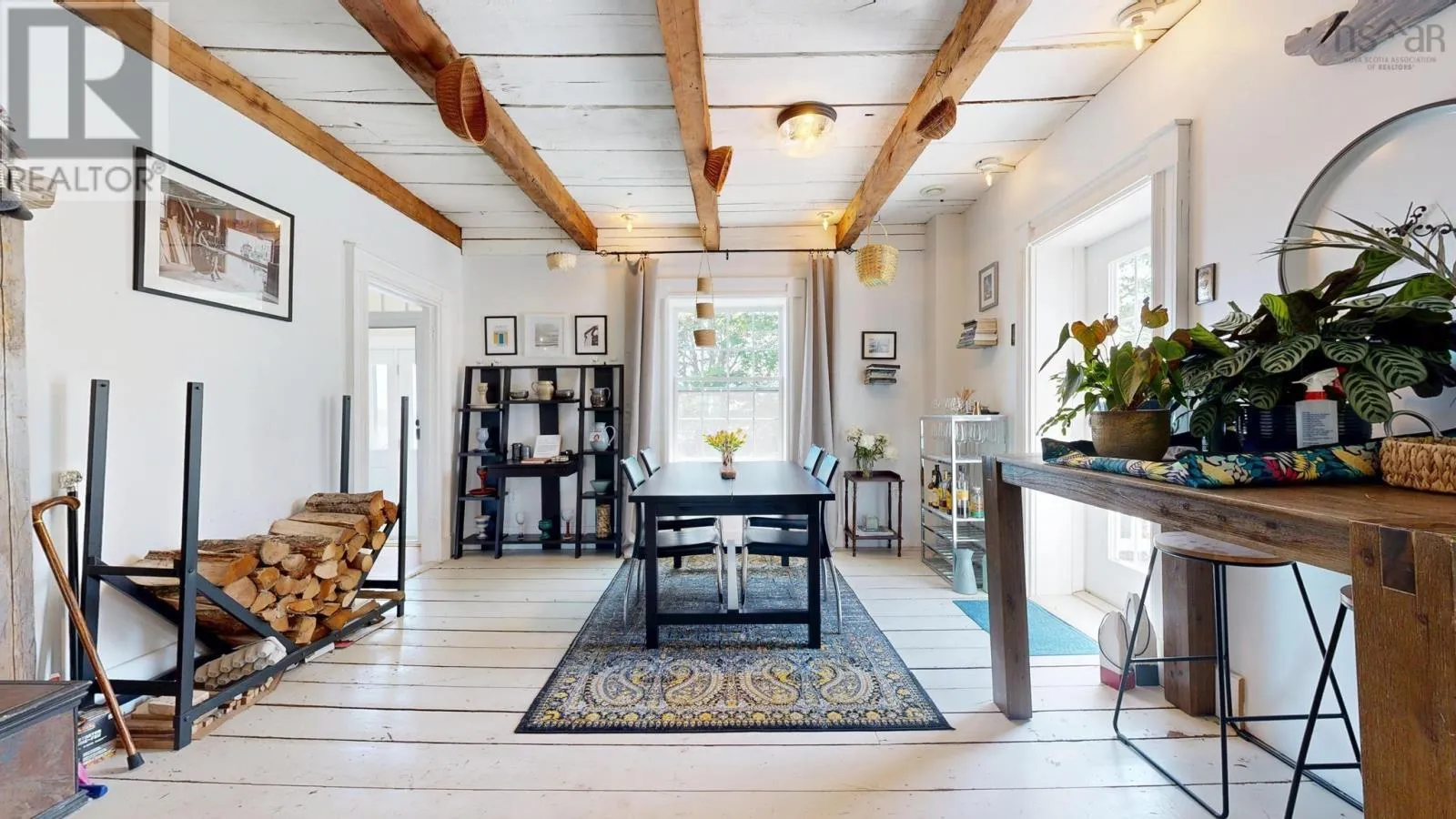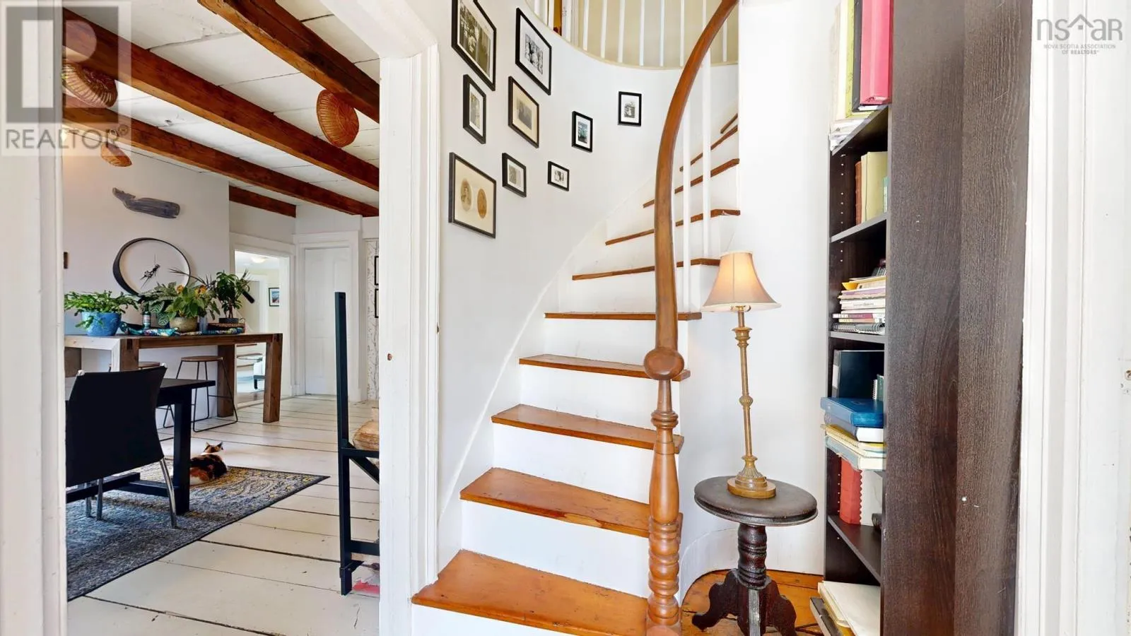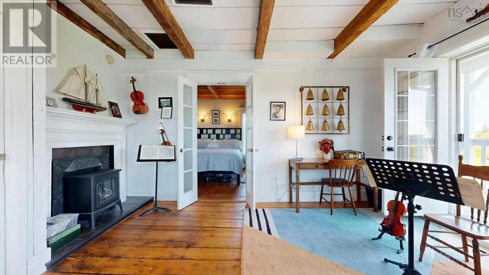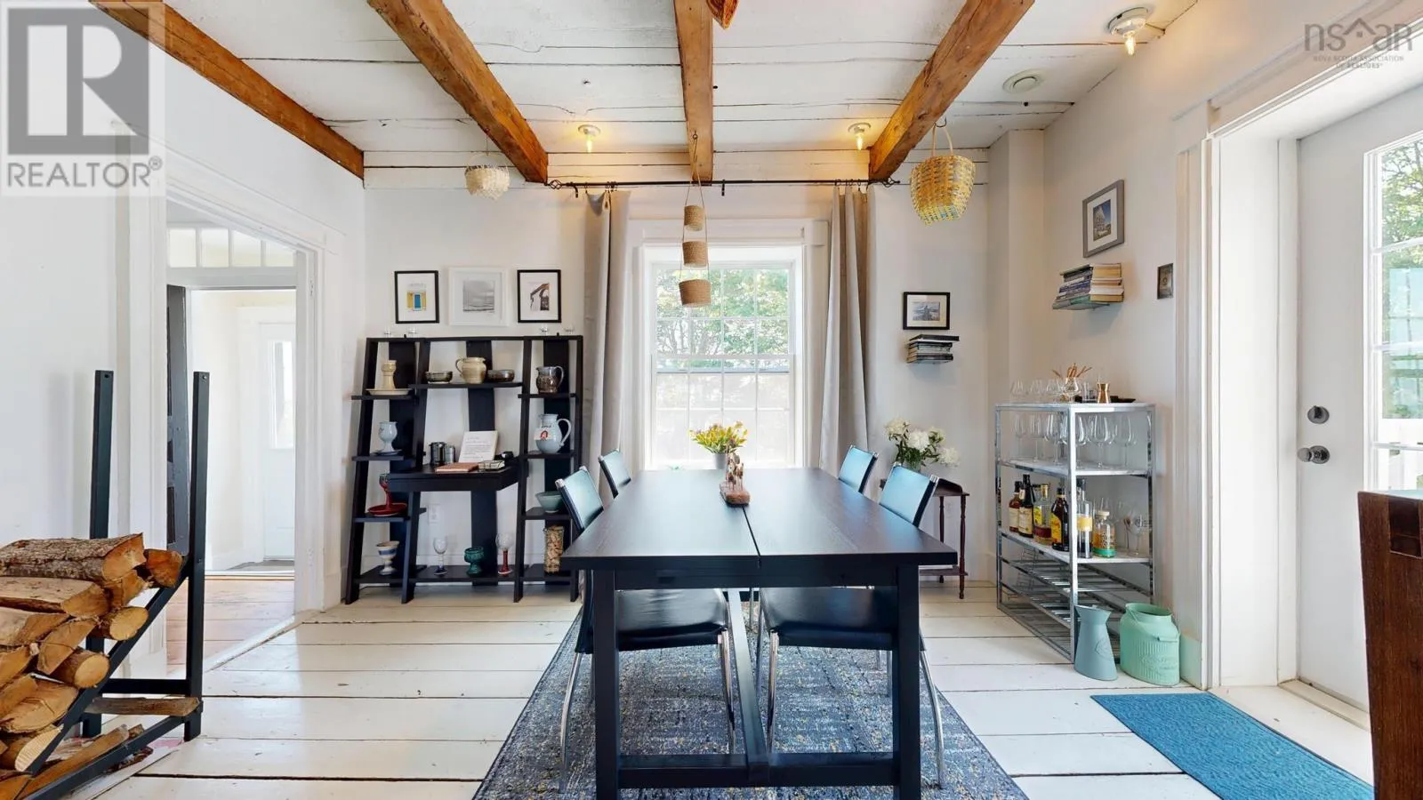 From Lunenburg head towards Blue Rocks Road - House on the left. This beautiful home boasts a rare combination of historic features and modern amenities. Preserved features include random width, wide plank hardwood floors and exposed beams. A painstaking 5-year top-to-bottom restoration was completed in 2012. Features of modern living include 400 amp electric, a multi-zoned, hot water radiant heating system with thermostats in all rooms, all new plumbing, new windows and insulation, metal roof, and full walkout basement with concrete floors and radiant heat. All appliances were purchased in 2021. A new septic field on the east side of property was installed in Spring 2024. The interior of this 260-year-old farmhouse is flooded with brilliant natural light thanks to its perfect southerly aspect elevated above the road and facing the Atlantic Ocean across tidal marshes. Windows on all sides ensure summer breezes and plenty of sunshine. Enjoy the main living area with master bedroom and recently renovated ensuite tucked privately into the back corner of the house. Next to the primary bedroom, there is a large room with French doors opening to a side deck and gardens, currently used as a music room, but with endless possibilities. Primary bath renovated in 2024 new walk-in shower, vanity with pure white marble top. New electric heater was installed Feb 2025 (first floor and basement have in-floor radiant heat and second floor has baseboard heat) to preserve the beautiful, beamed ceilings. There are three outbuildings on this property - Shed and greenhouse in South corner, with new floor in greenhouse in 2024. The main floor also boasts a pretty country kitchen open to a large dining area with wood-burning fireplace. Adjoining is a sunny living room and a handy main floor laundry room with half bath and closet. A unique feature about this great home is the "Heritage Wall", an exposed section of the original exterior wall in the living room showing builders markings and a shadow box with information about its construction. (id:27476)
