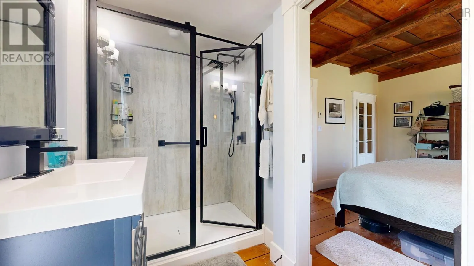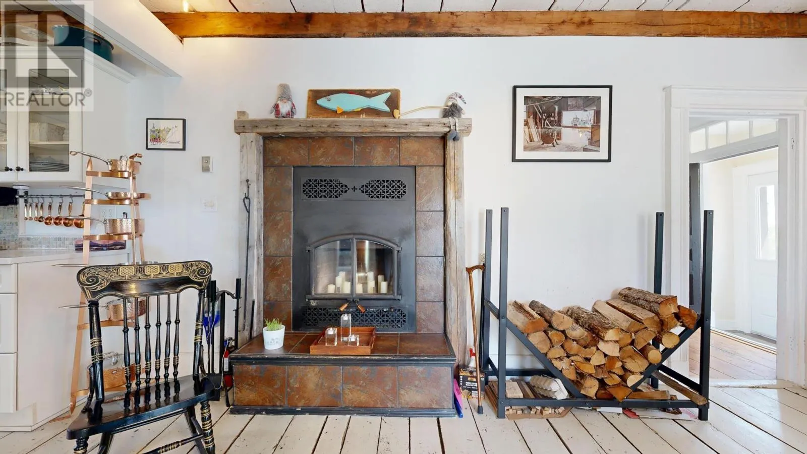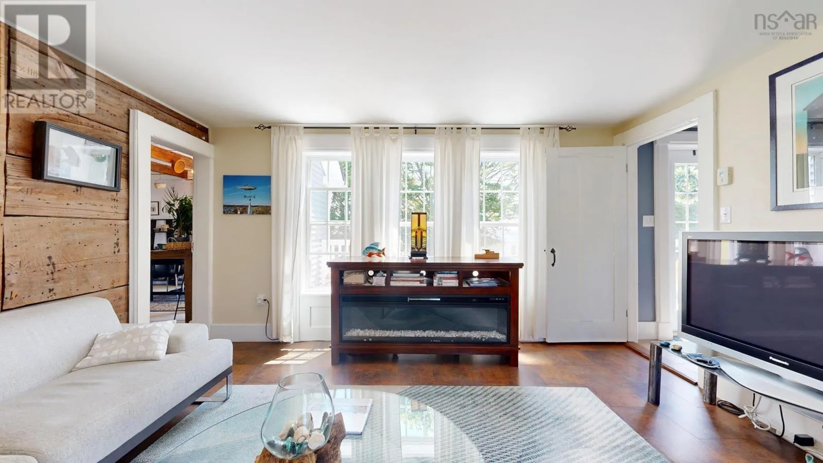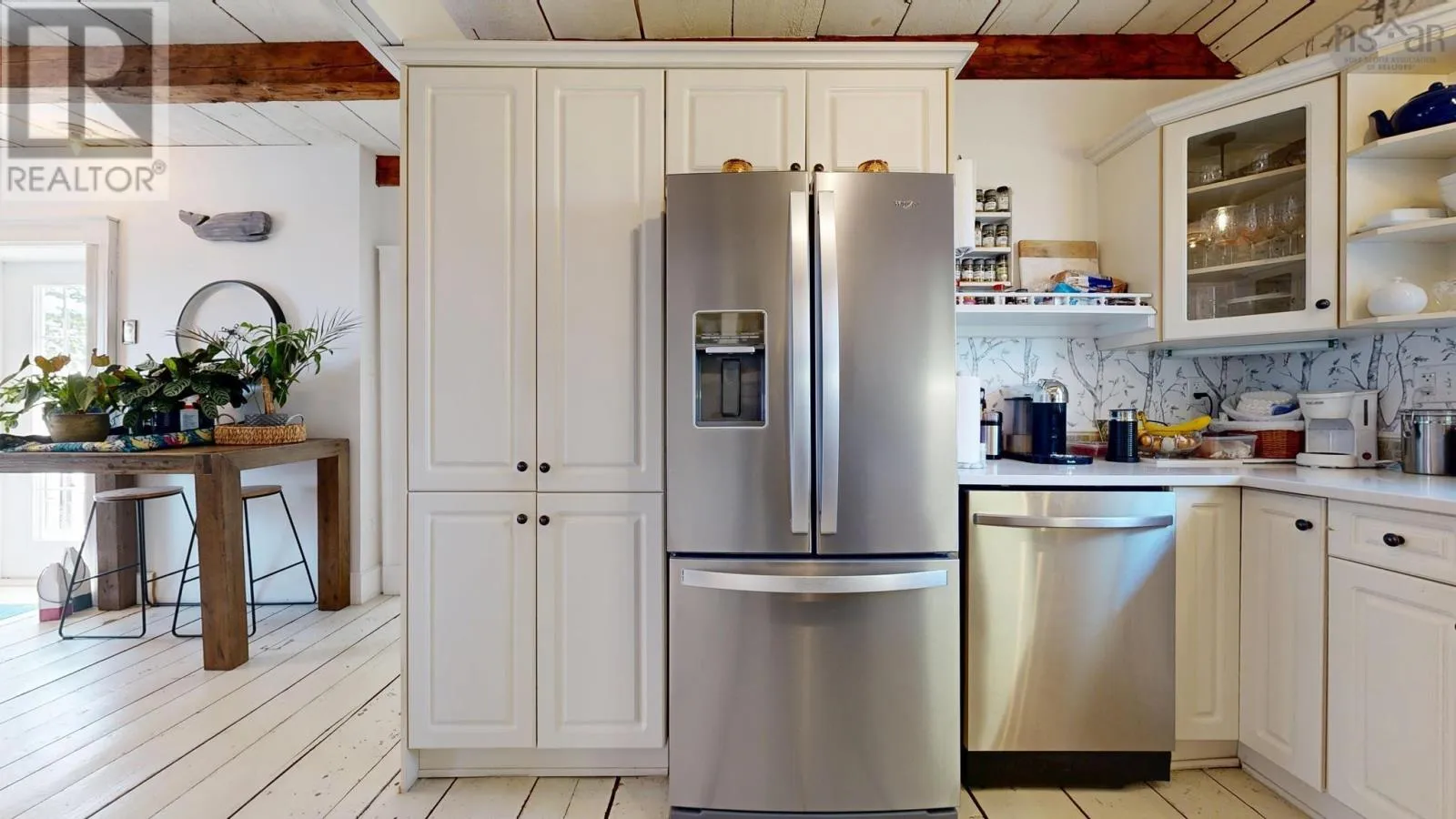 From Lunenburg head towards Blue Rocks Road - House on the left. This beautiful home boasts a rare combination of historic features and modern amenities. Preserved features include random width, wide plank hardwood floors and exposed beams. A painstaking 5-year top-to-bottom restoration was completed in 2012. Features of modern living include 400 amp electric, a multi-zoned, hot water radiant heating system with thermostats in all rooms, all new plumbing, new windows and insulation, metal roof, and full walkout basement with concrete floors and radiant heat. All appliances were purchased in 2021. A new septic field on the east side of property was installed in Spring 2024. The interior of this 260-year-old farmhouse is flooded with brilliant natural light thanks to its perfect southerly aspect elevated above the road and facing the Atlantic Ocean across tidal marshes. Windows on all sides ensure summer breezes and plenty of sunshine. Enjoy the main living area with master bedroom and recently renovated ensuite tucked privately into the back corner of the house. Next to the primary bedroom, there is a large room with French doors opening to a side deck and gardens, currently used as a music room, but with endless possibilities. Primary bath renovated in 2024 new walk-in shower, vanity with pure white marble top. New electric heater was installed Feb 2025 (first floor and basement have in-floor radiant heat and second floor has baseboard heat) to preserve the beautiful, beamed ceilings. There are three outbuildings on this property - Shed and greenhouse in South corner, with new floor in greenhouse in 2024. The main floor also boasts a pretty country kitchen open to a large dining area with wood-burning fireplace. Adjoining is a sunny living room and a handy main floor laundry room with half bath and closet. A unique feature about this great home is the "Heritage Wall", an exposed section of the original exterior wall in the living room showing builders markings and a shadow box with information about its construction. (id:27476)