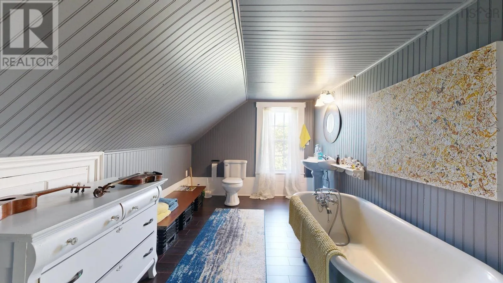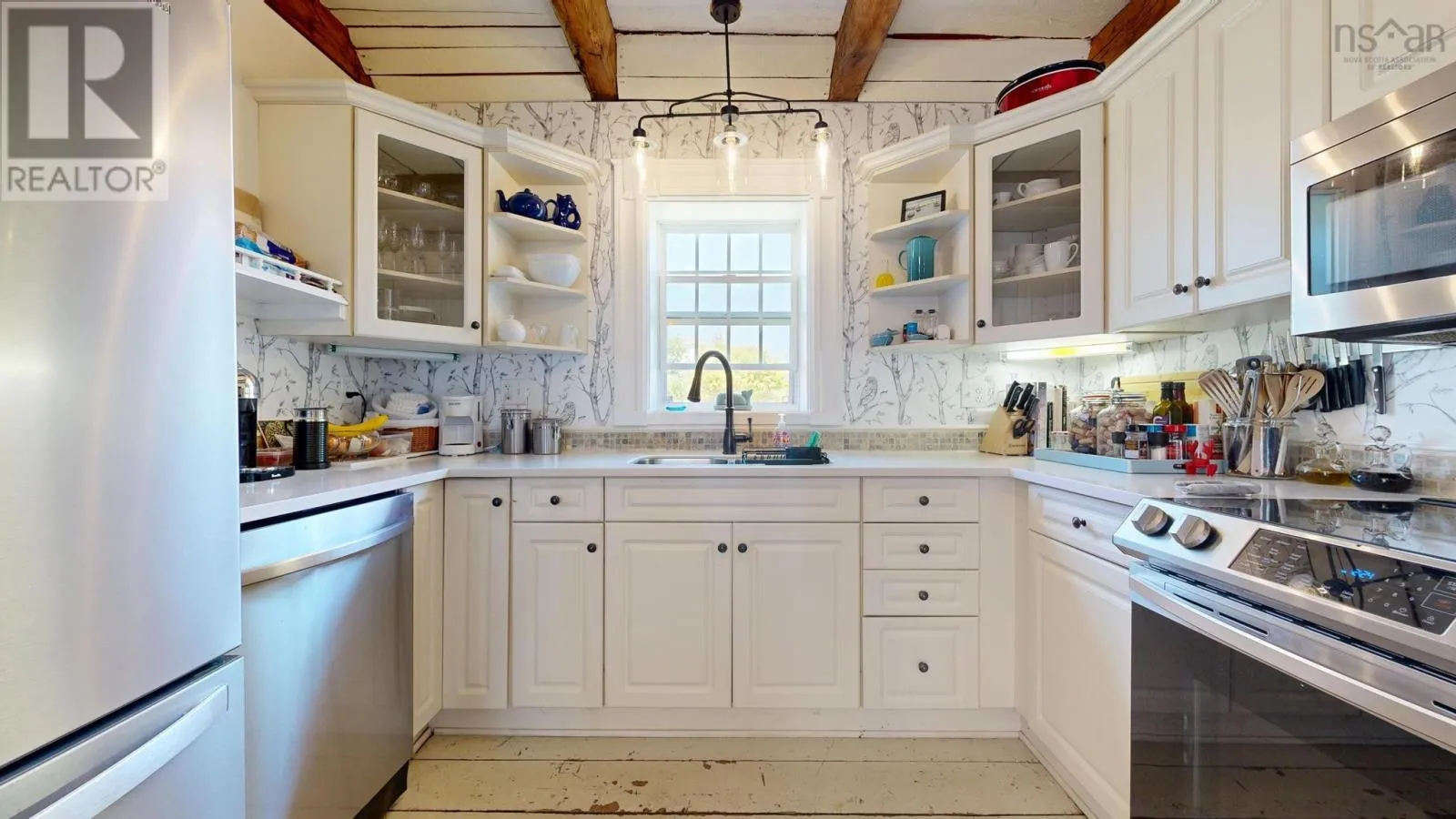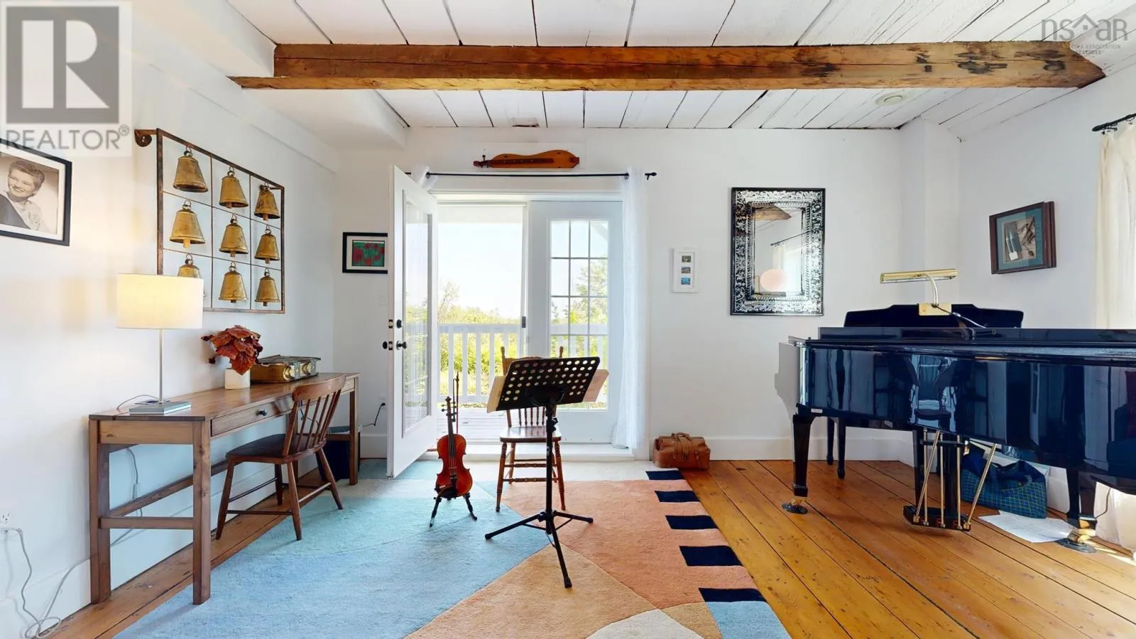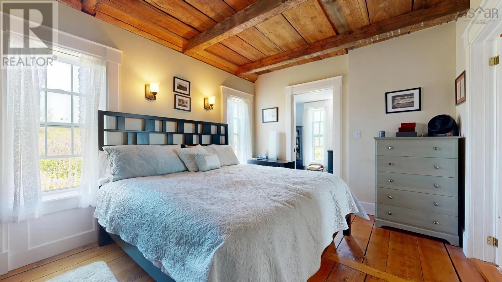 From Lunenburg head towards Blue Rocks Road - House on the left. This beautiful home boasts a rare combination of historic features and modern amenities. Preserved features include random width, wide plank hardwood floors and exposed beams. A painstaking 5-year top-to-bottom restoration was completed in 2012. Features of modern living include 400 amp electric, a multi-zoned, hot water radiant heating system with thermostats in all rooms, all new plumbing, new windows and insulation, metal roof, and full walkout basement with concrete floors and radiant heat. All appliances were purchased in 2021. A new septic field on the east side of property was installed in Spring 2024. The interior of this 260-year-old farmhouse is flooded with brilliant natural light thanks to its perfect southerly aspect elevated above the road and facing the Atlantic Ocean across tidal marshes. Windows on all sides ensure summer breezes and plenty of sunshine. Enjoy the main living area with master bedroom and recently renovated ensuite tucked privately into the back corner of the house. Next to the primary bedroom, there is a large room with French doors opening to a side deck and gardens, currently used as a music room, but with endless possibilities. Primary bath renovated in 2024 new walk-in shower, vanity with pure white marble top. New electric heater was installed Feb 2025 (first floor and basement have in-floor radiant heat and second floor has baseboard heat) to preserve the beautiful, beamed ceilings. There are three outbuildings on this property - Shed and greenhouse in South corner, with new floor in greenhouse in 2024. The main floor also boasts a pretty country kitchen open to a large dining area with wood-burning fireplace. Adjoining is a sunny living room and a handy main floor laundry room with half bath and closet. A unique feature about this great home is the "Heritage Wall", an exposed section of the original exterior wall in the living room showing builders markings and a shadow box with information about its construction. (id:27476)
