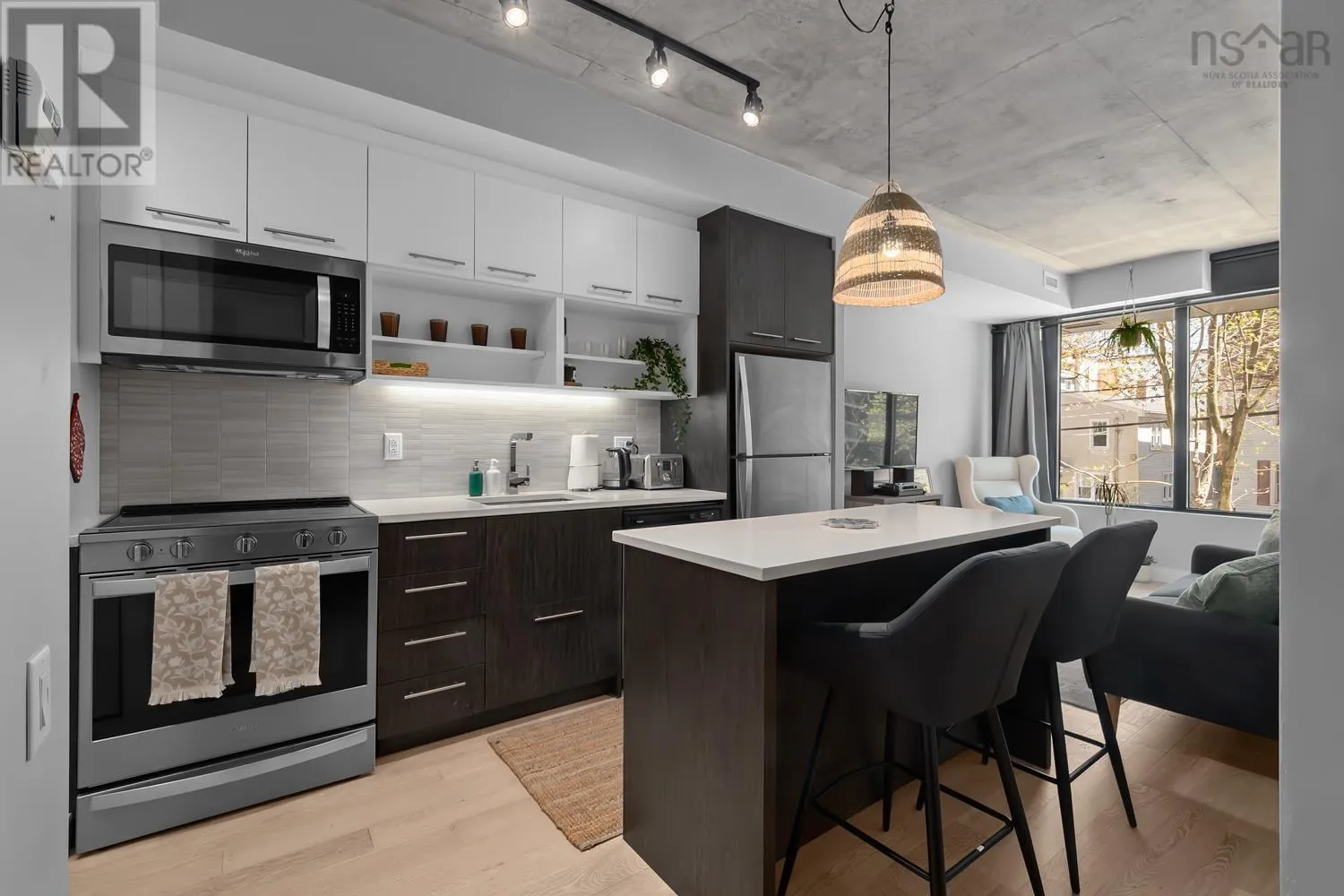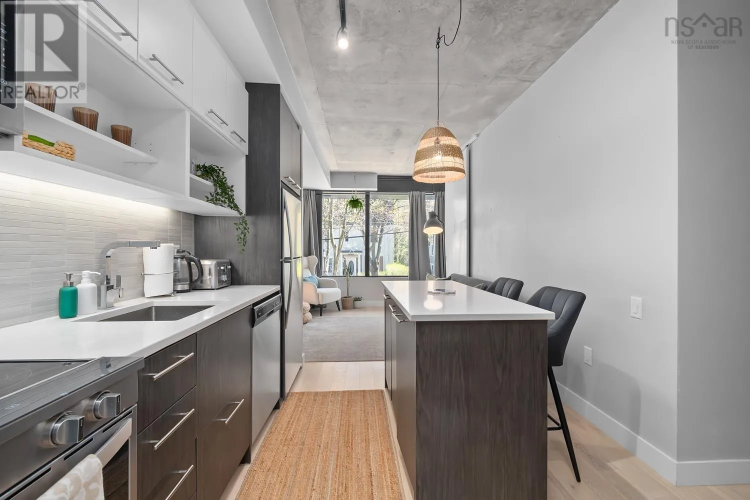 Inglis St to Wellington St, or South St to Wellington St. Step into stylish South End living at Gorsebrook Park. This one-bedroom plus den condo blends smart design with urban convenience, just steps from universities, hospitals, shops, and nightlife. The kitchen features quartz counters, stainless appliances, a tiled backsplash, and a functional island with extra storage. Expansive windows fill the space with natural light, while the den doubles as a home office with custom built-in storage. Perfect for working from home. Beyond your door, enjoy resort-style amenities including a heated pool, professional gym, firepit terrace, and lounge all in one of Halifax's most desirable addresses. Whether you're looking for a turnkey home or a high-demand rental opportunity, this condo delivers both lifestyle and value. (id:27476)