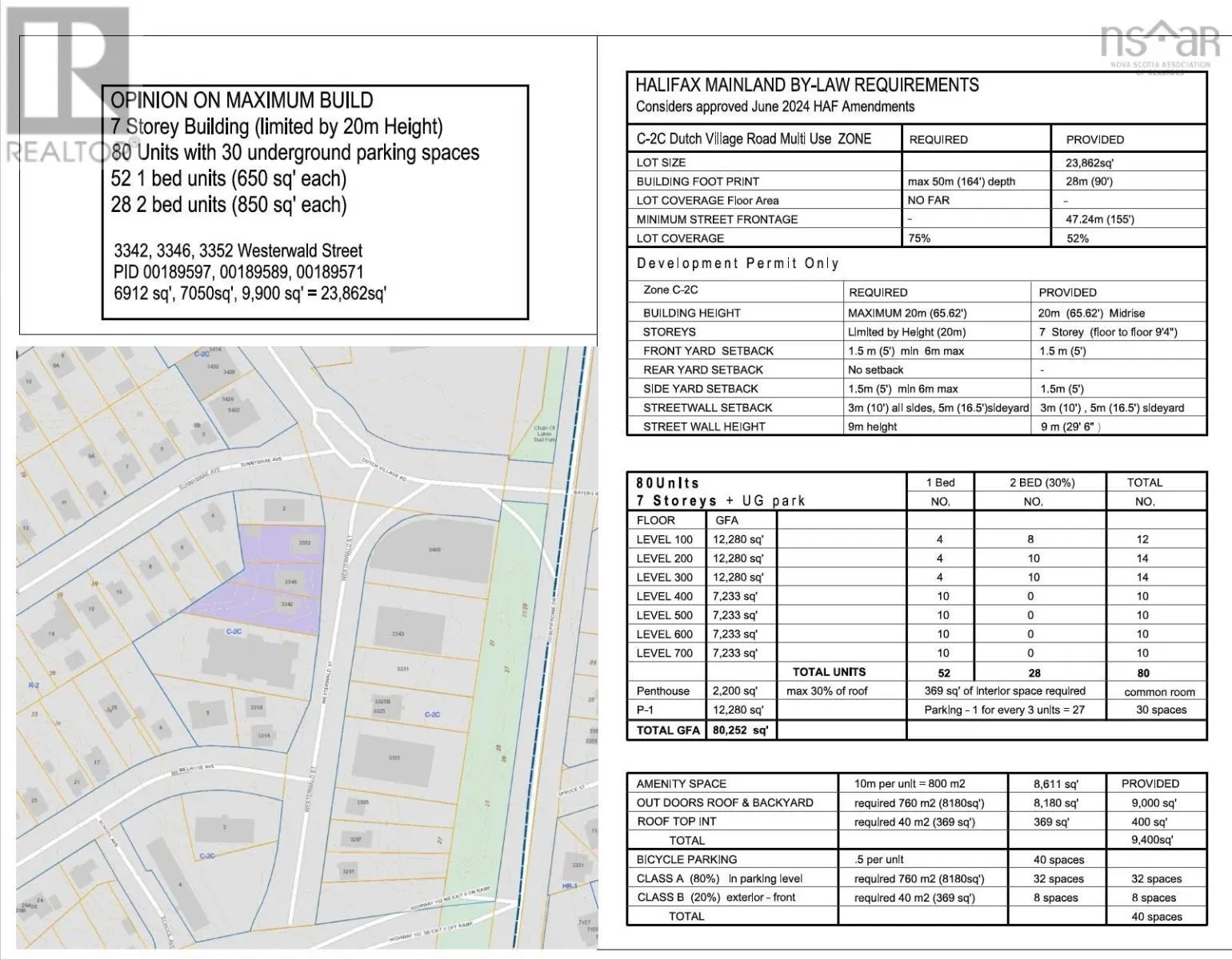 Dutch Village Road to Westerwald Street Well-kept single-family home on a 7,900 sq. ft. lot in Halifaxs Fairview area, just off Dutch Village Road and minutes to downtown. This 3-bedroom residence features bright living areas, hardwood floors, an efficient kitchen, and a private yardperfect as a rental or comfortable home while planning redevelopment. 3352 is one of three parcels (with 3342 & 3346 Westerwald) forming a 23,862 sq. ft. site under C-2C zoning, positioned on a quiet street with fast access to Hwy 102, Joseph Howe Drive and the MacKay Bridge. A professional capacity study confirms the potential for an 80-unit, 80,252 sq. ft. building across the assembled lands, with 52 one-bed and 28 two-bed layouts, underground parking and optional commercial spaceall designed within current zoning and code. Listed individually to demonstrate rentability and holding strength, 3352 will be conveyed as part of the full package priced at $4,375,000 (approx. $183.50 per sq. ft. of land and $54.50 per buildable sq. ft.). The Westerwald corridor benefits from Dutch Village Roads revitalizationupgraded streetscapes, active-transportation links and new retail investmentsupporting strong rental and condo demand. Whether held as an income property or integrated into future construction, 3352 Westerwald offers immediate cash flow and clear upside as part of one of Halifaxs most attractive medium-density opportunities. (id:27476)